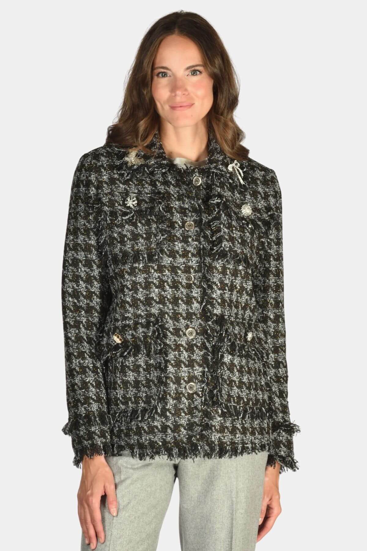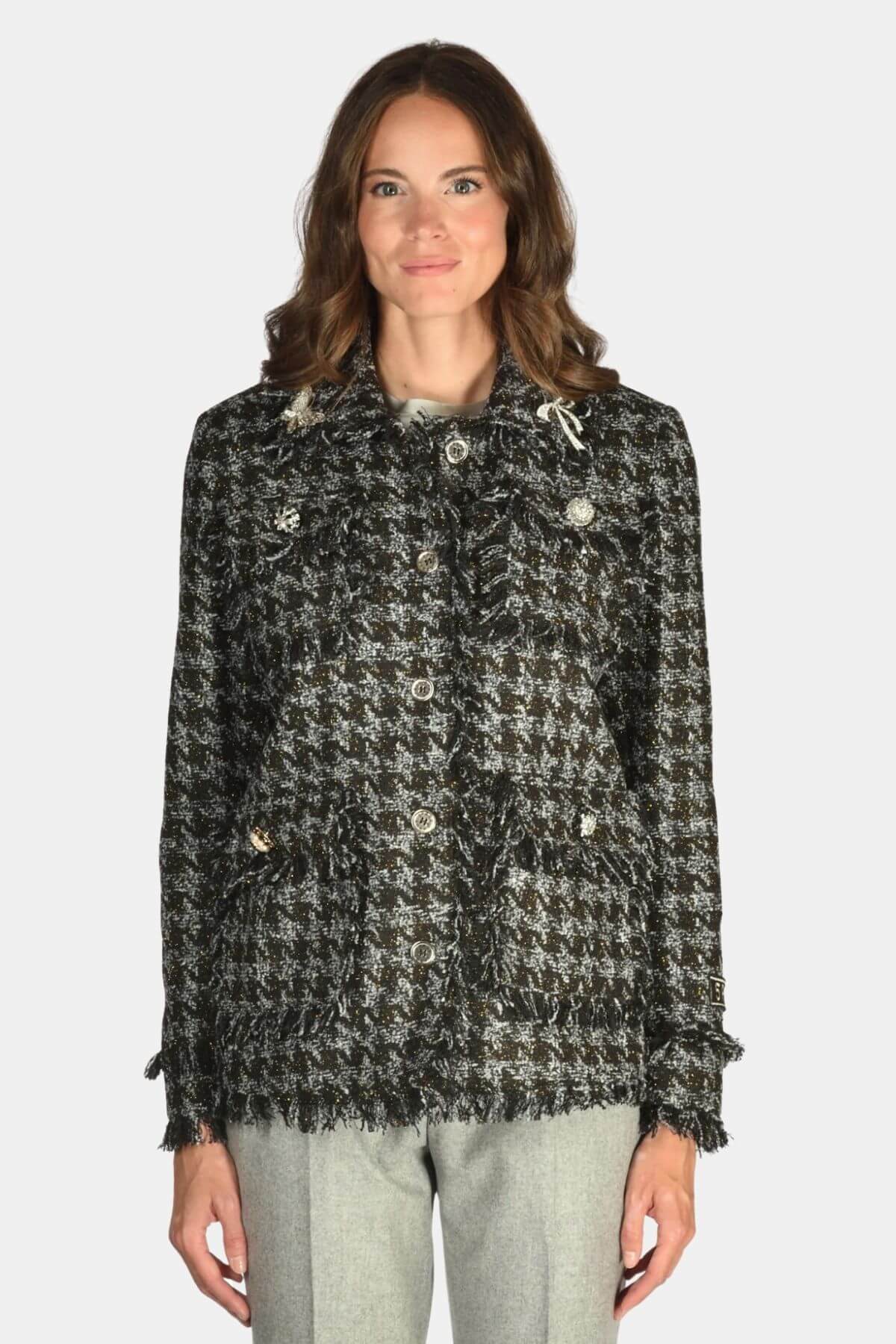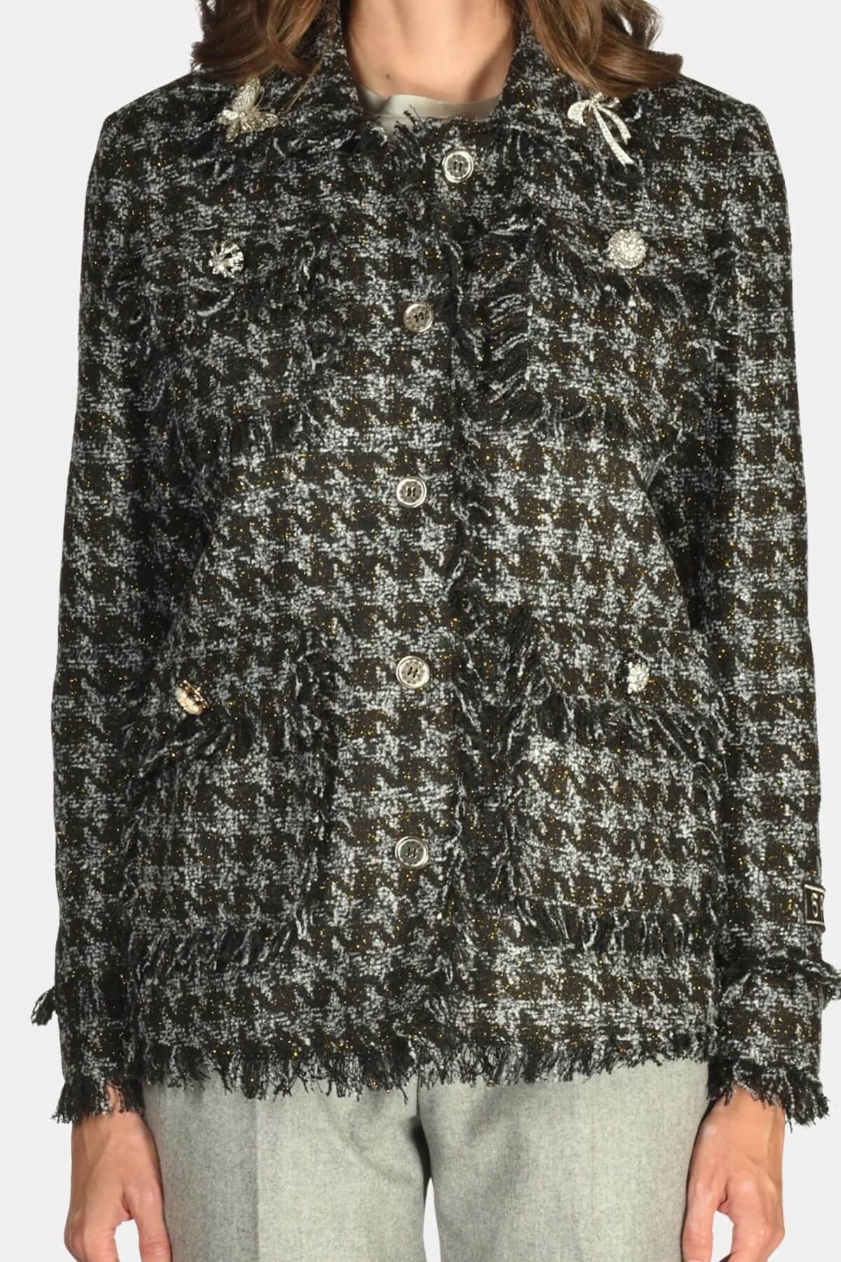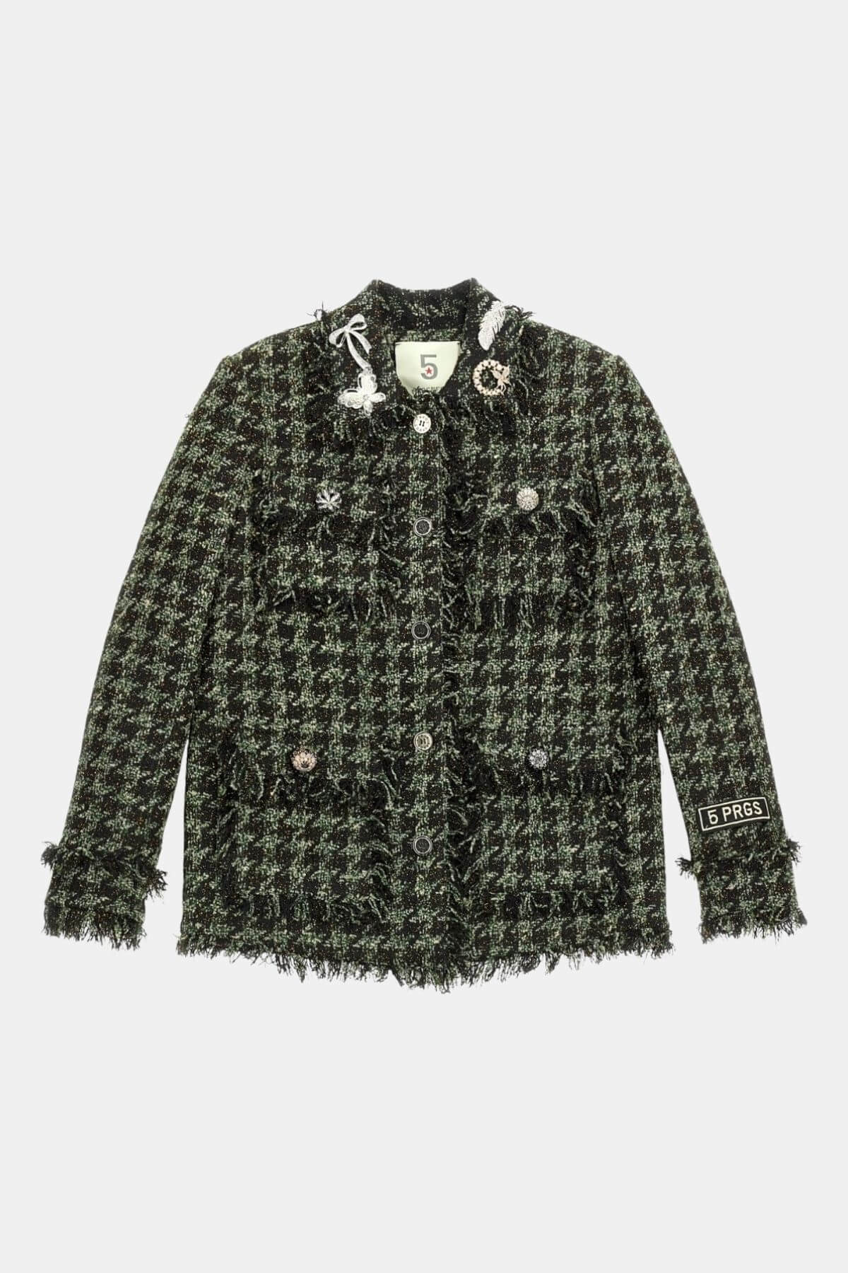 This tweed jacket from 5 Progress reimagines the classic silhouette with playful edge. Adorned with eclectic pins, frayed trims, and patch details, it fuses Parisian chic with punk attitude.