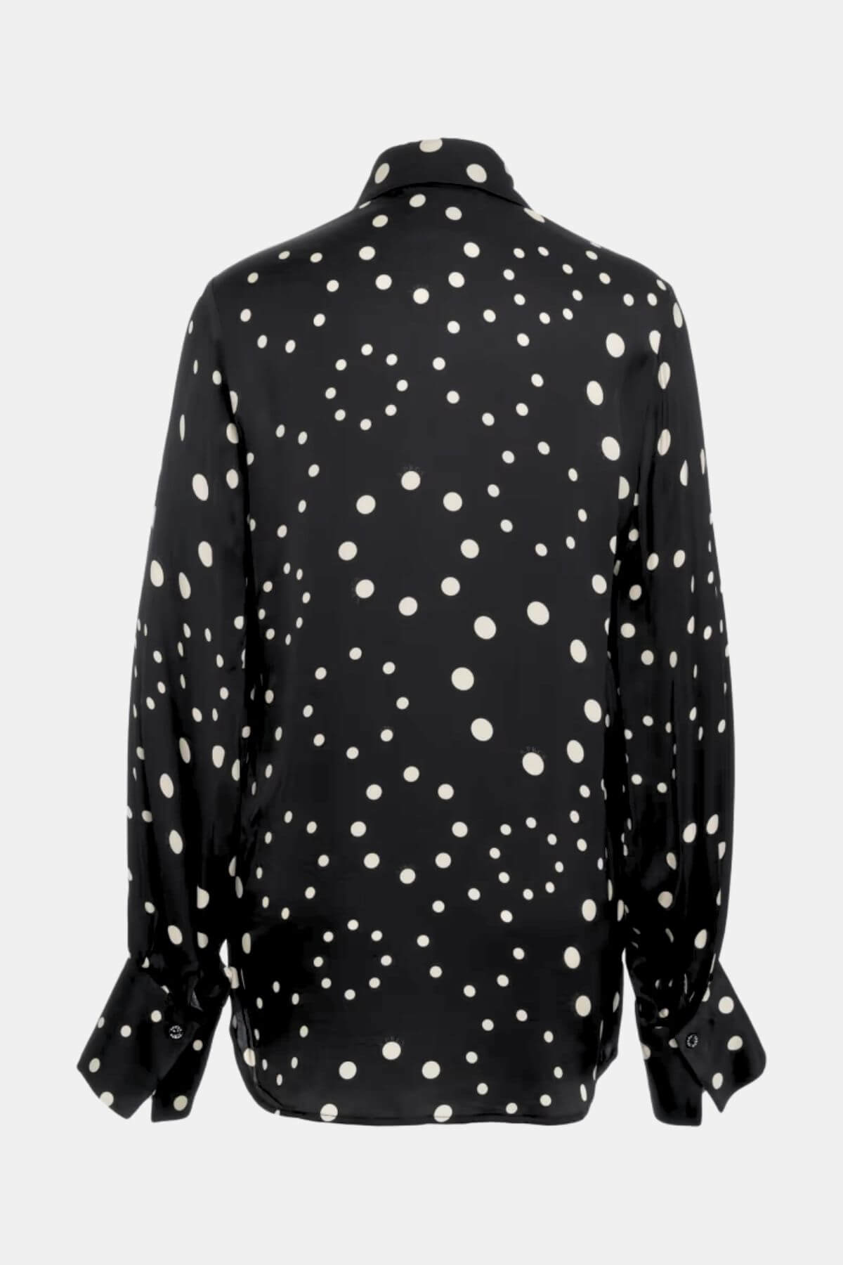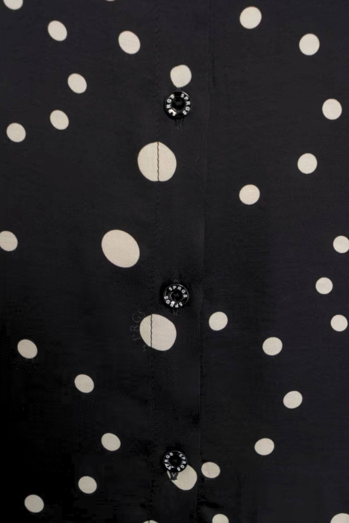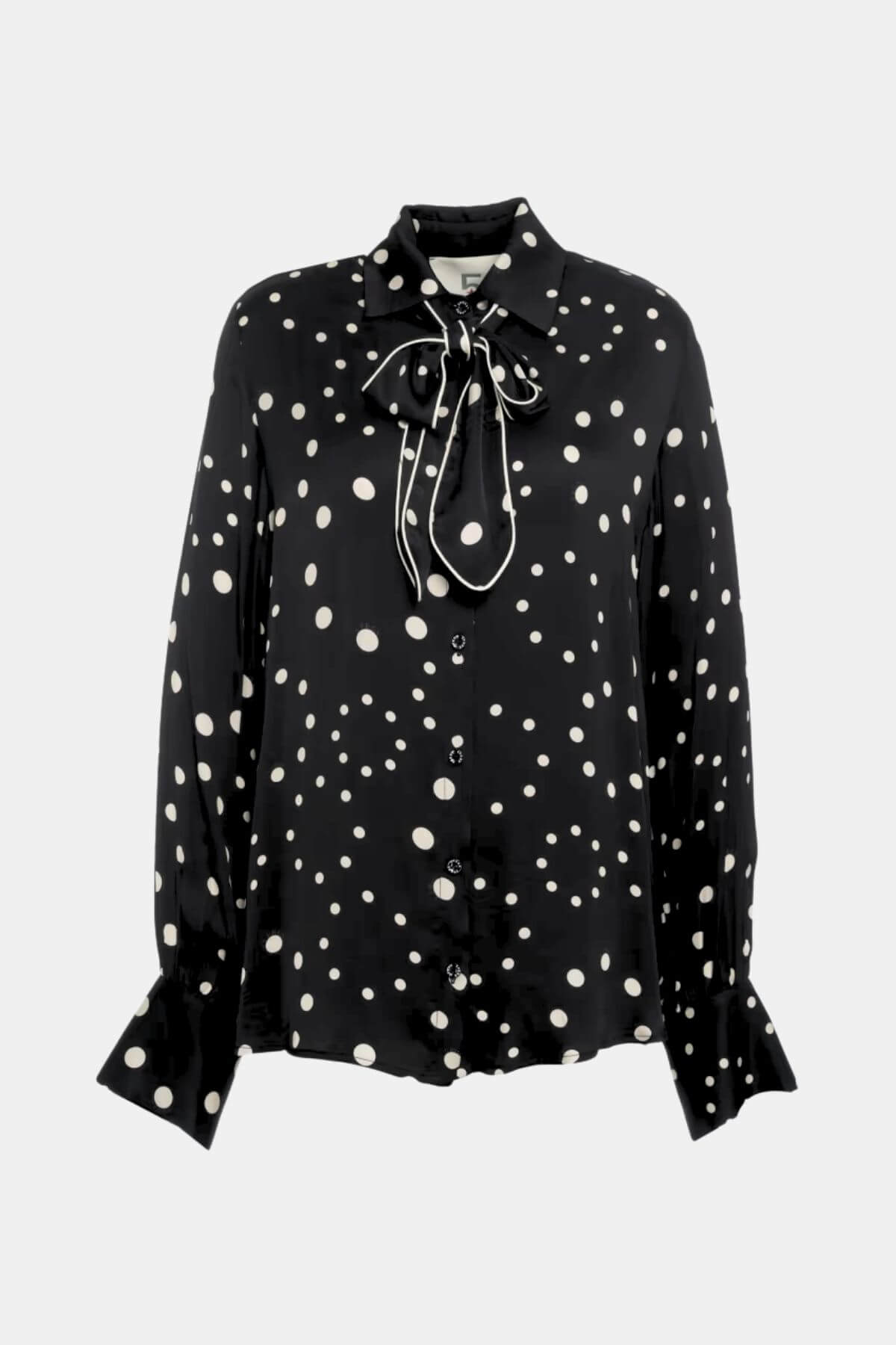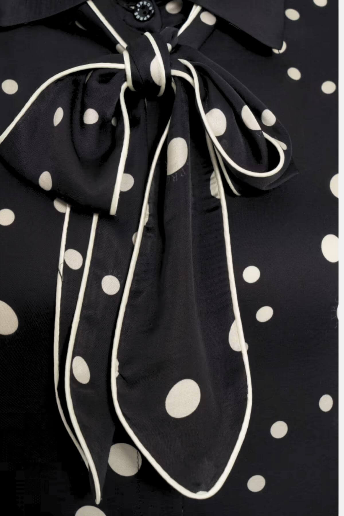 Polka dot print blouse from 5 Progress in flowing black fabric with ivory spots and a contrast-trimmed tie detail. Features voluminous sleeves with wide cuffs and a relaxed, feminine silhouette.