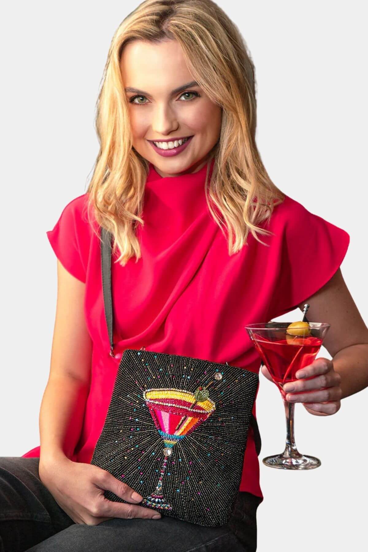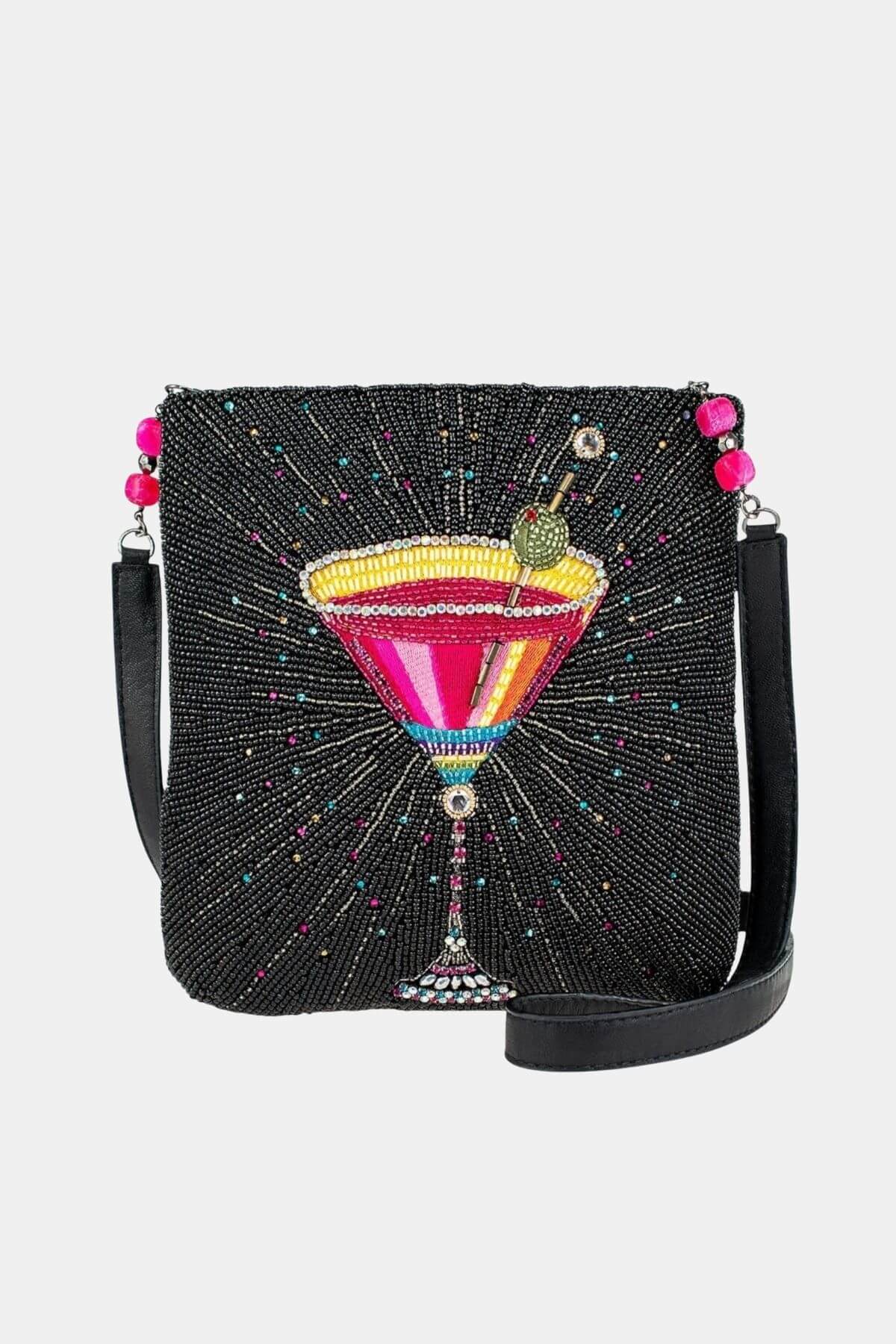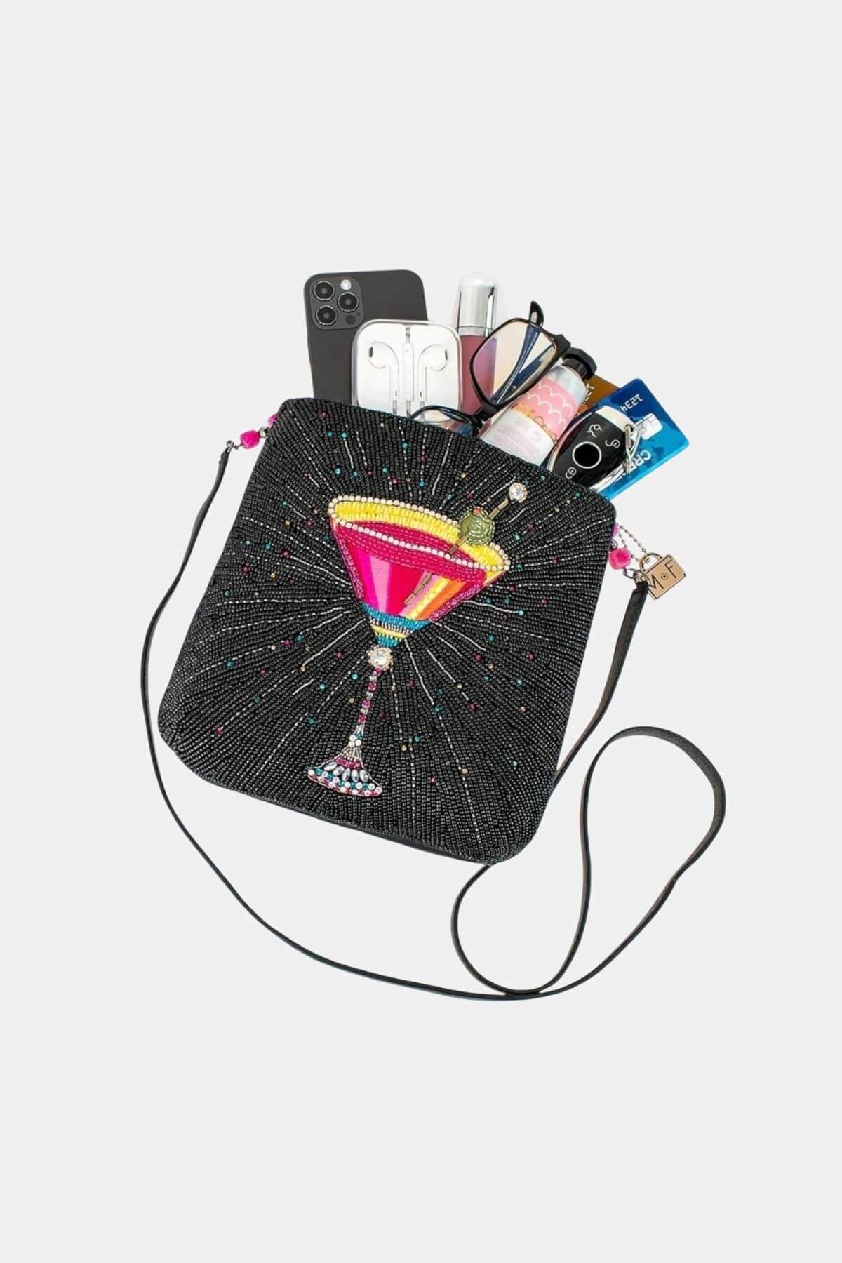 Carry the party with you with this vibrant beaded crossbody handbag! Bursting with sparkling gems and an embroidered hot pink martini glass, this handbag is the perfect accessory for a night out. Secure zipper closure and comfortable leather strap for all night wear. Fun and functional, it's sure to turn heads and add a pop of color to any outfit.