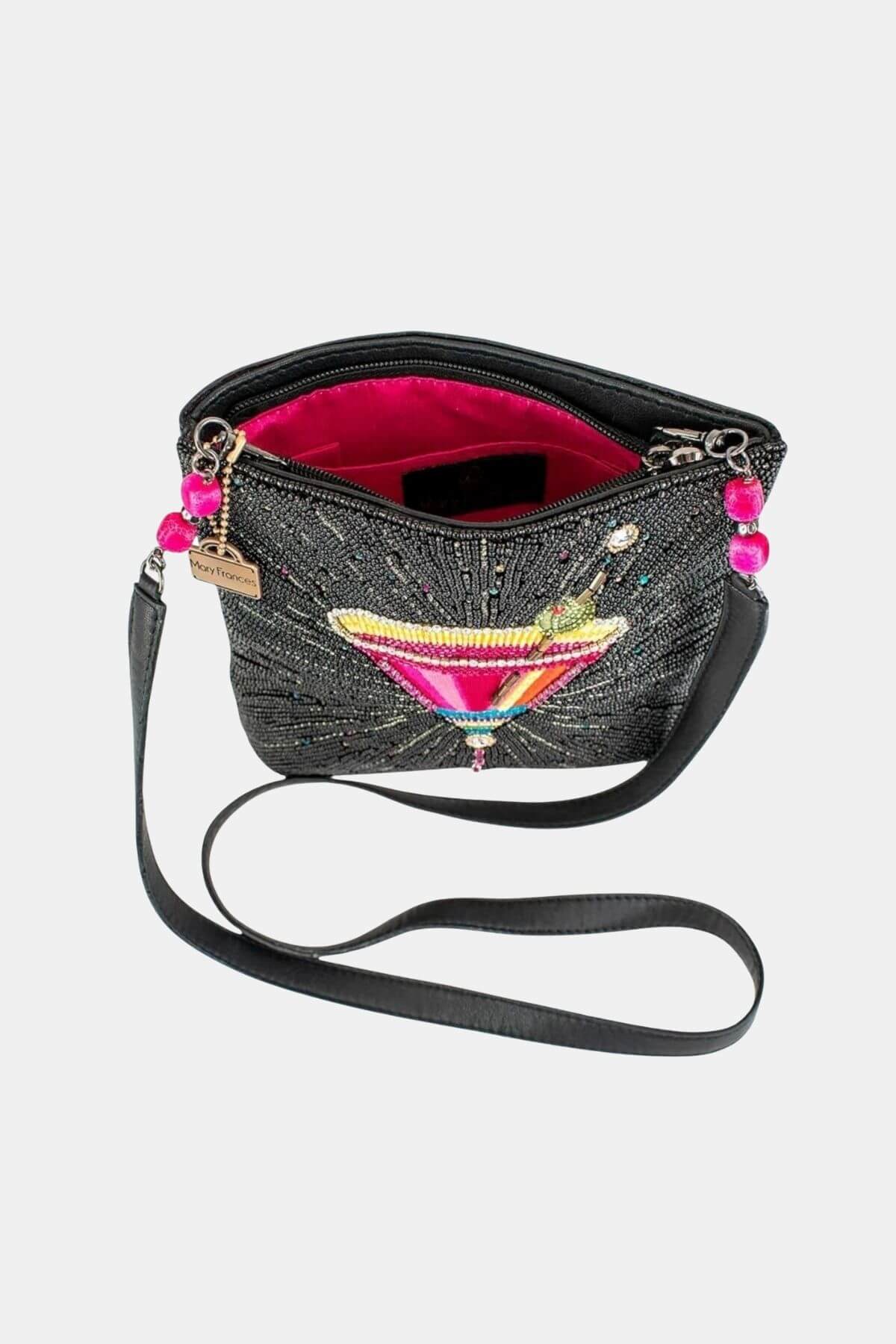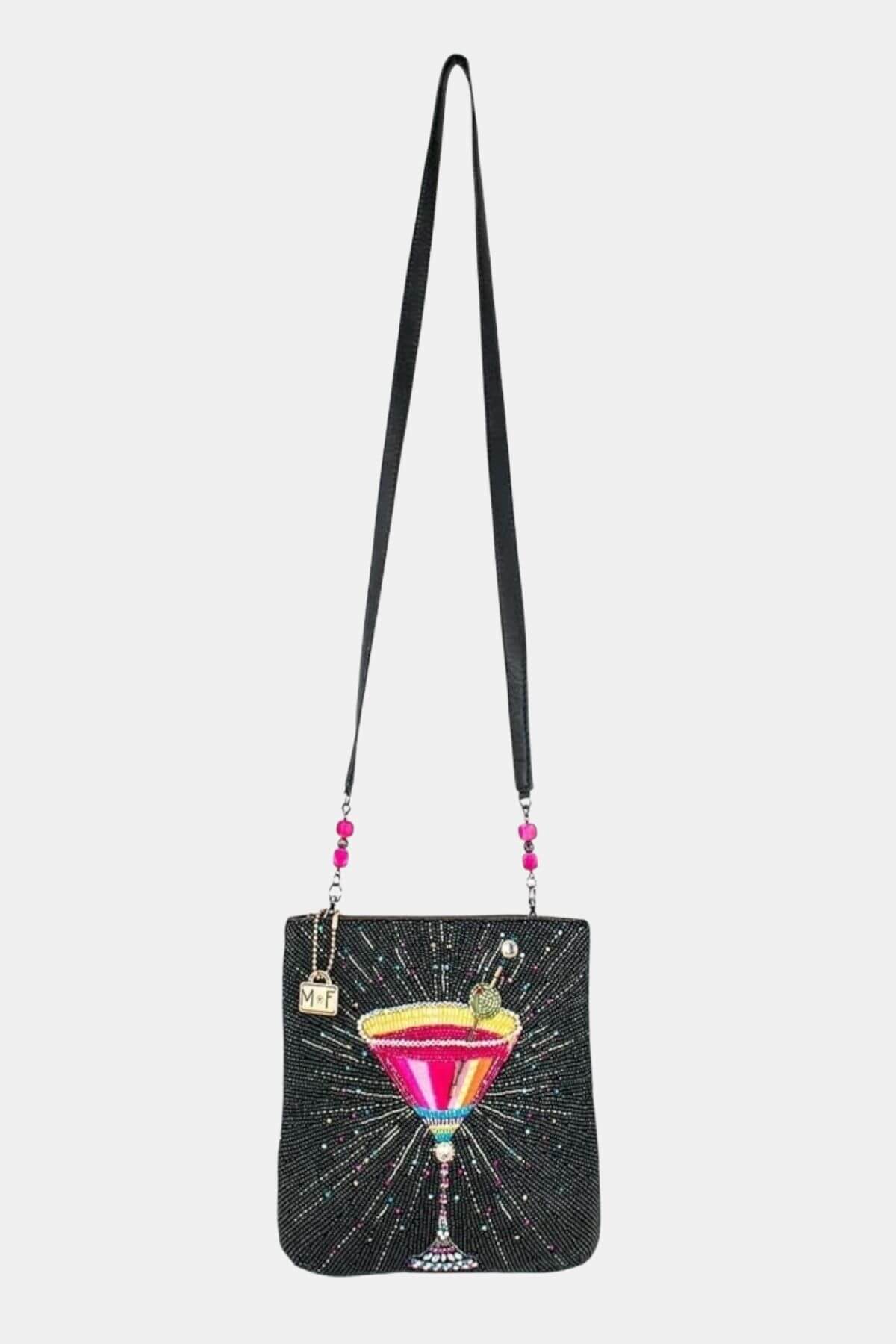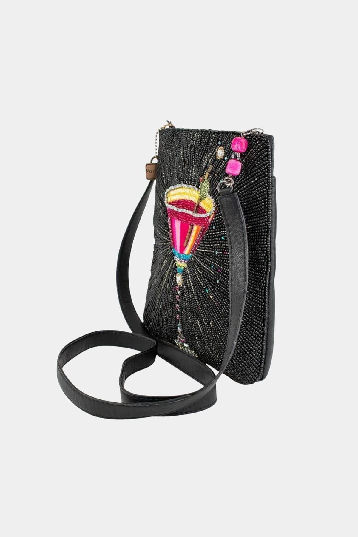 Carry the party with you with this vibrant beaded crossbody handbag! Bursting with sparkling gems and an embroidered hot pink martini glass, this handbag is the perfect accessory for a night out. Secure zipper closure and comfortable leather strap for all night wear. Fun and functional, it's sure to turn heads and add a pop of color to any outfit.