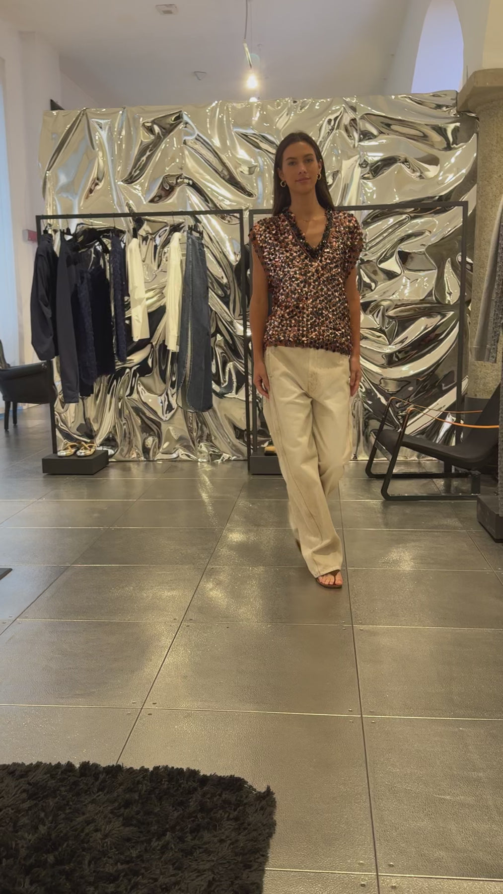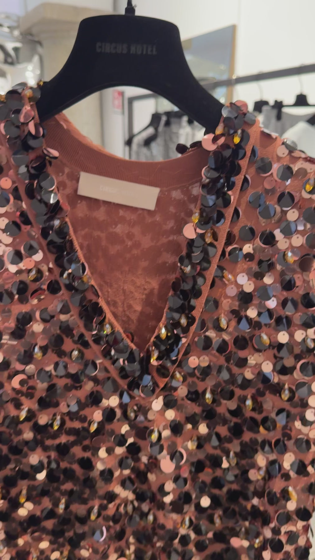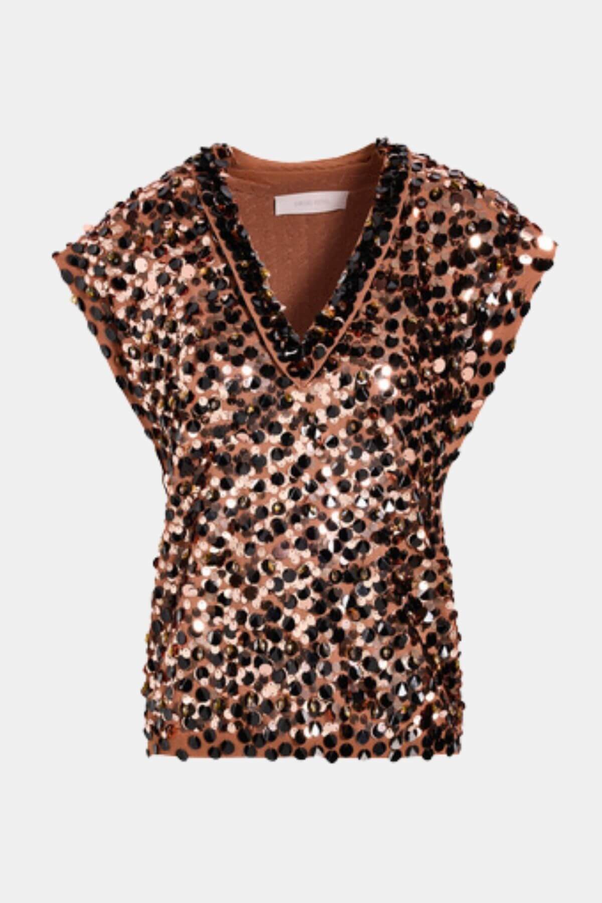 A statement sequin top designed in a flattering, close-to-the-body fit. Featuring a deep V-neckline, structured cap sleeves, and all-over oversized sequins in rich brown and amber tones, it delivers bold shine with a sleek, modern silhouette.