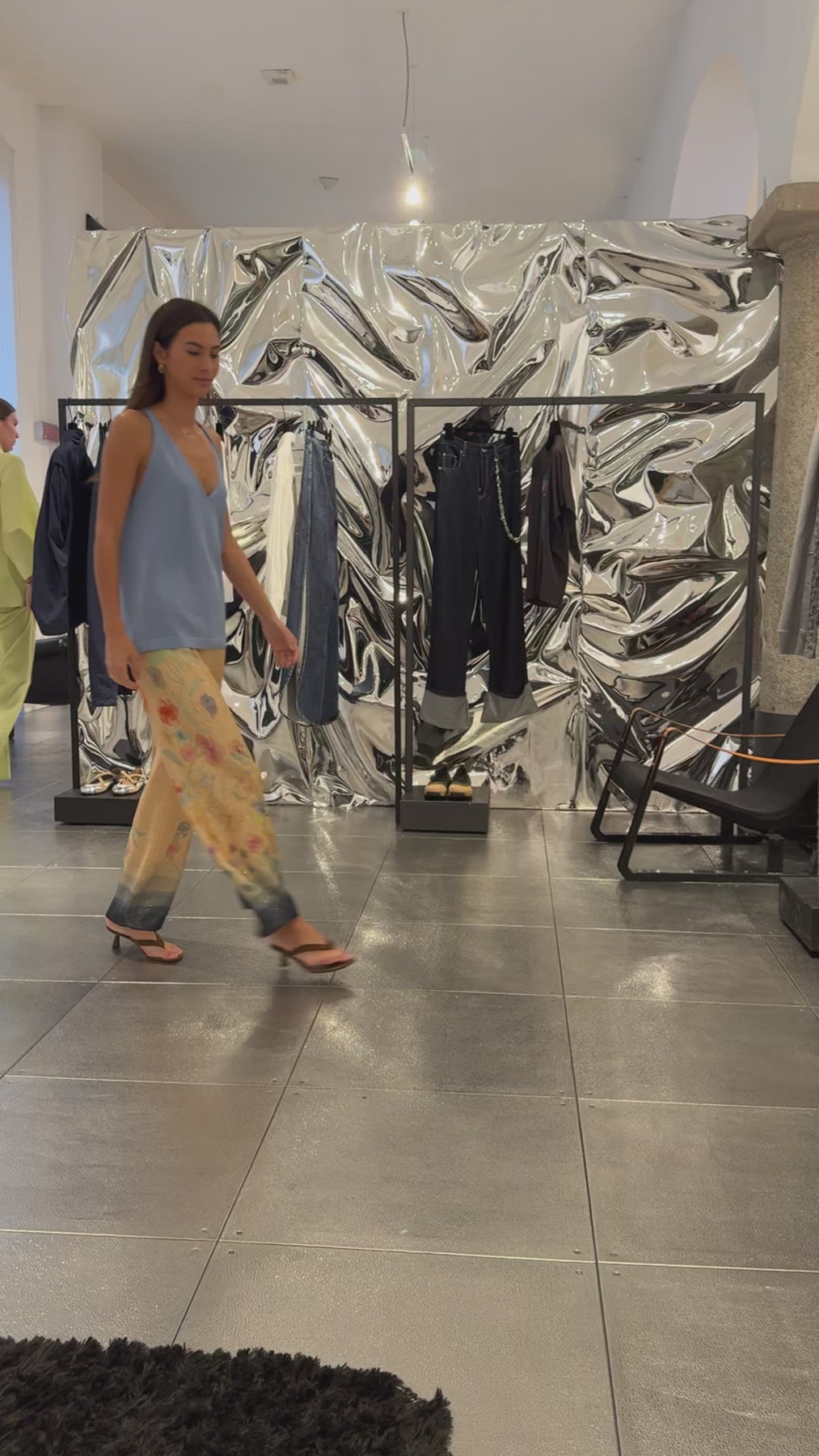 A lightweight tank top designed in a relaxed, fluid fit with a flattering V-neckline. Crafted from subtly shimmering fabric, it drapes softly on the body for an effortless, modern look that works equally well on its own or layered.
