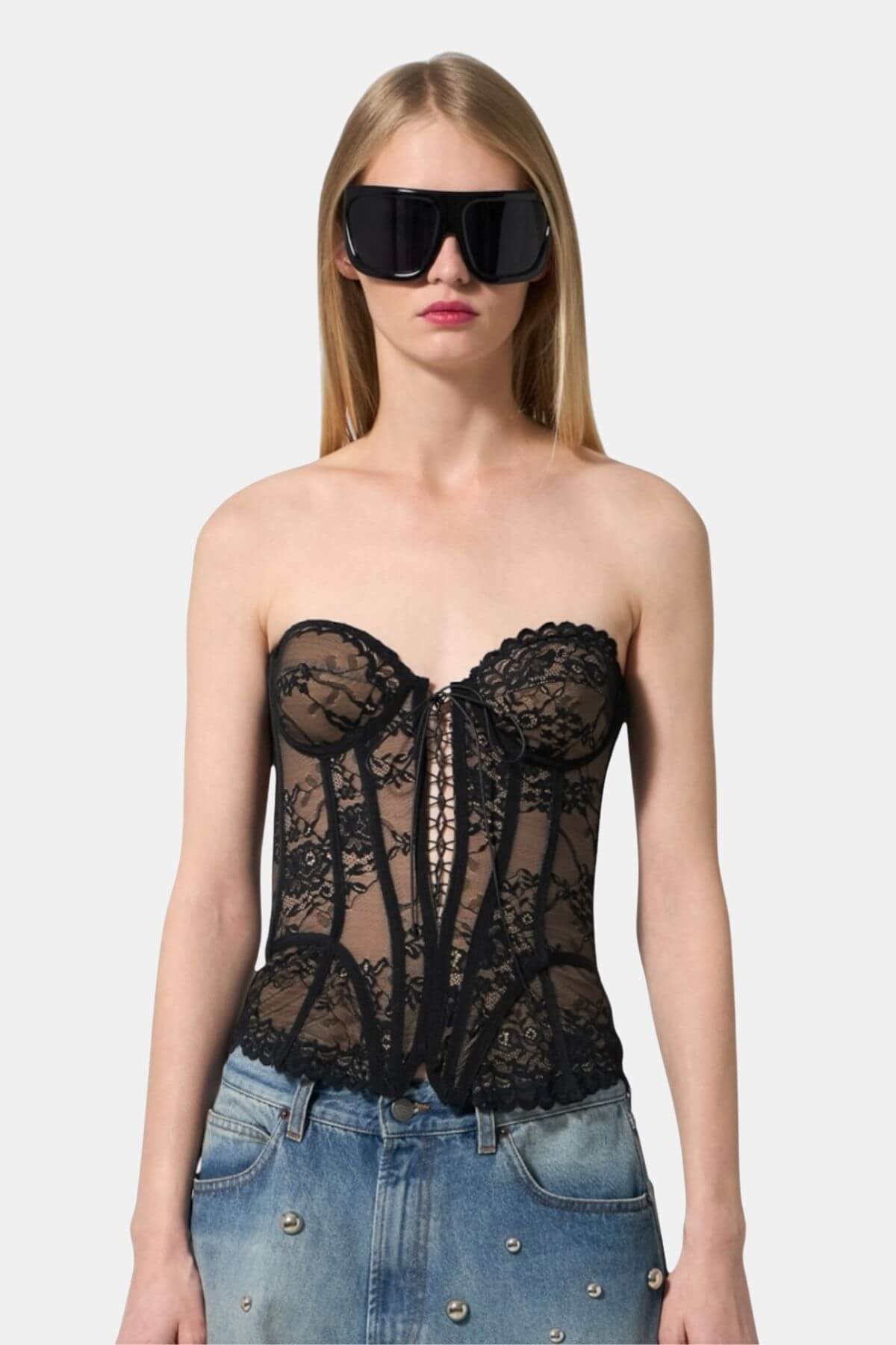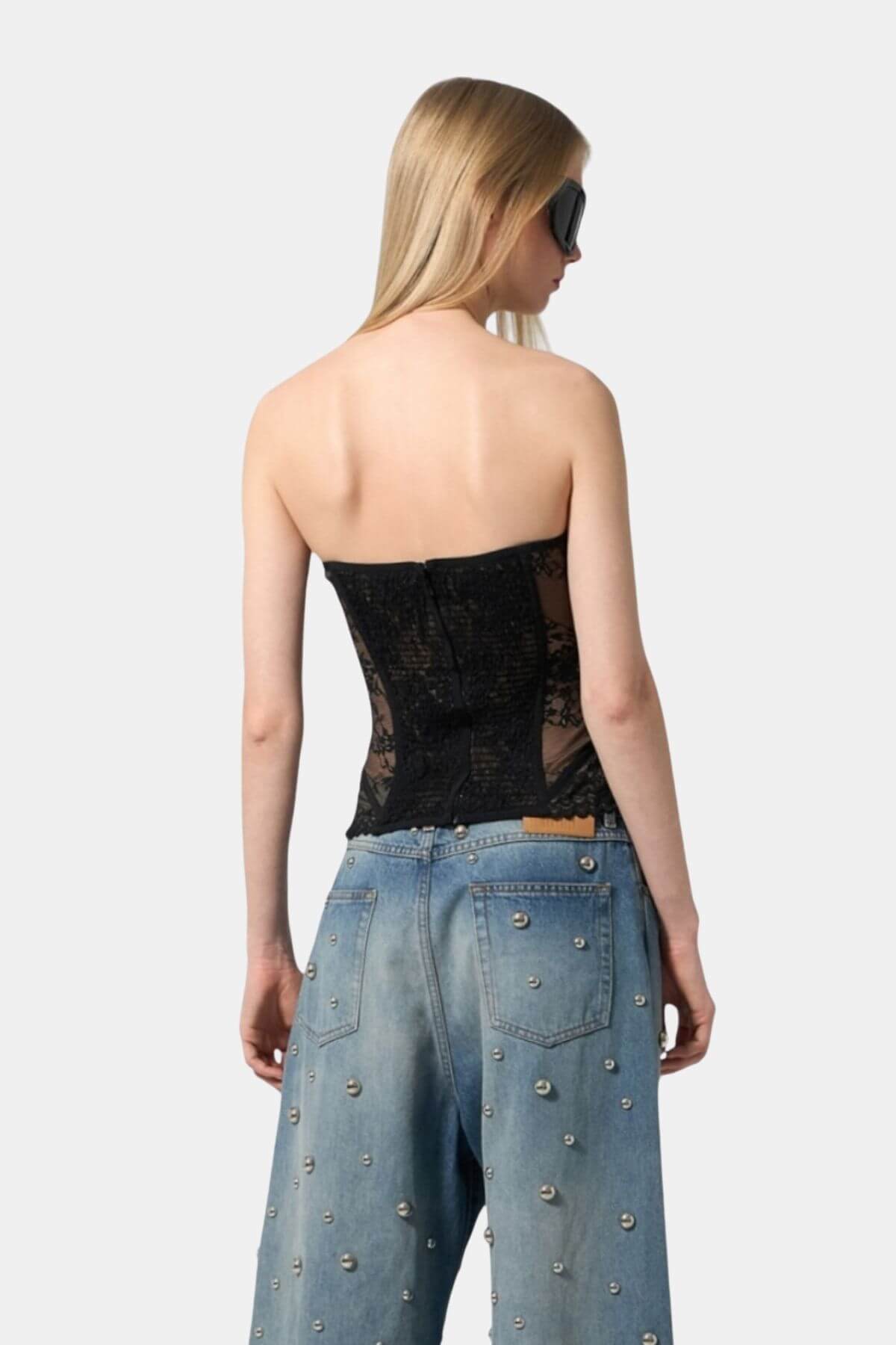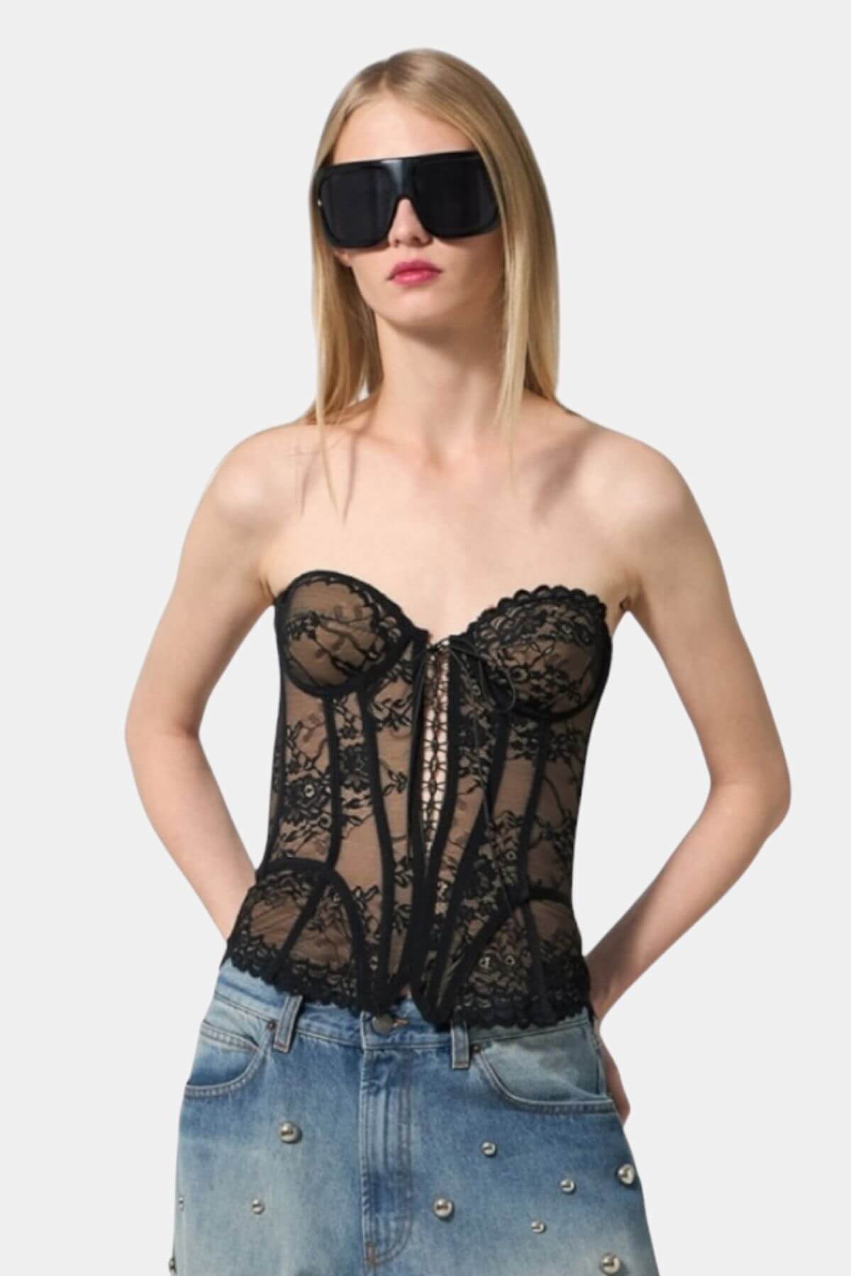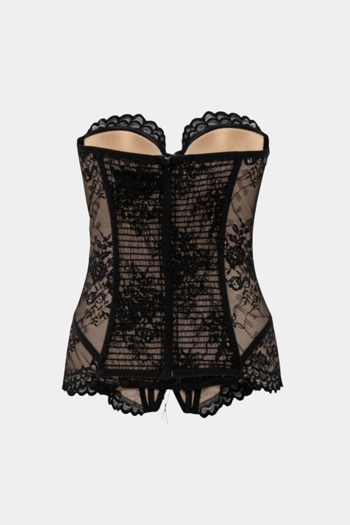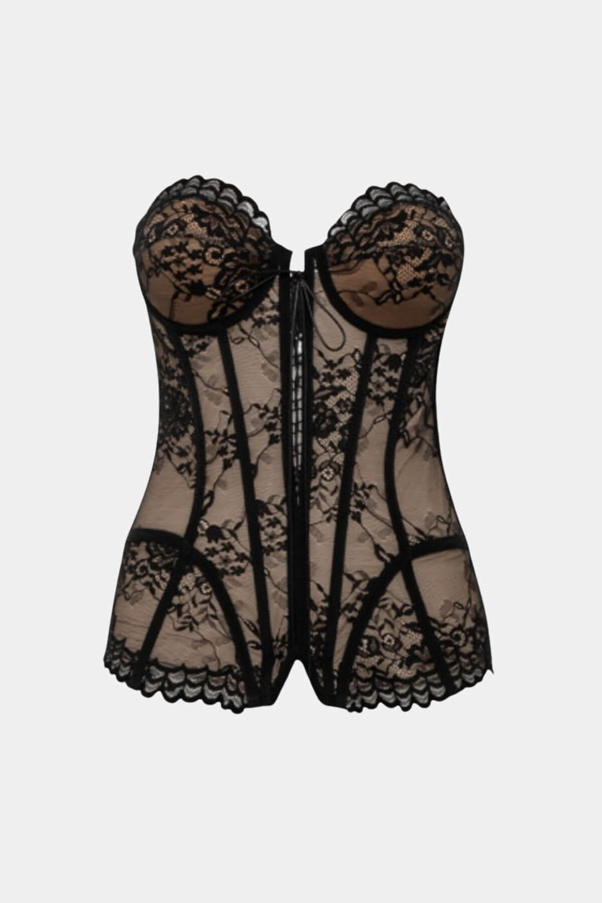 Let this amazing lingerie bustier corset top with floral lace design elevate your look to a whole other level. The corset has bra neckline and cross-over front and interior boning for extra support. It has an asymmetric bottom, is fully lined, and has a back zipper closure. The corset has a slim fit.