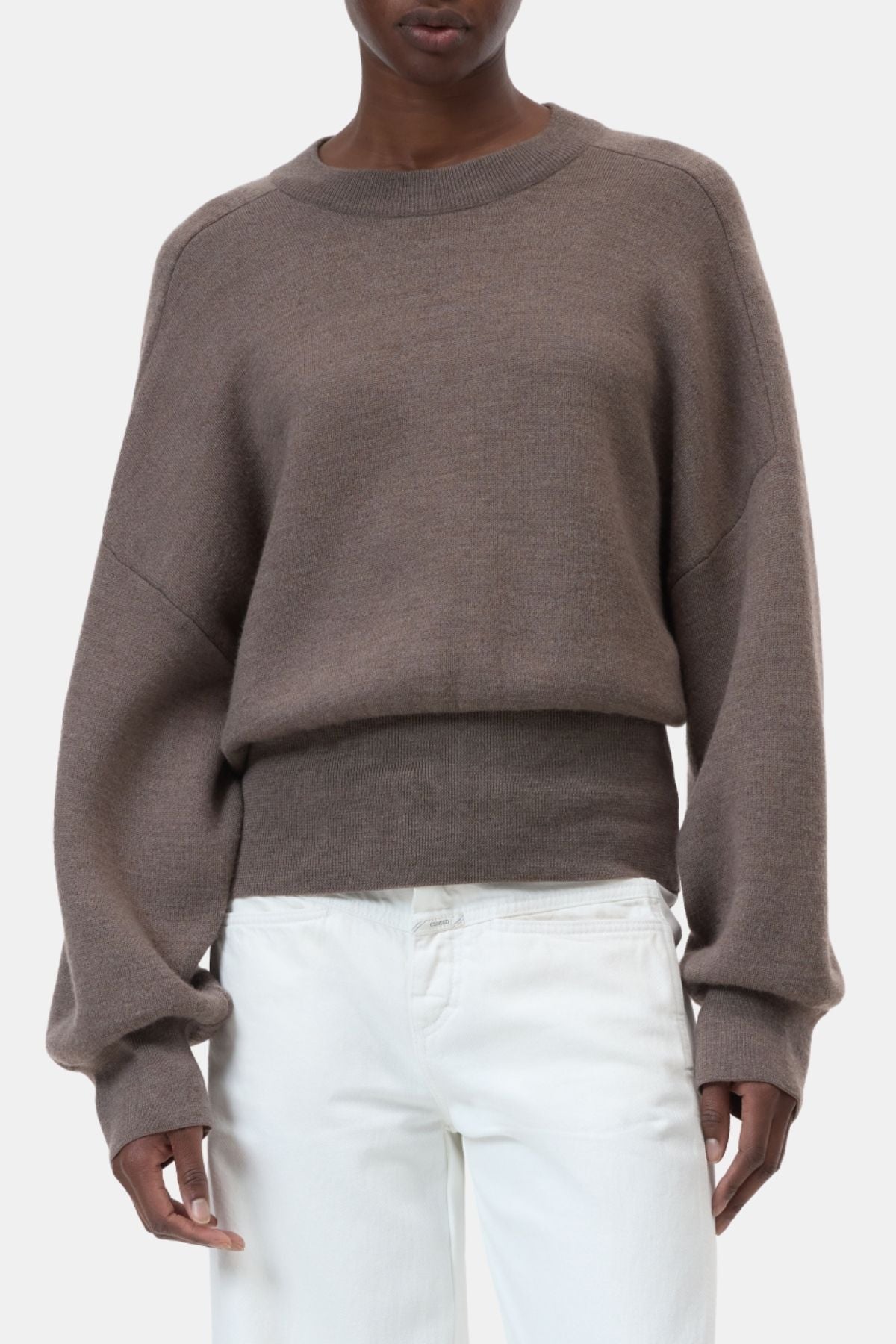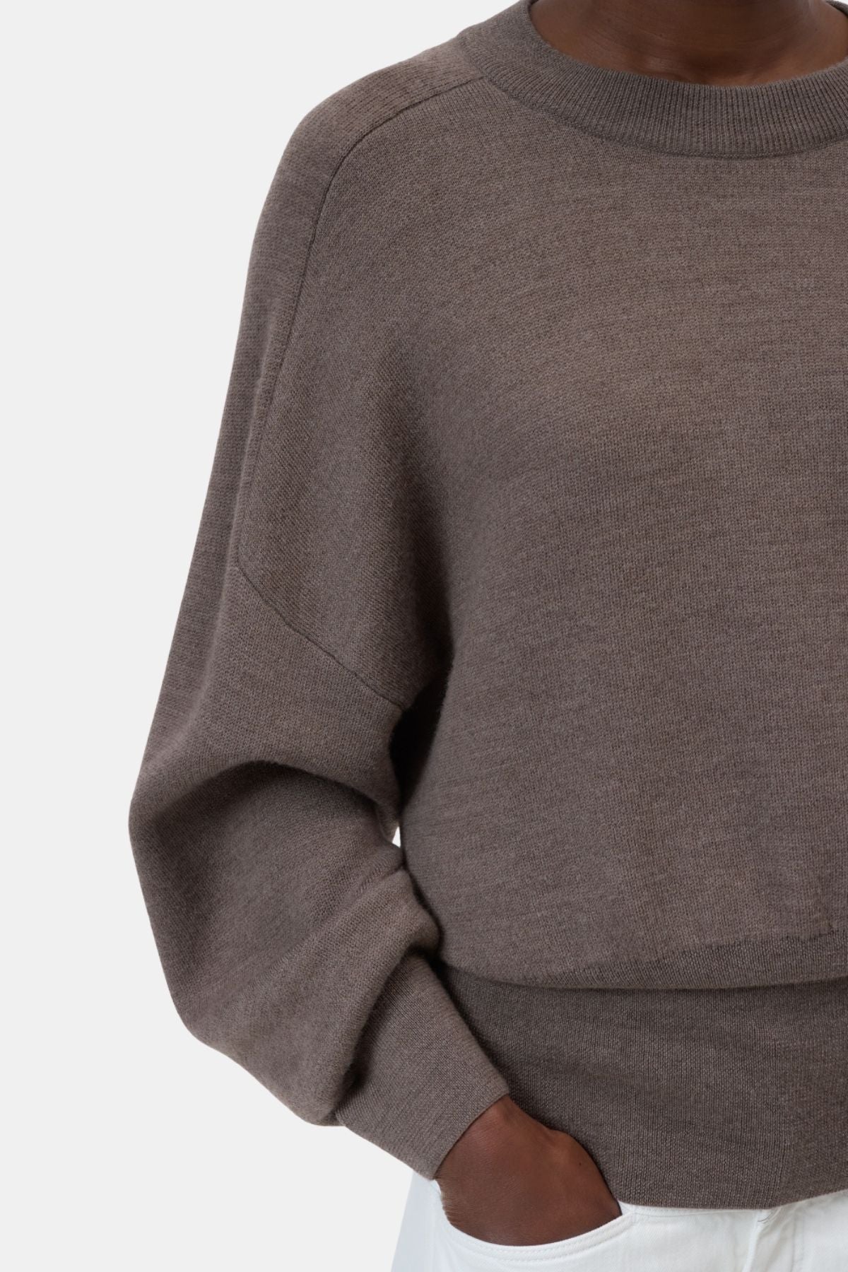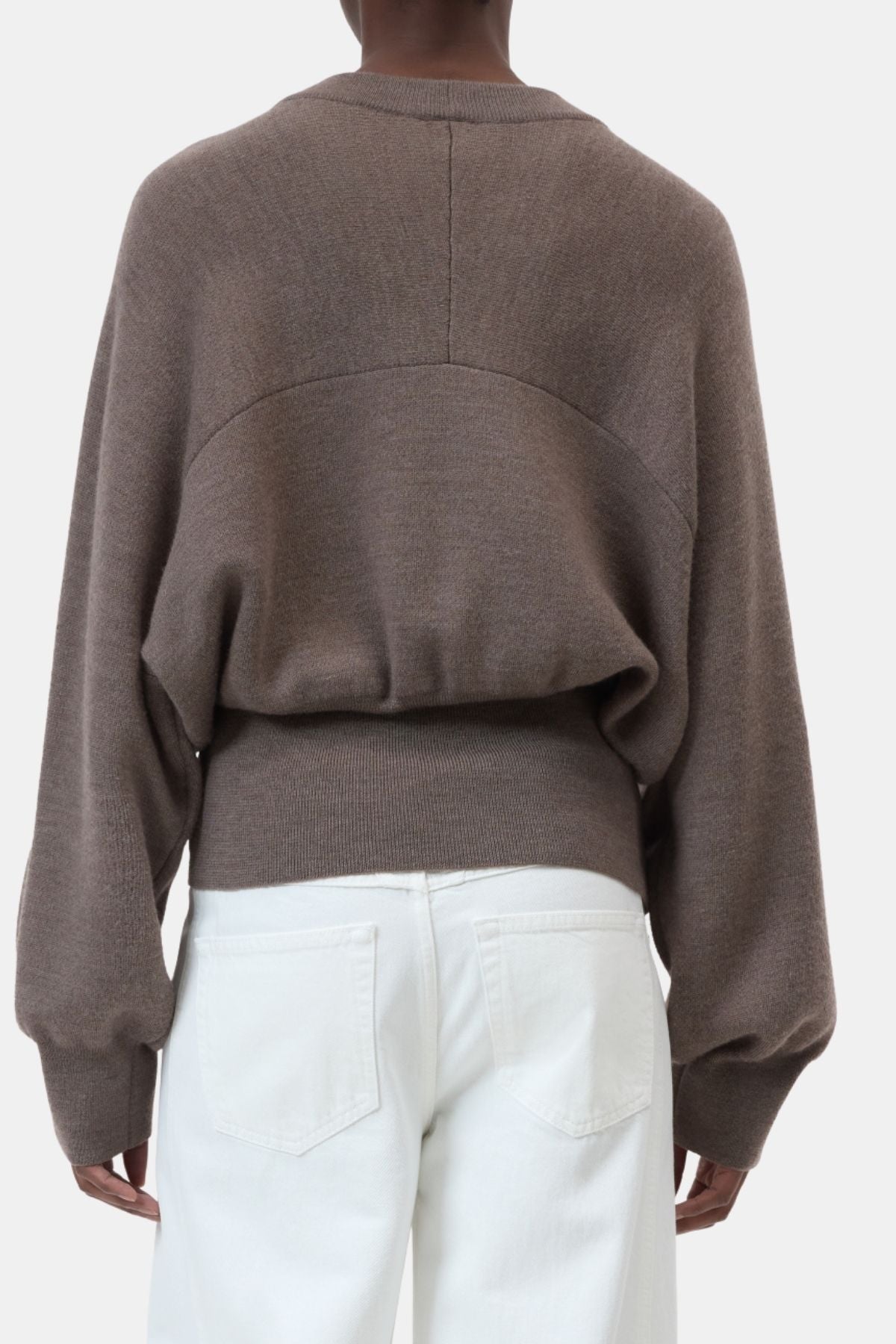 This round-neck jumper features an oversized silhouette balanced by a slim, defined waist created through wide, elasticated ribbed cuffs. Voluminous sleeves with fitted cuffs enhance the modern shape, while distinctive stitching across the back adds a subtle design detail. Crafted primarily from pure merino wool, the jumper offers warmth and softness, with elasticated elements ensuring comfort and a flattering fit.