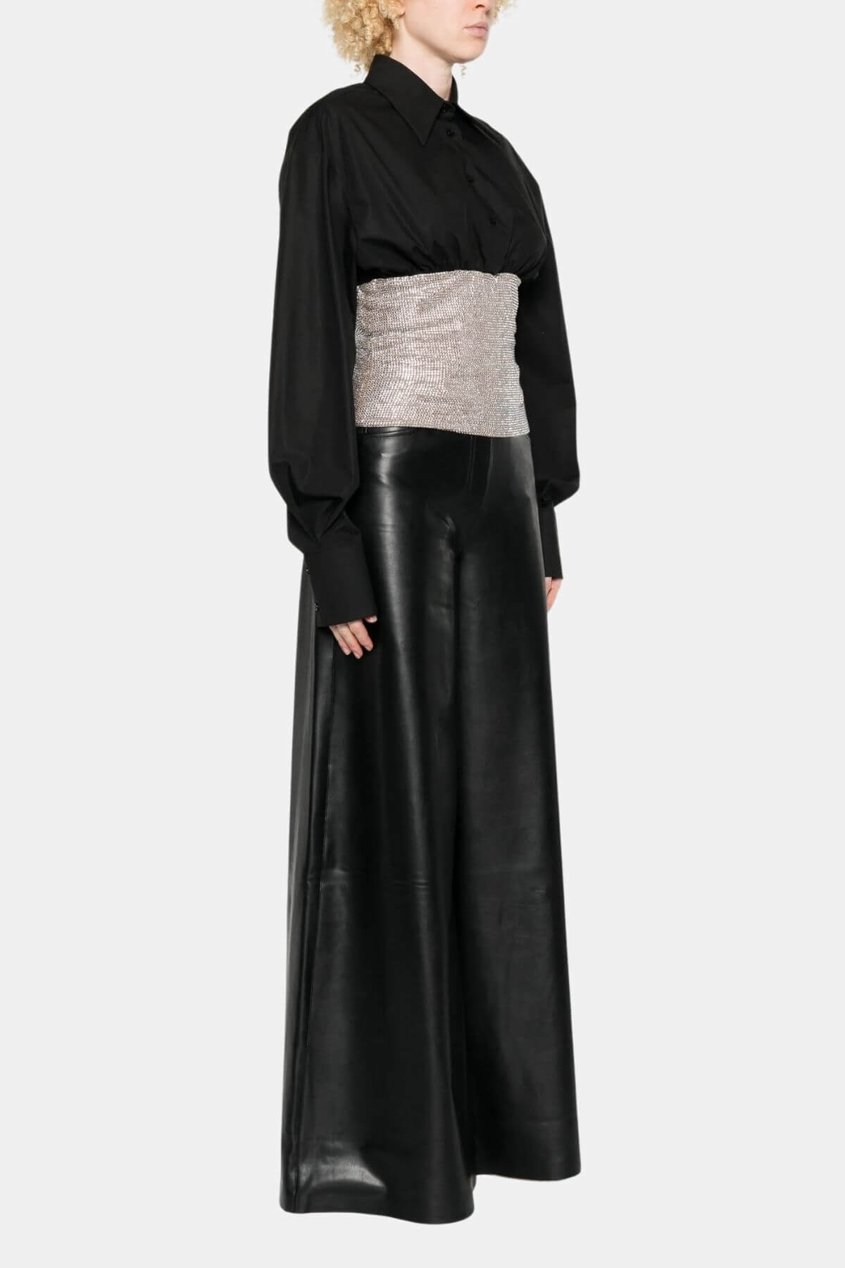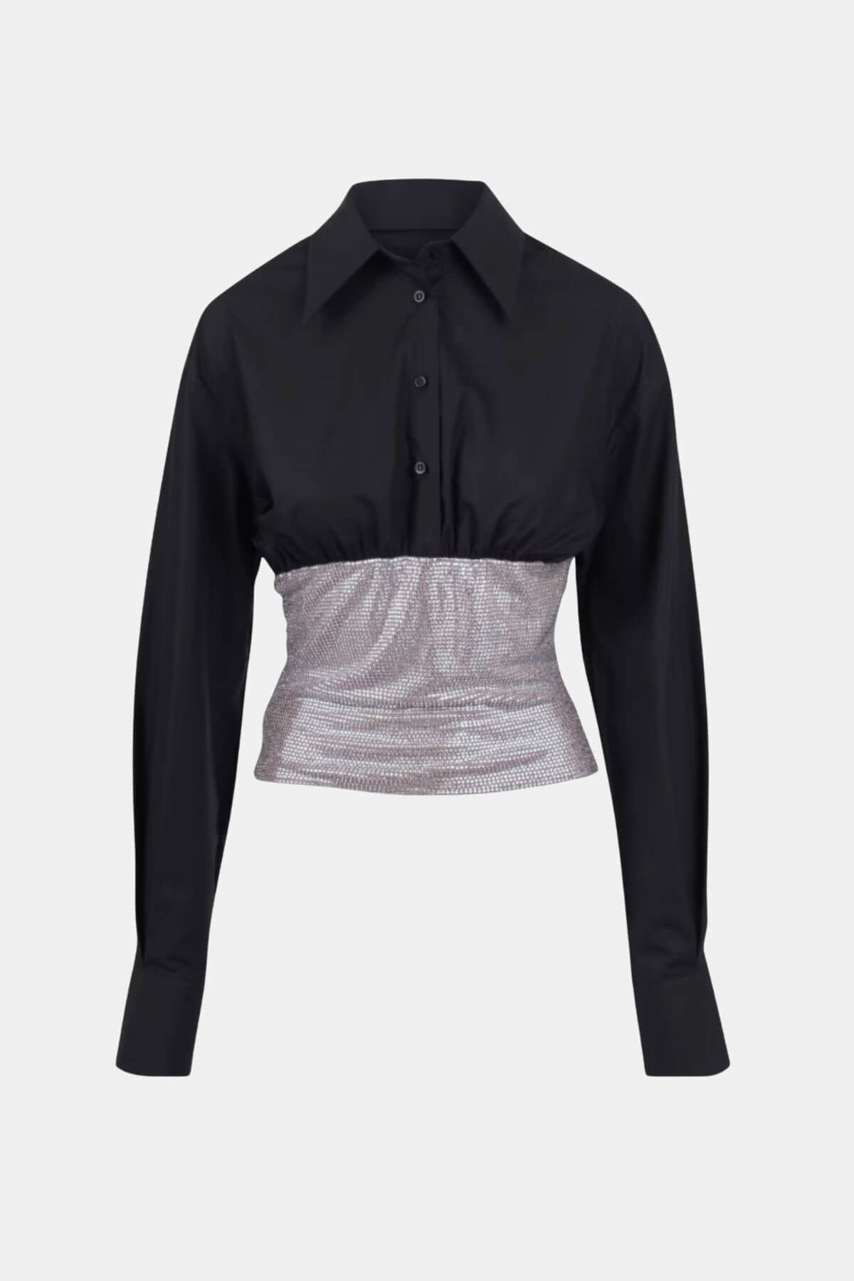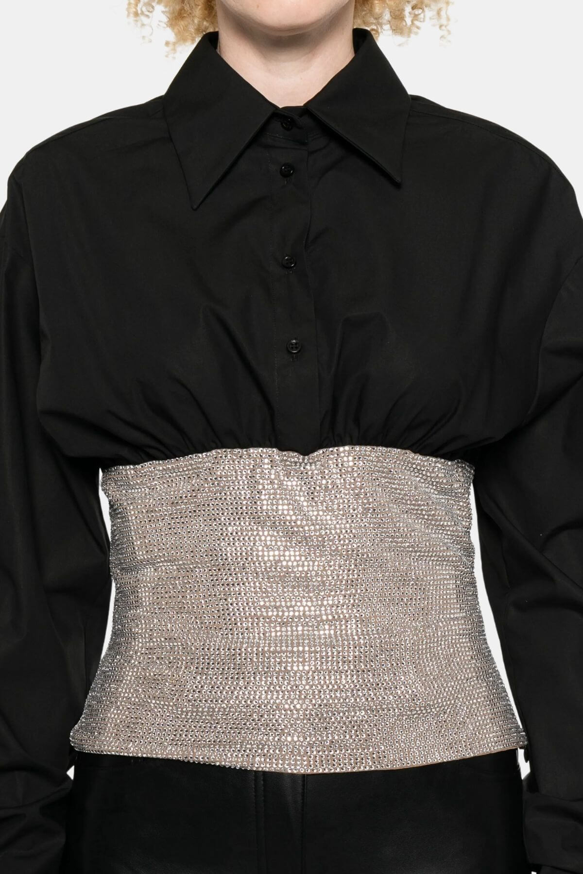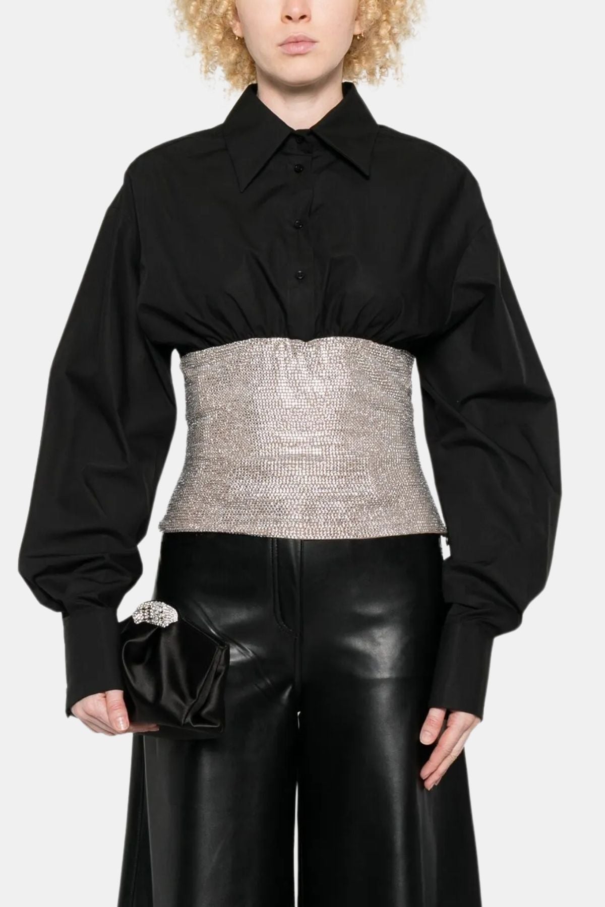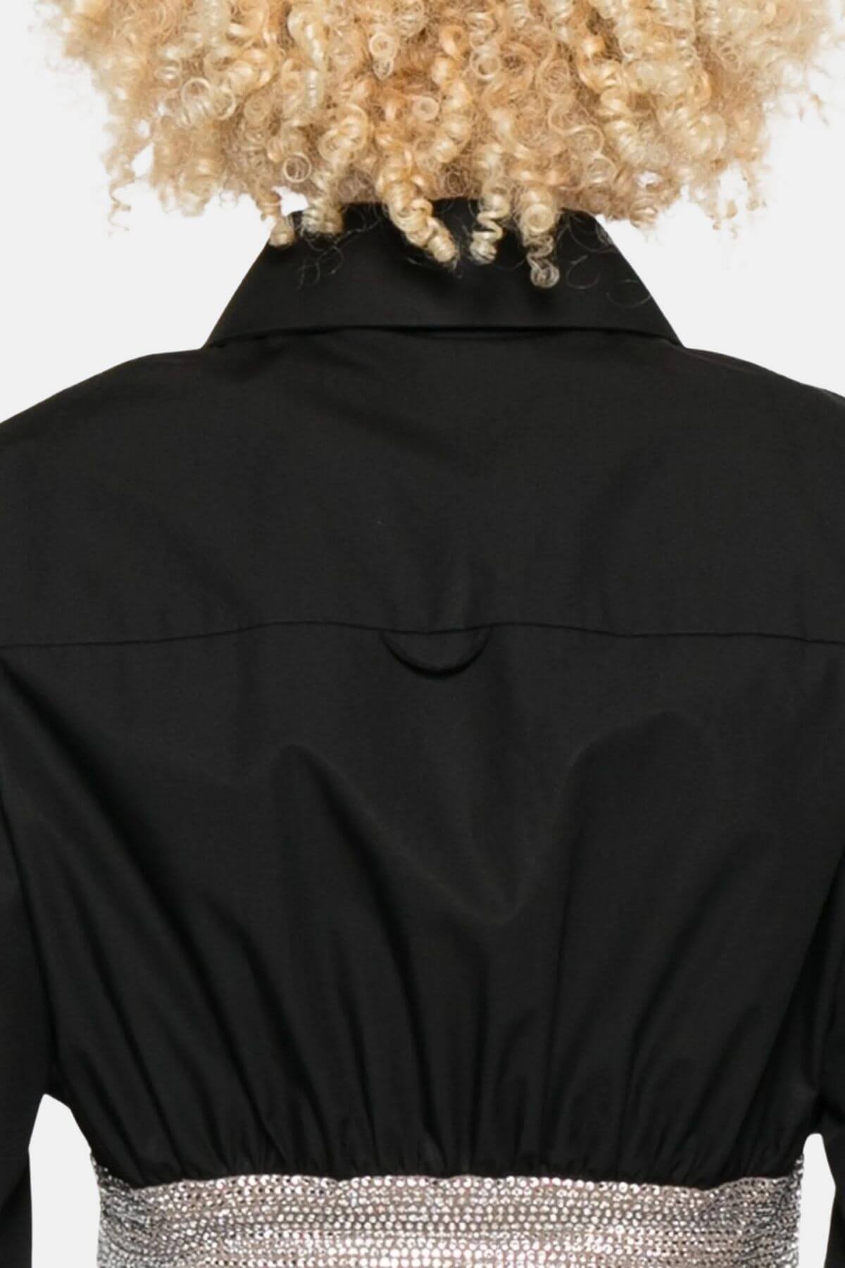 This black poplin shirt offers a modern take on classic tailoring with its slightly loose fit and cropped silhouette. The shirt stops just below the bust, where a wide, crystal-embellished band is attached, creating a beautifully gathered effect that accentuates the waist. The contrast between the crisp poplin fabric and the sparkling crystal detail gives the piece a sophisticated yet contemporary edge — perfect for elevating both day and evening looks.