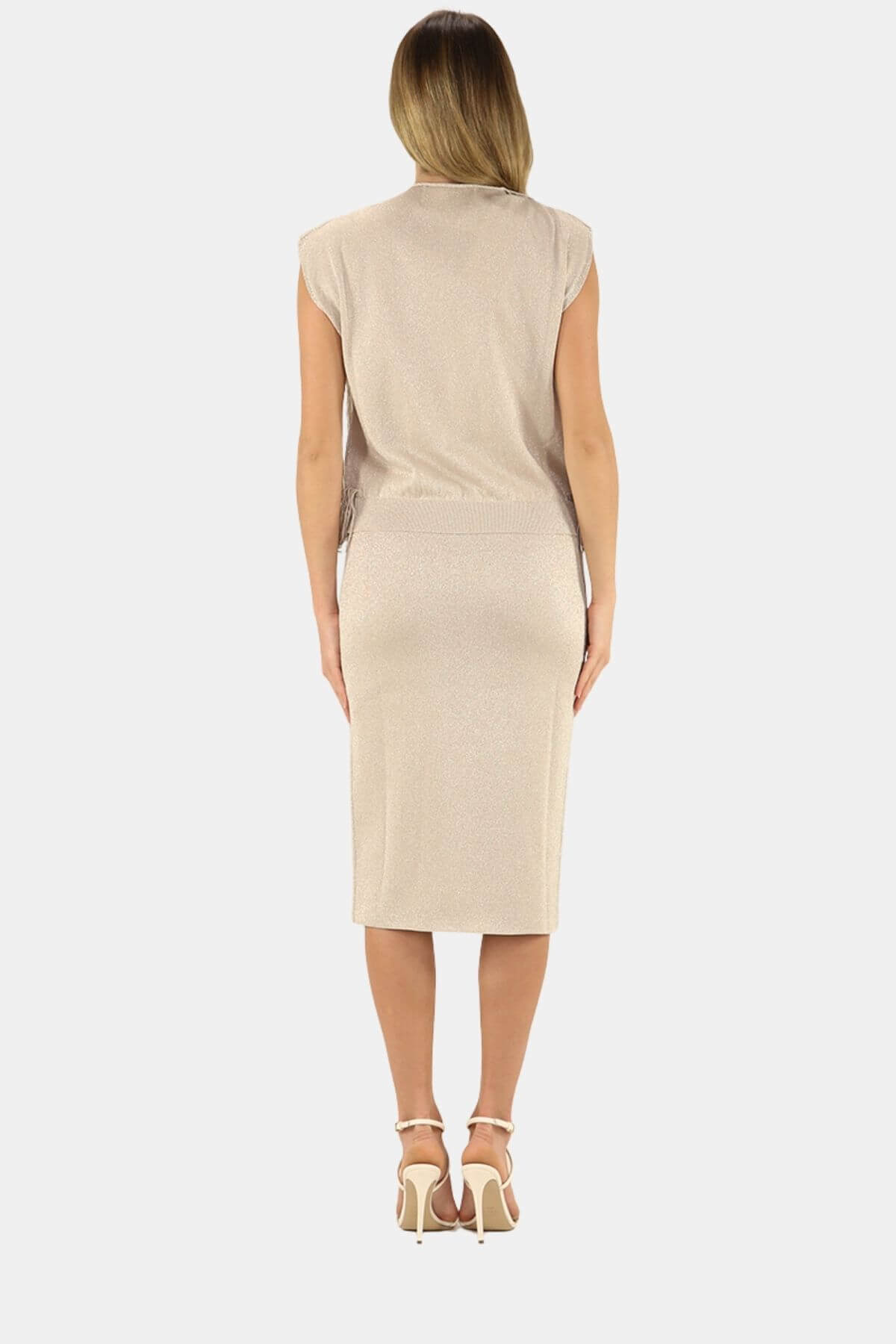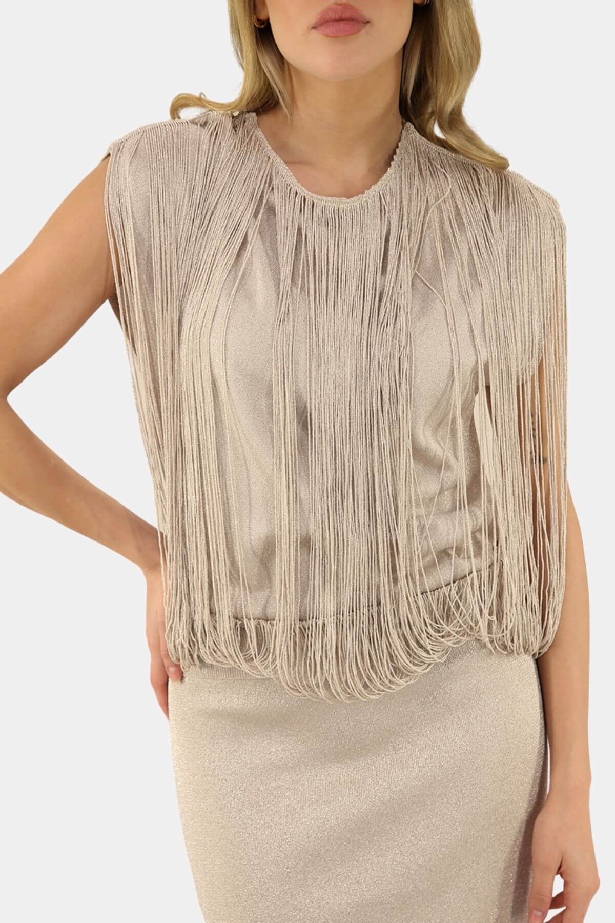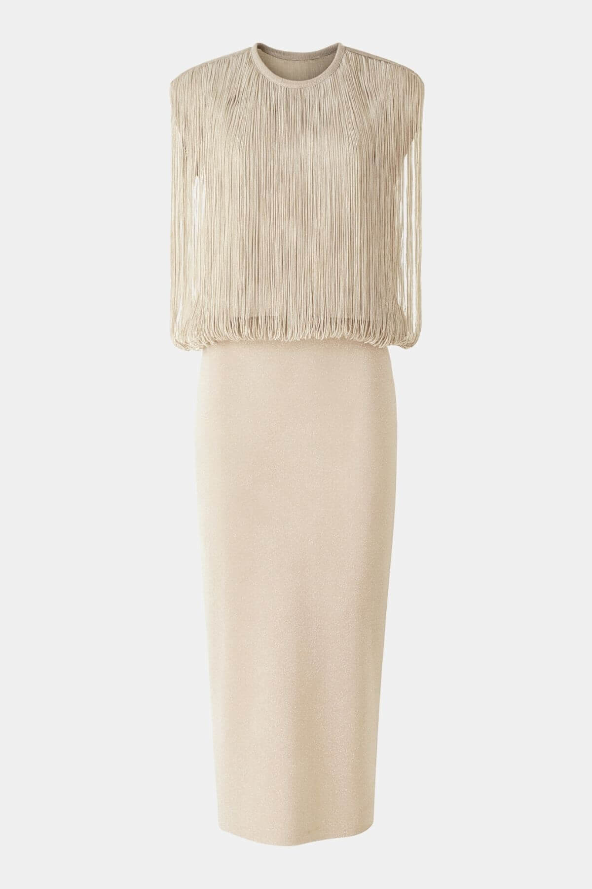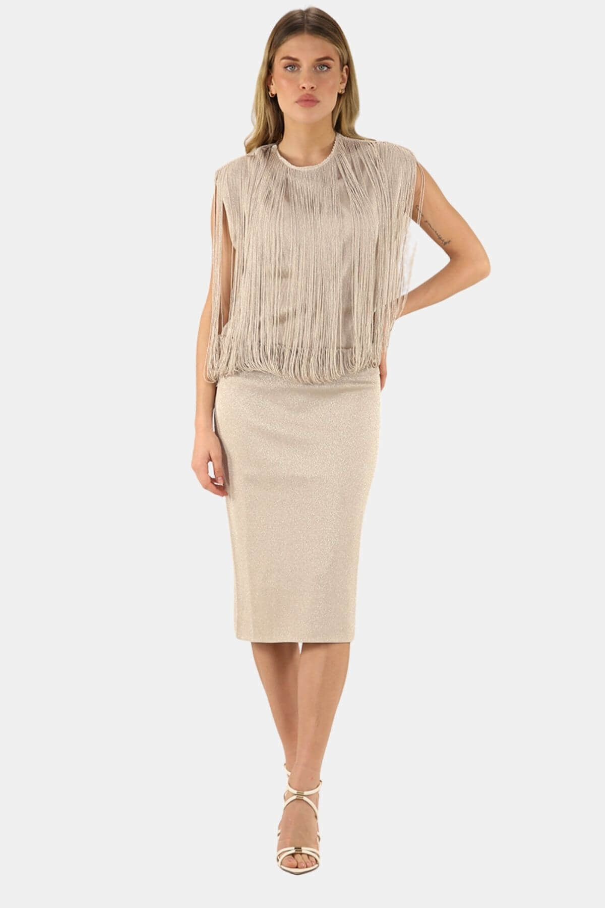 Look beautiful in this beige midi dress from Circus Hotel with fringe detail.