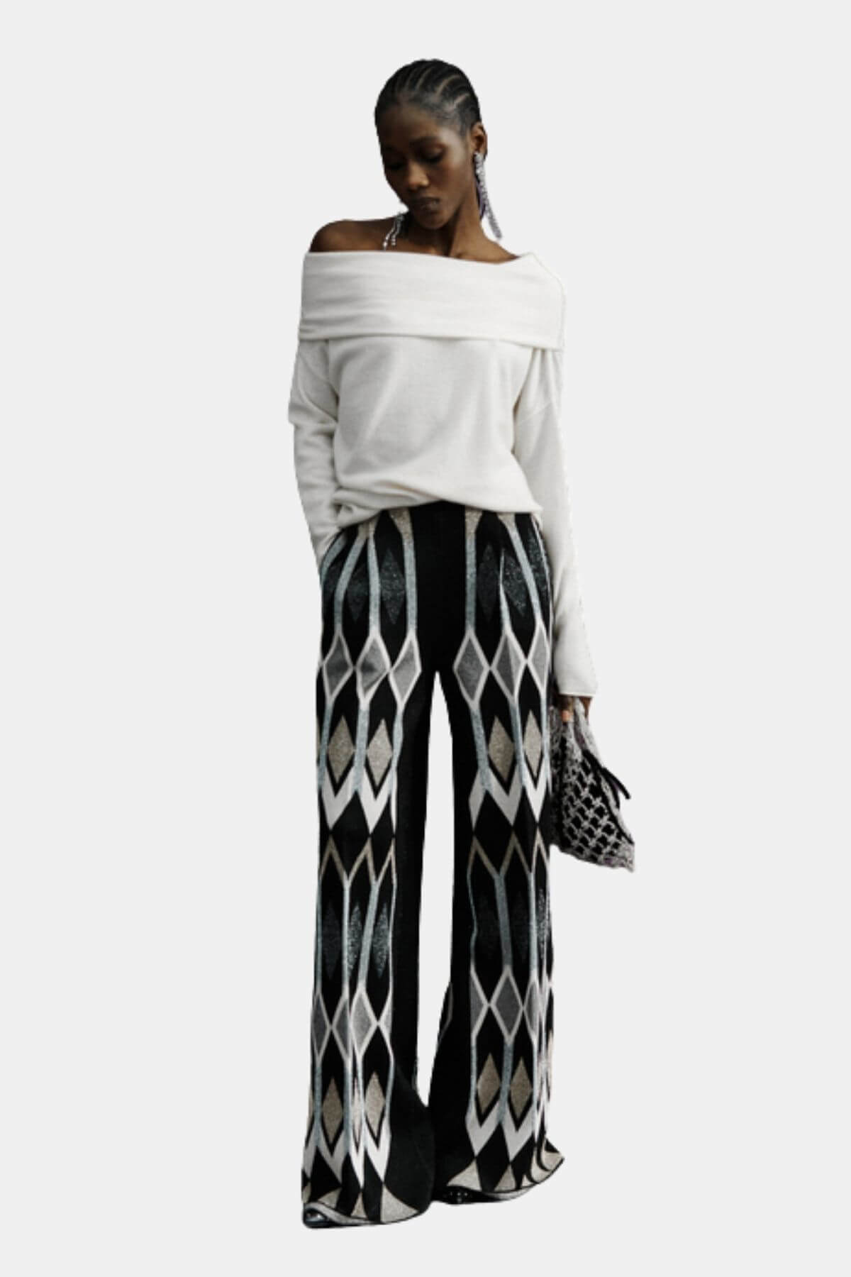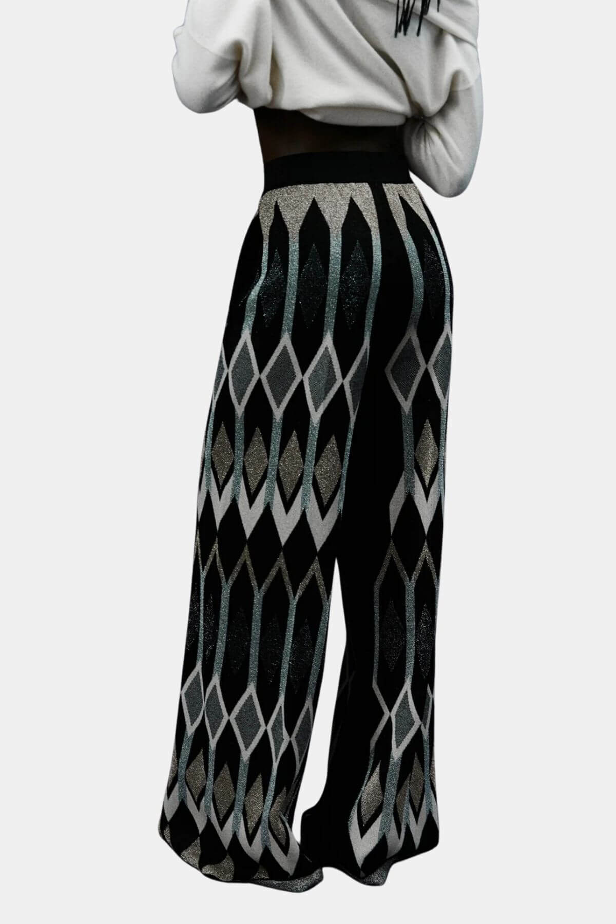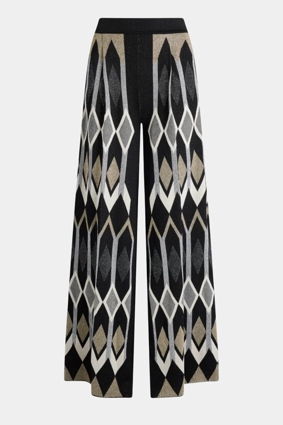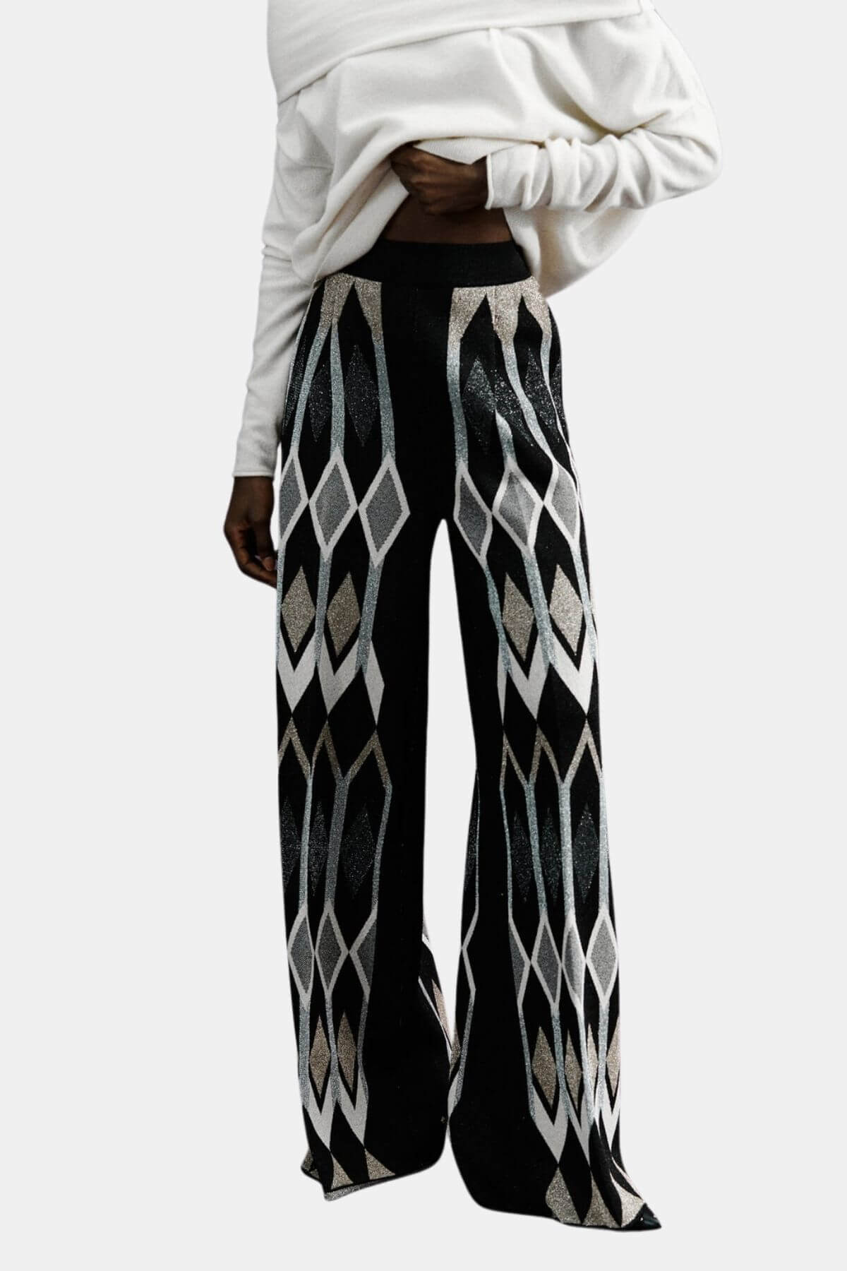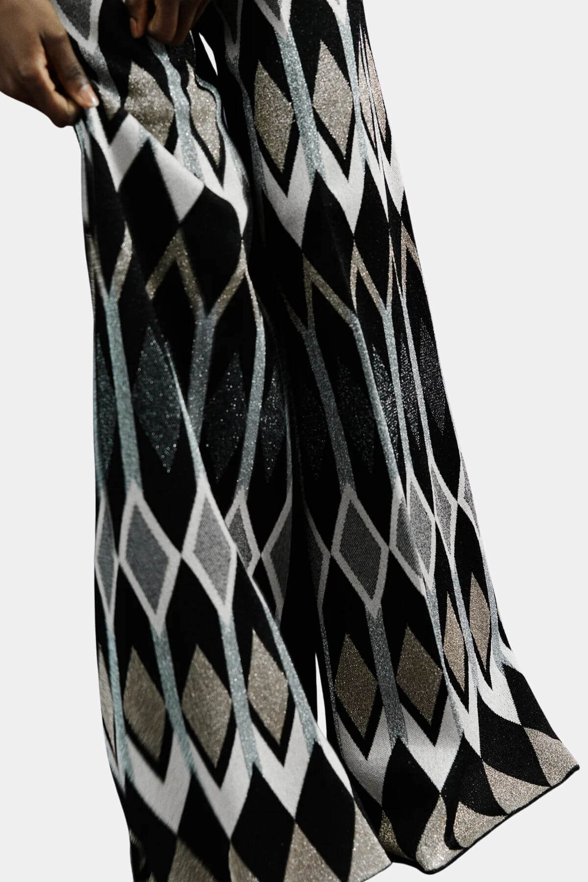 Wide-leg knit pants with bold diamond jacquard pattern in black, ivory, and metallic tones.