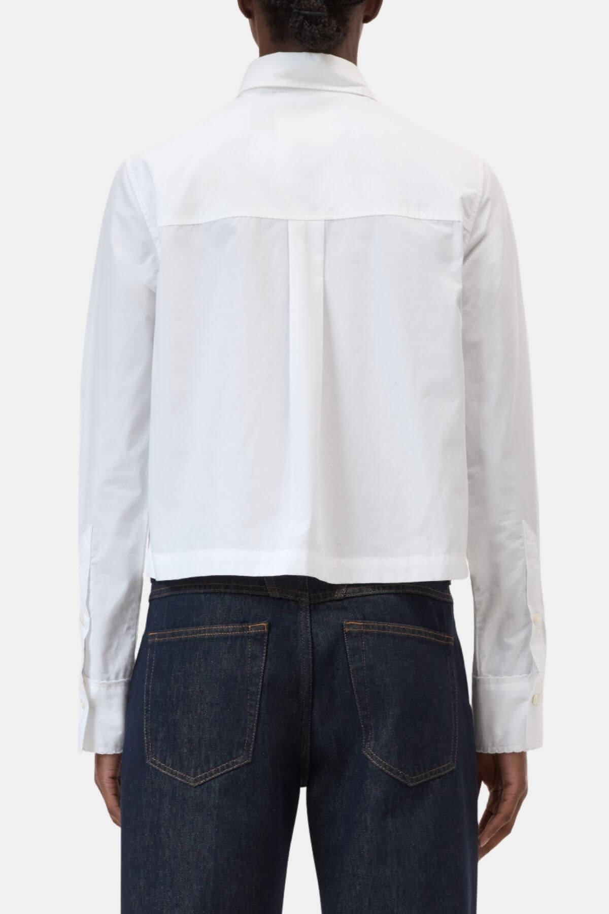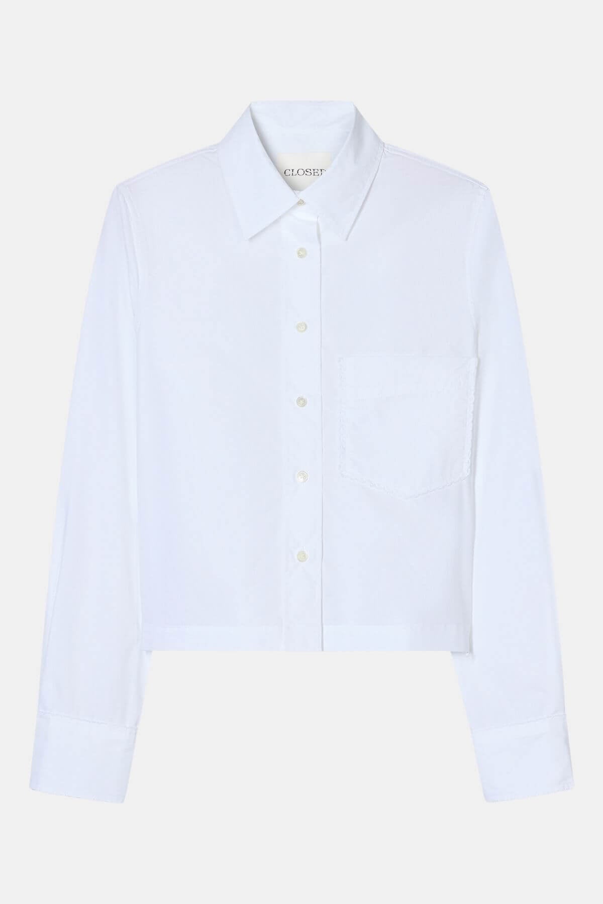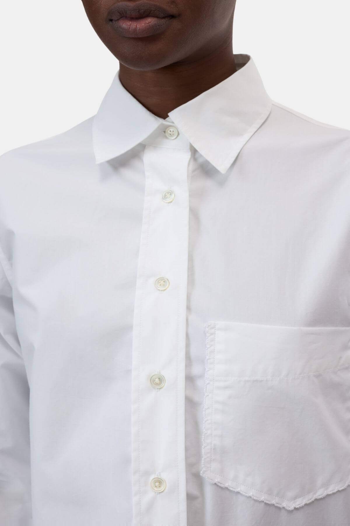 This blouse is handcrafted in Portugal from crisp organic cotton poplin and designed with a regular fit and a modern cropped length. The straight hem and box pleat at the back create a clean, structured silhouette, while delicate lace details on the chest pocket and cuffs add a refined, feminine touch. Lightweight and breathable, it offers all-day comfort with a polished appearance.