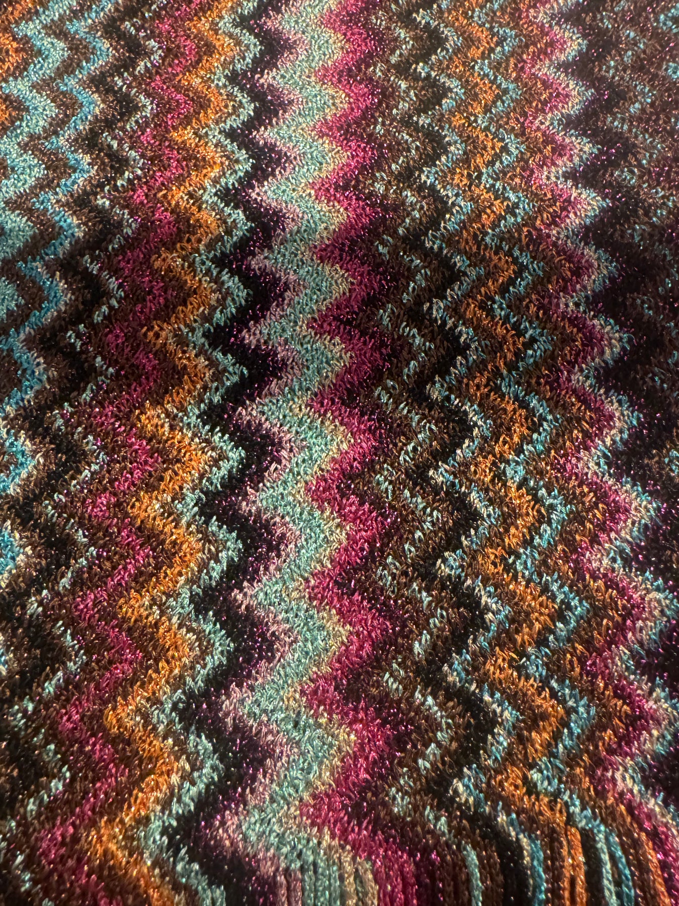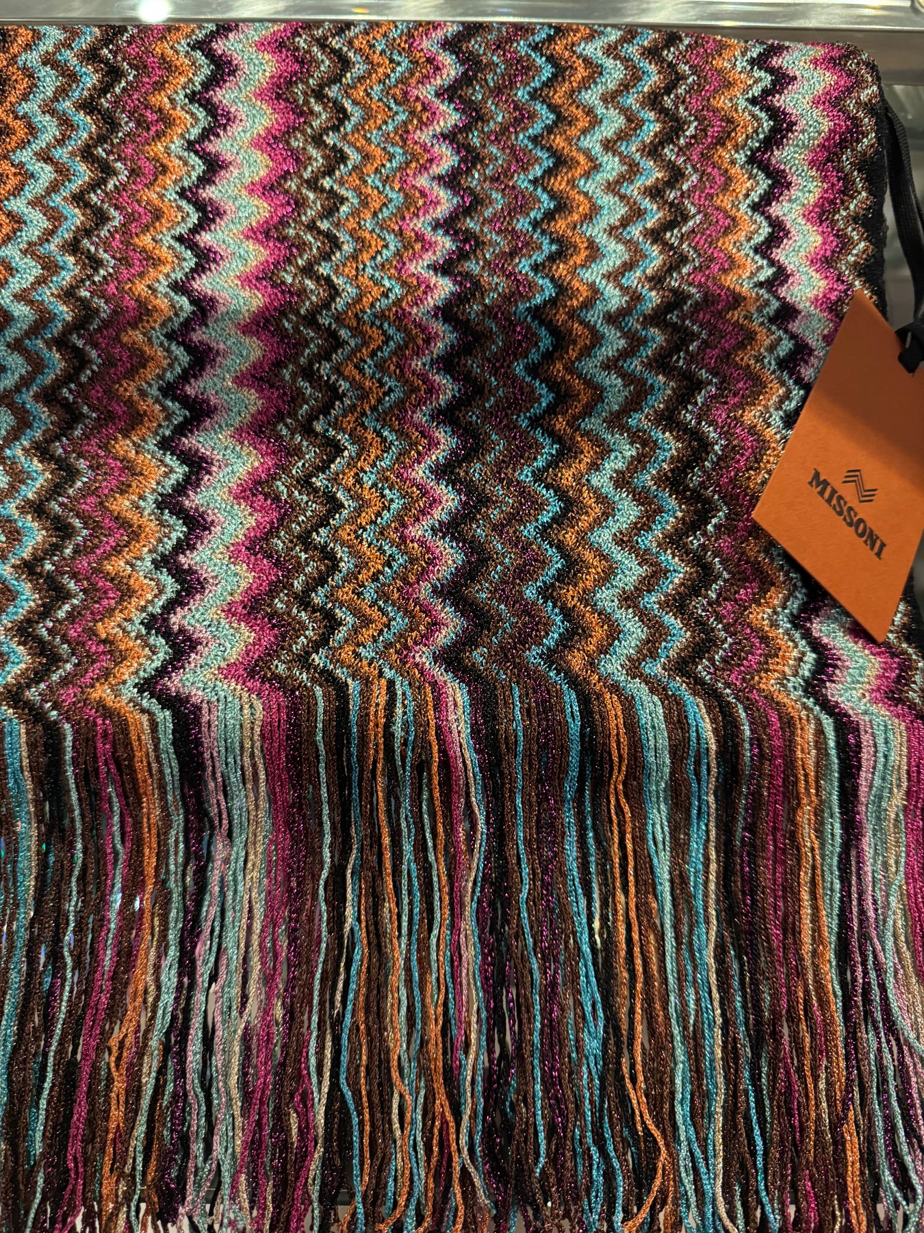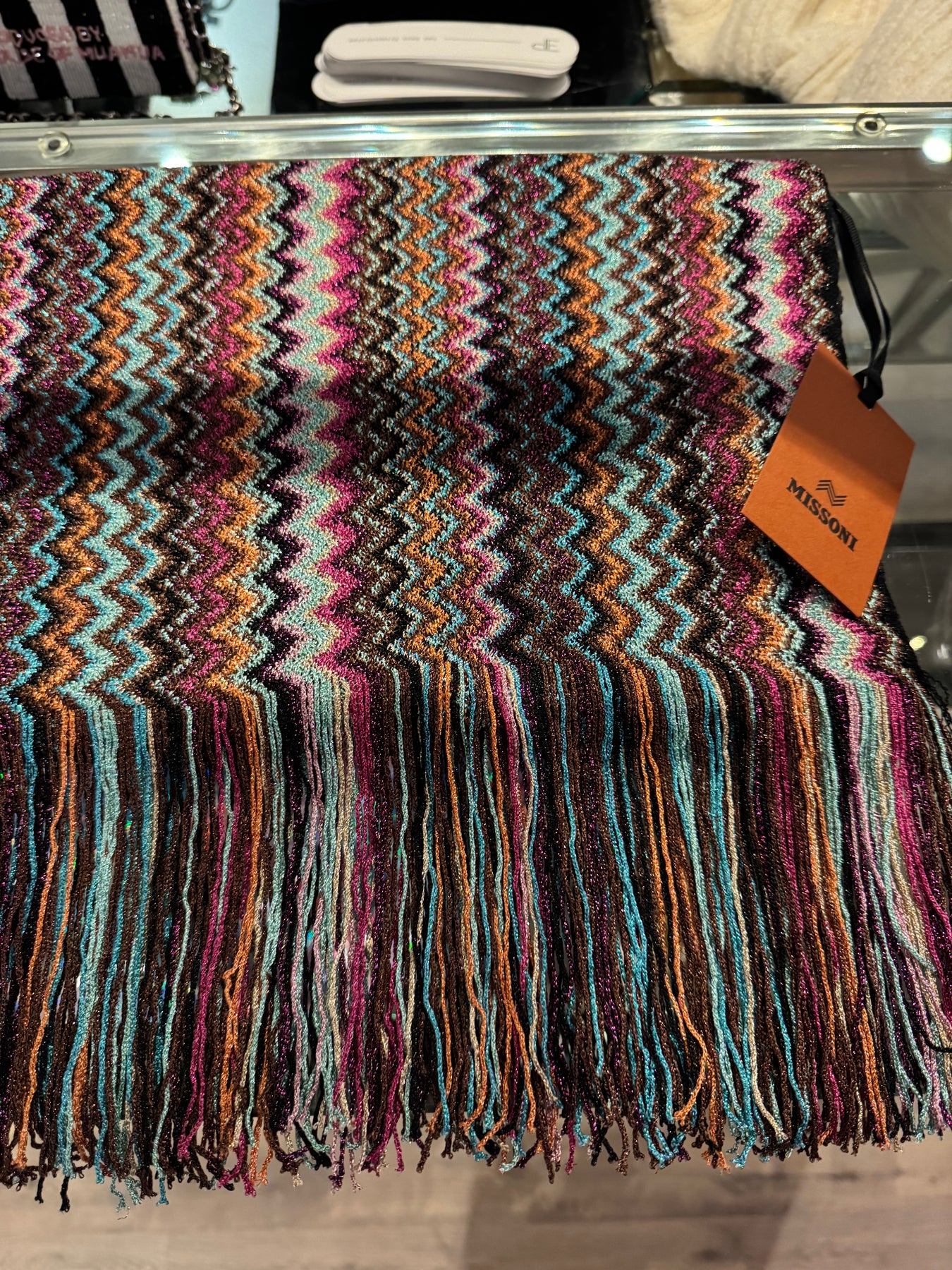 A luxurious Missoni scarf in warm burnt tones, woven with subtle Lurex threads for a touch of shimmer and elegance.