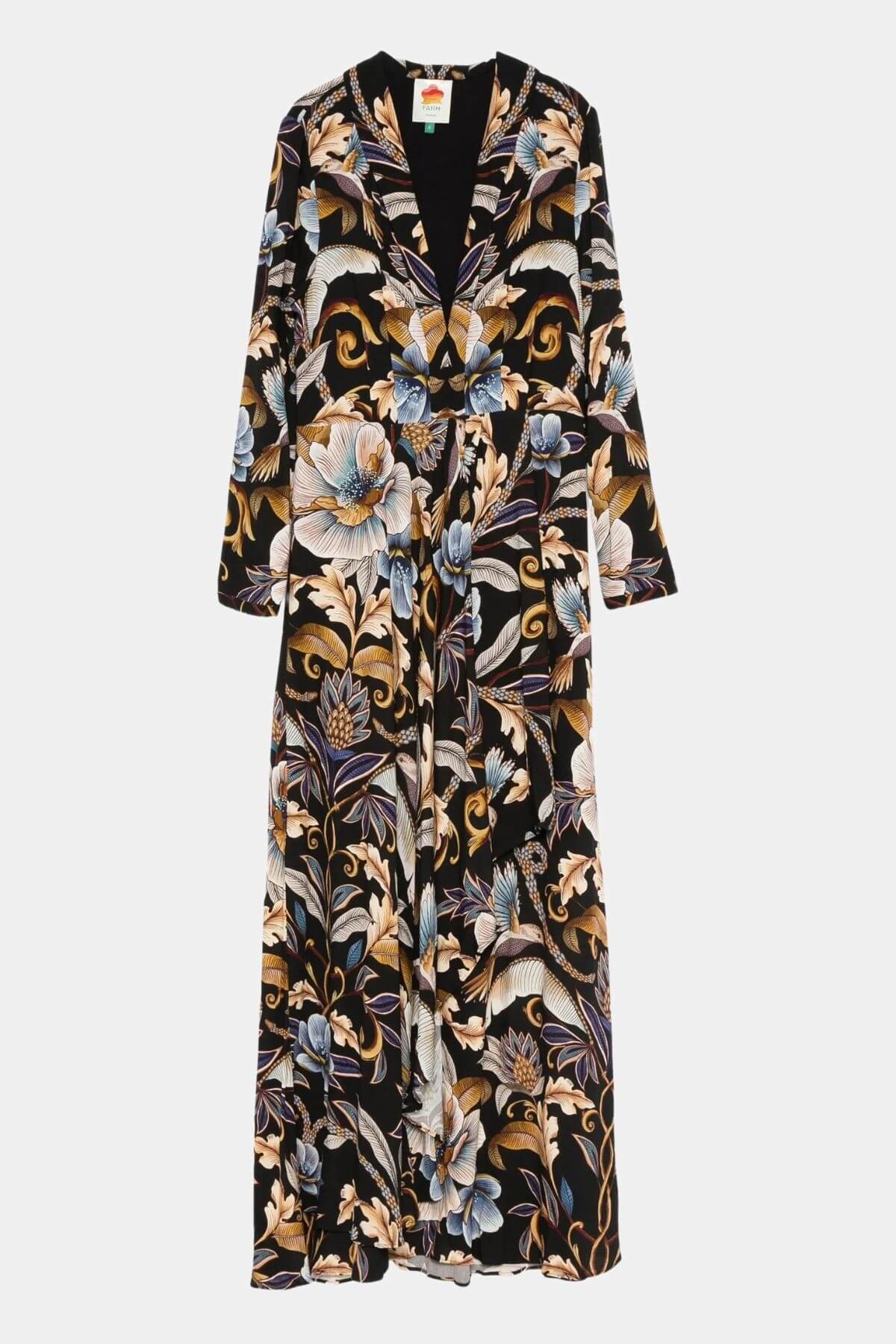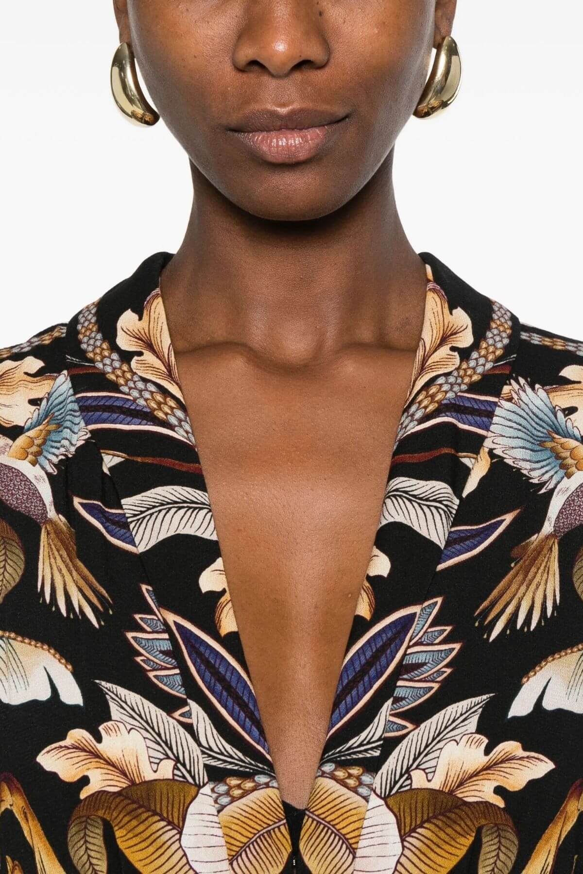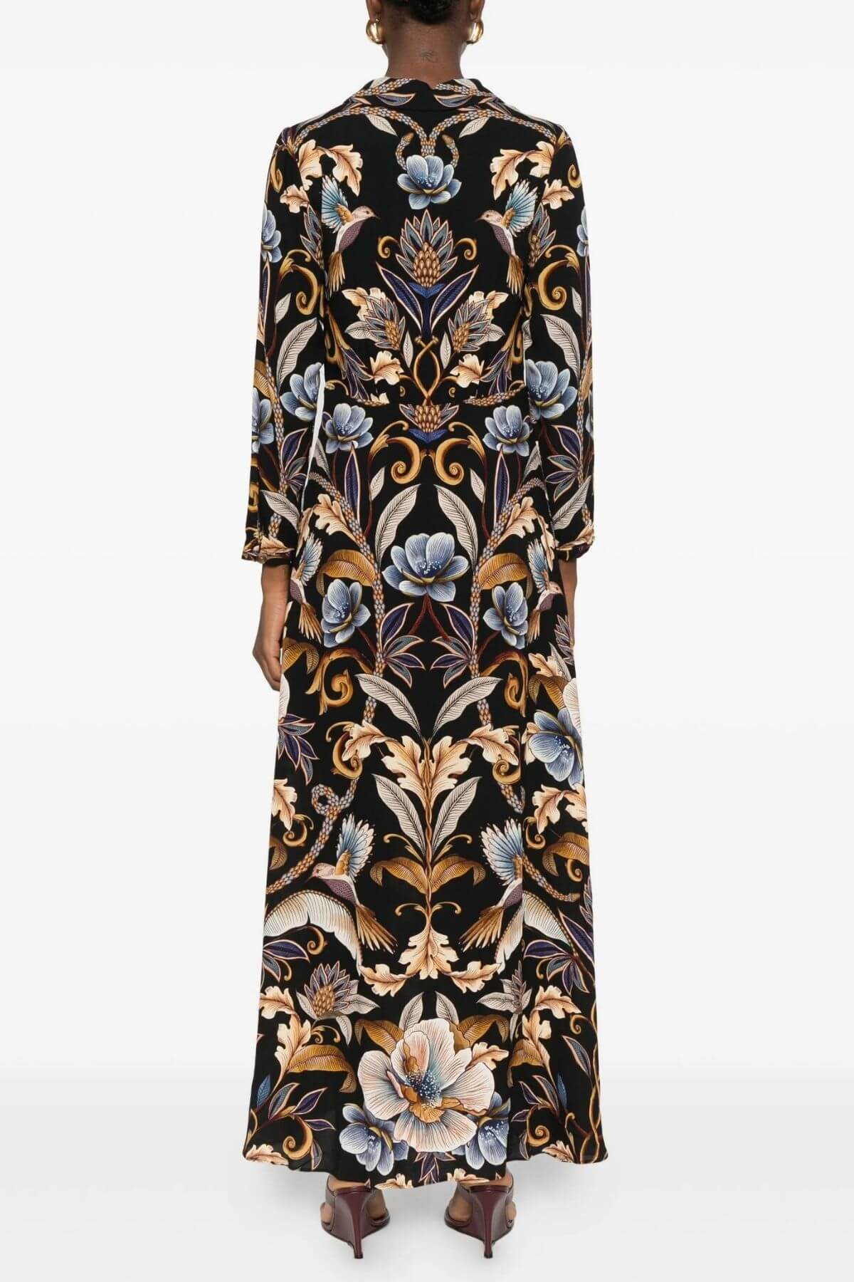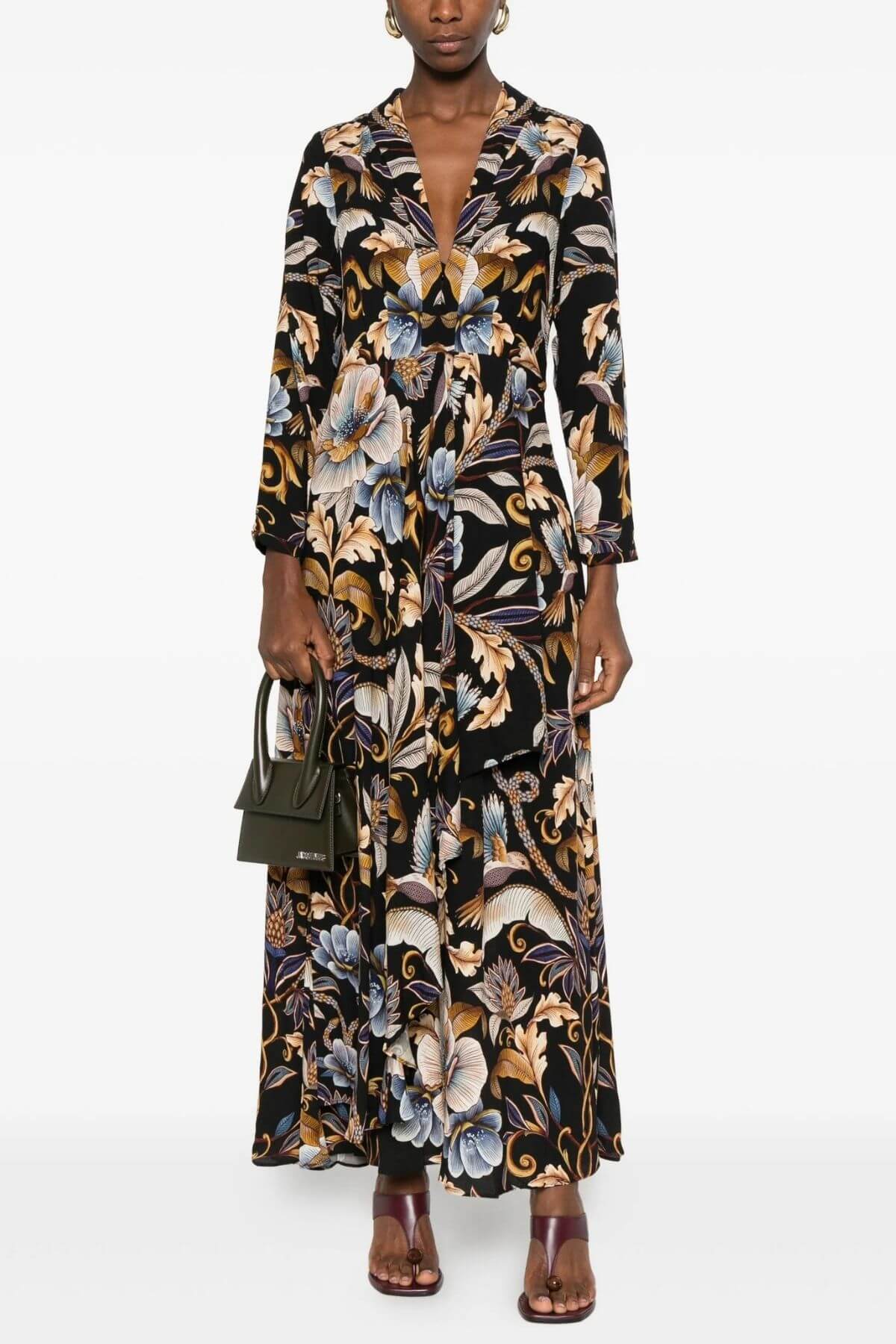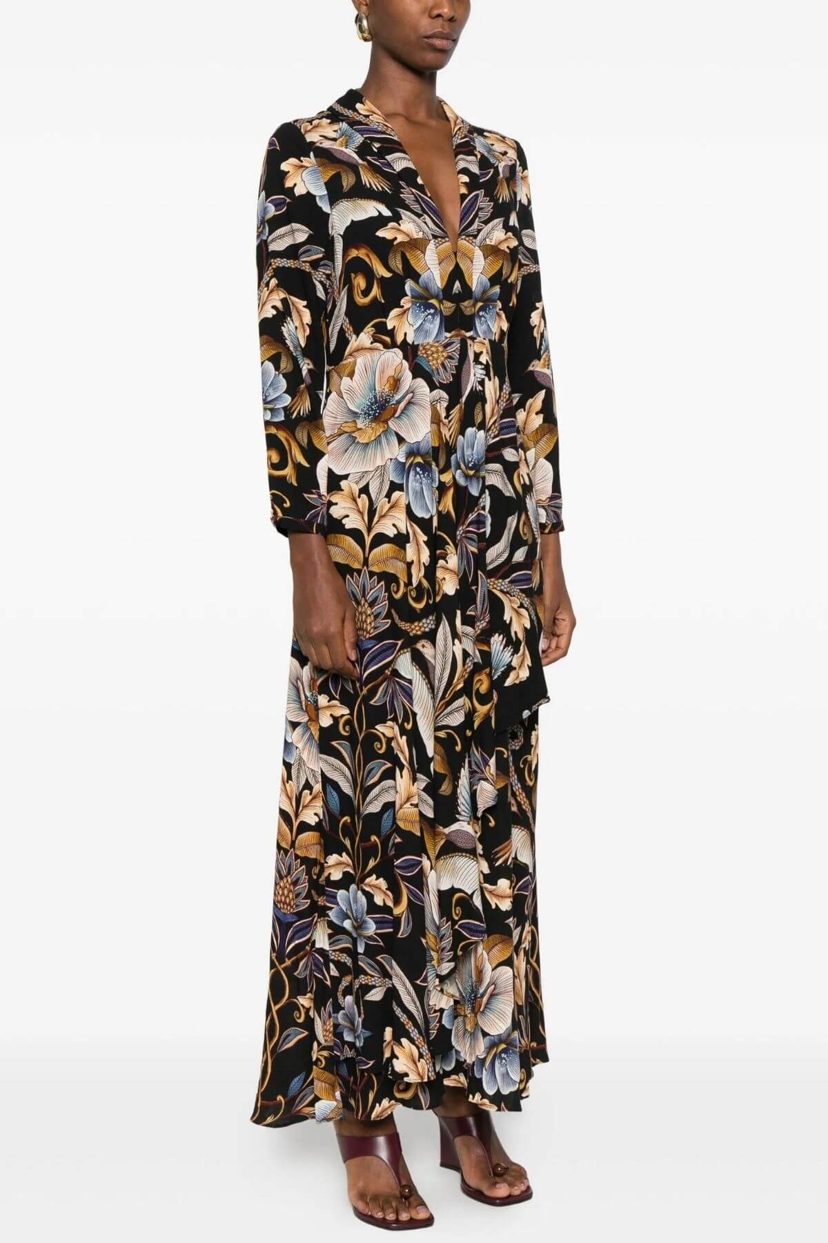 Flowing long-sleeve dress with deep V-neckline, vibrant tropical florals, and flying bird motifs in golden, blue, and chocolate tones.