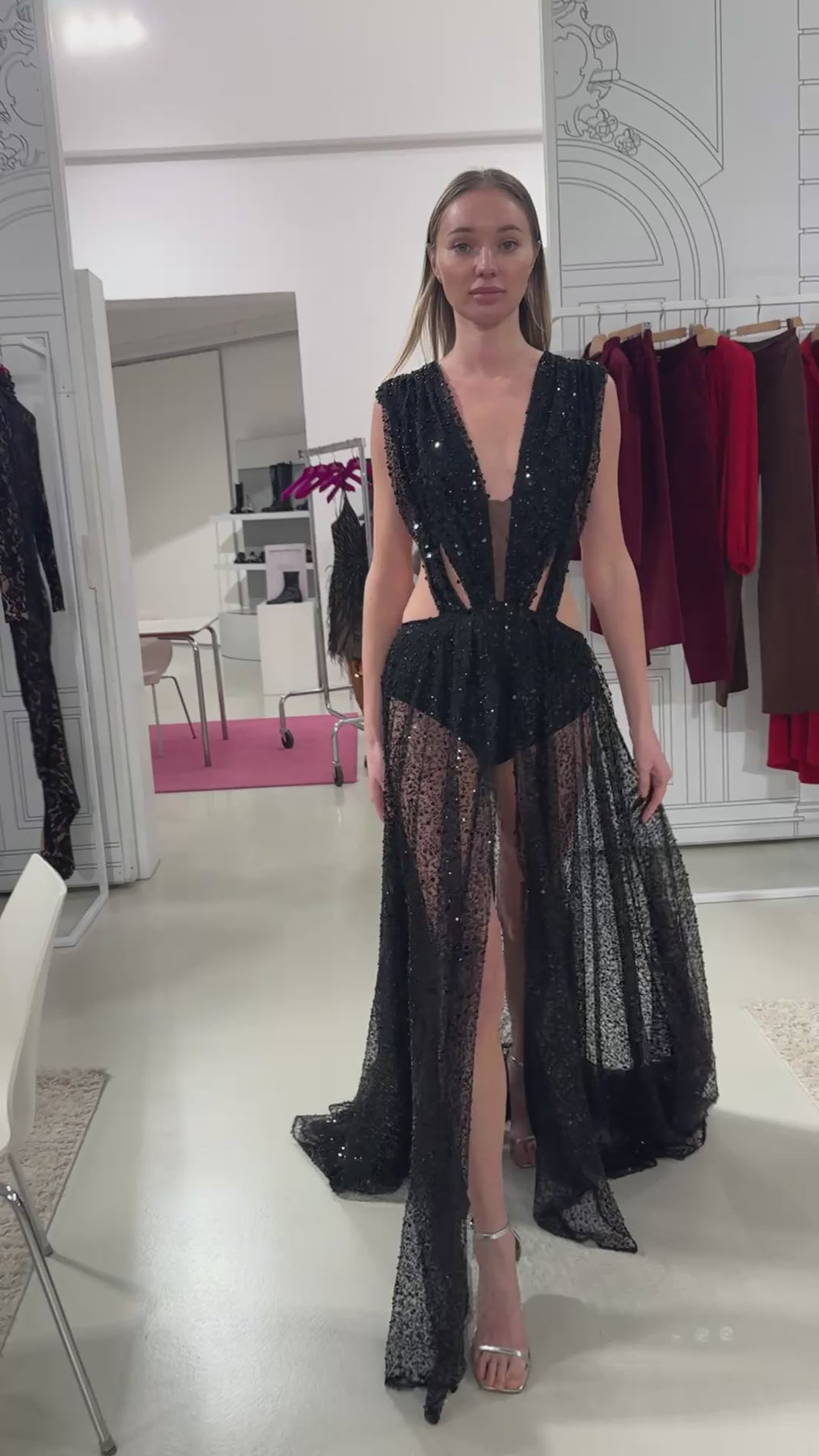 Sheer elegance meets daring design in this black sequin gown with cutout details and a dramatic thigh-high slit. From Couture is Forever – where glamour never fades.