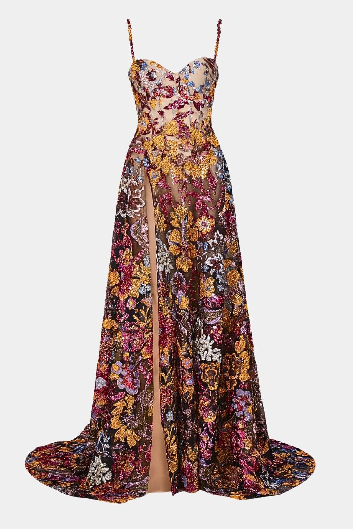 A breathtaking symphony of color, this sheer floral gown dazzles with hand-embellished sequins and daring thigh-high slits.