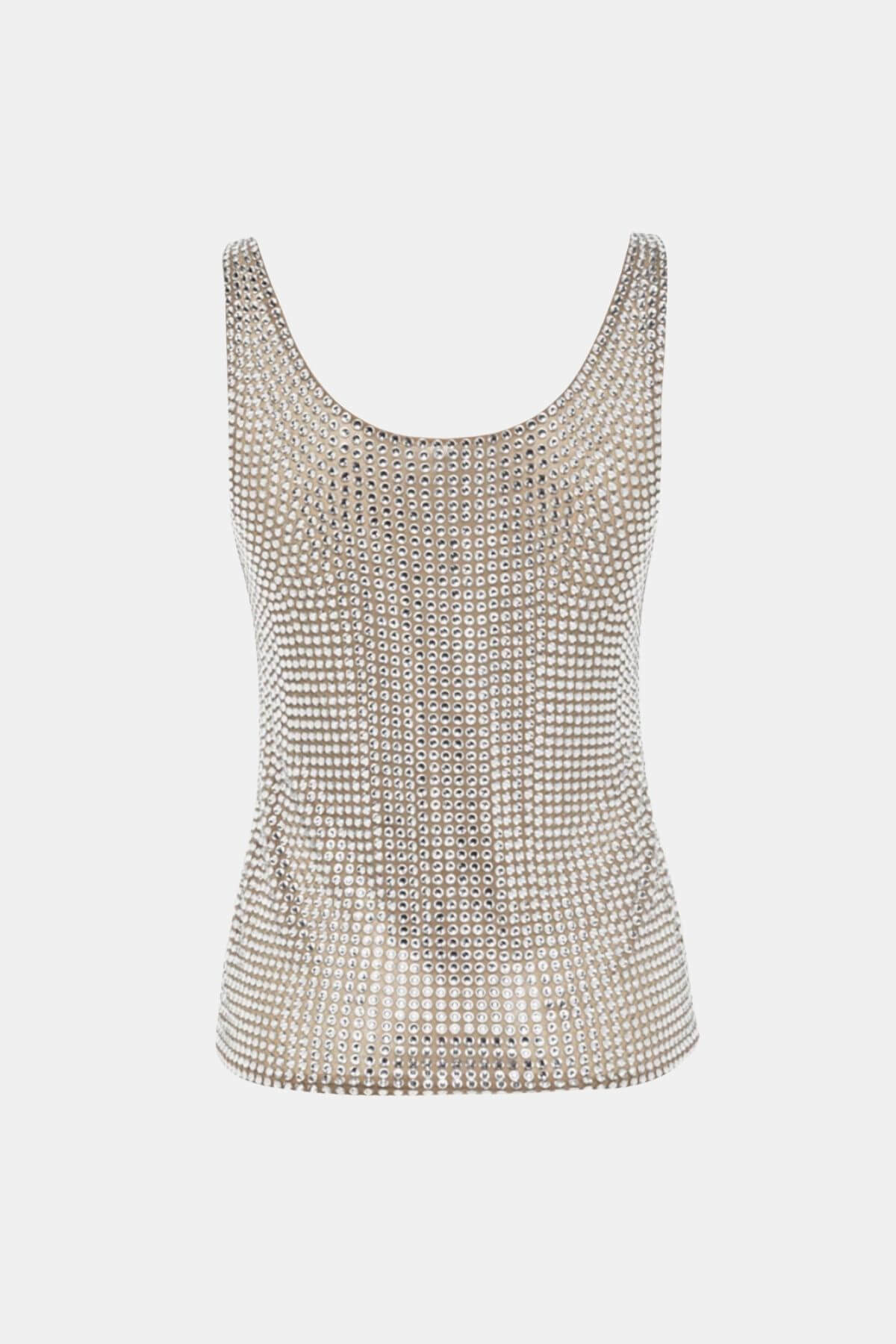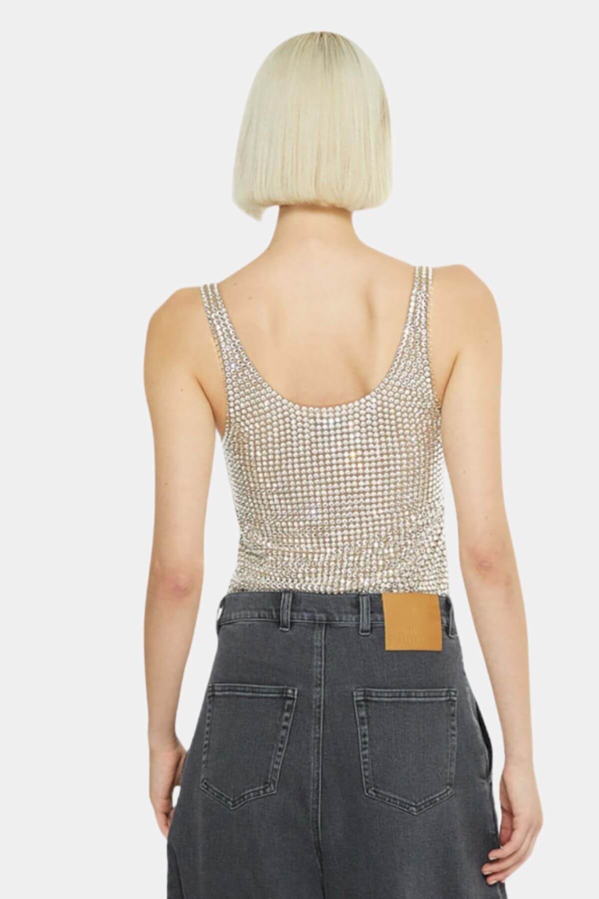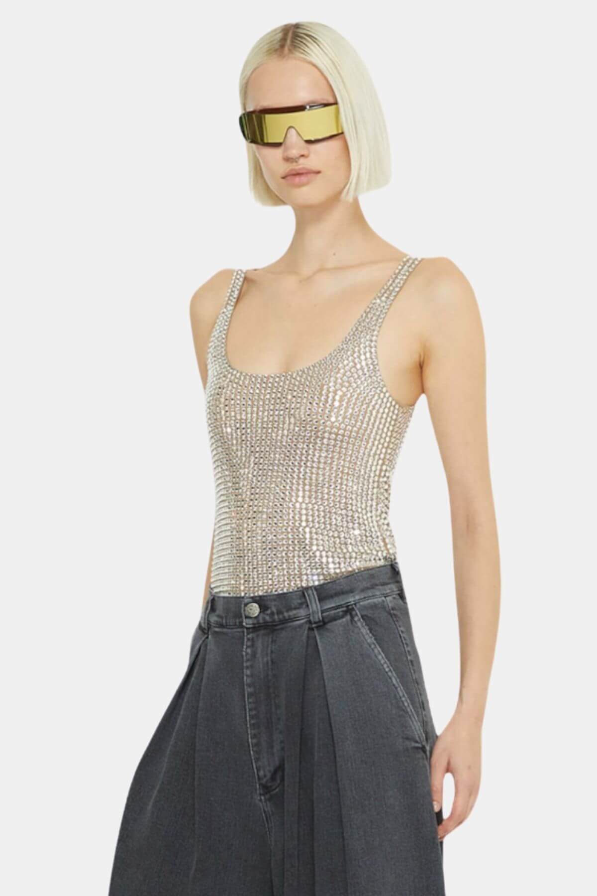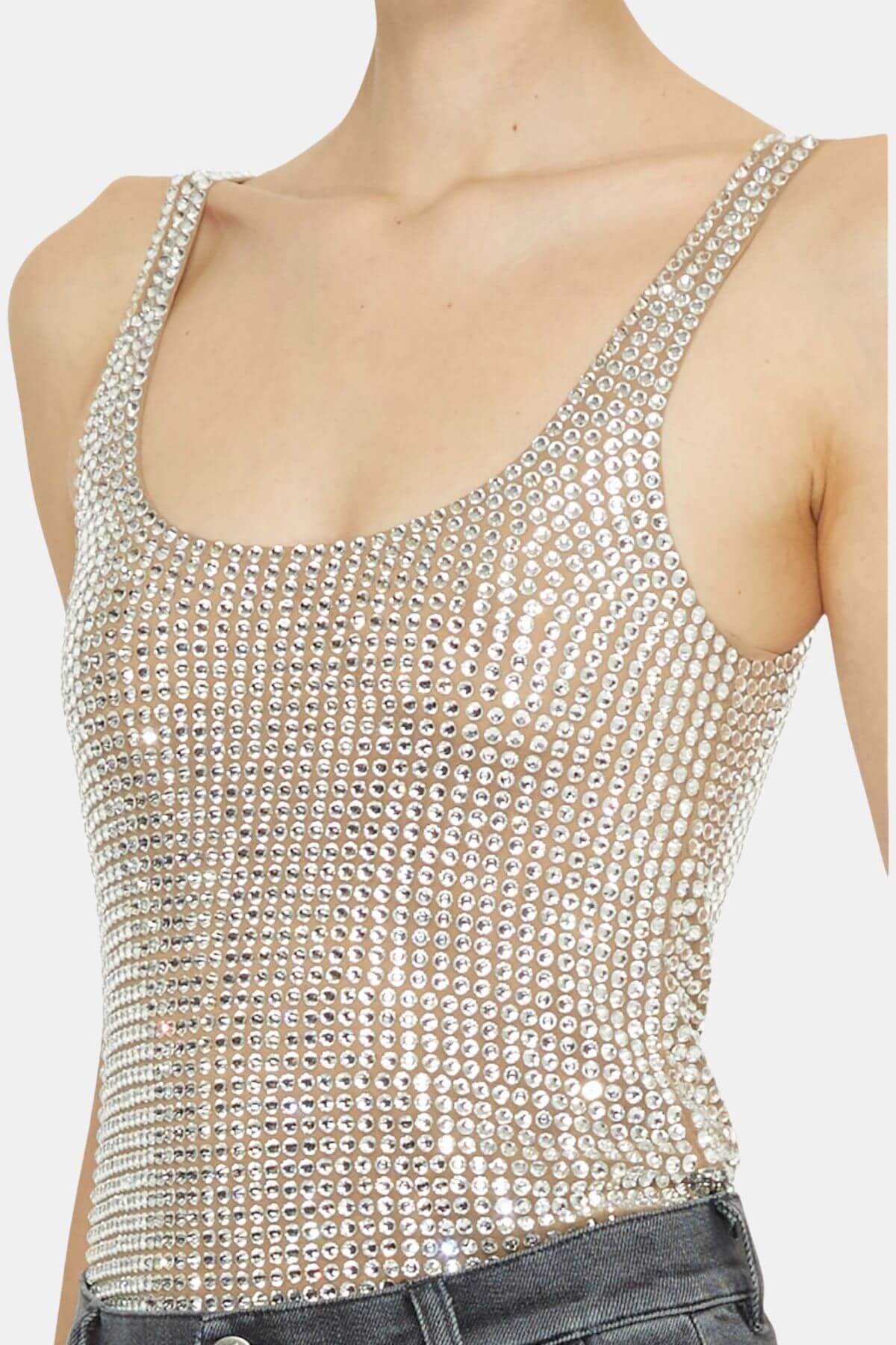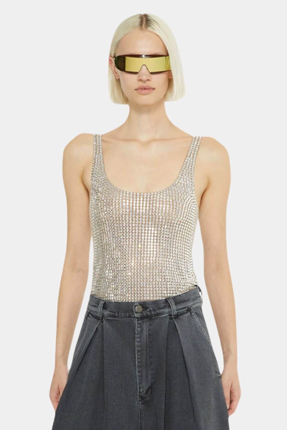 A stunning fusion of elegance and modern allure, the Crystal Embellished Top is adorned with hundreds of hand-set Swarovski stones on a soft, nude-toned base. Designed to catch the light with every movement, this piece embodies effortless luxury — perfect for refined evenings and statement moments.