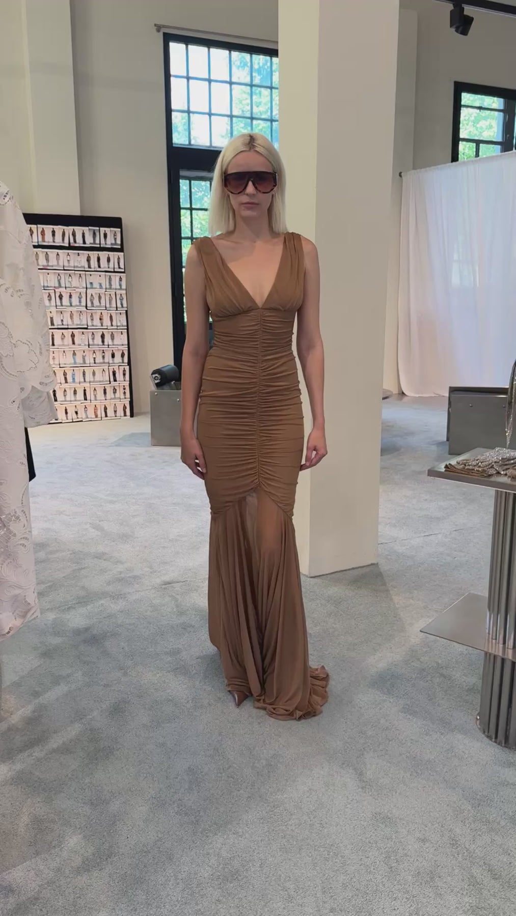 Elegant long dress crafted from stretch viscose jersey with a flattering mermaid silhouette. Designed with a deep V-neckline, sleeveless cut, and soft ruching at both front and back for a sculpted fit. Finished with a discreet side zip closure for ease and comfort. A timeless piece ideal for evening events and special occasions.