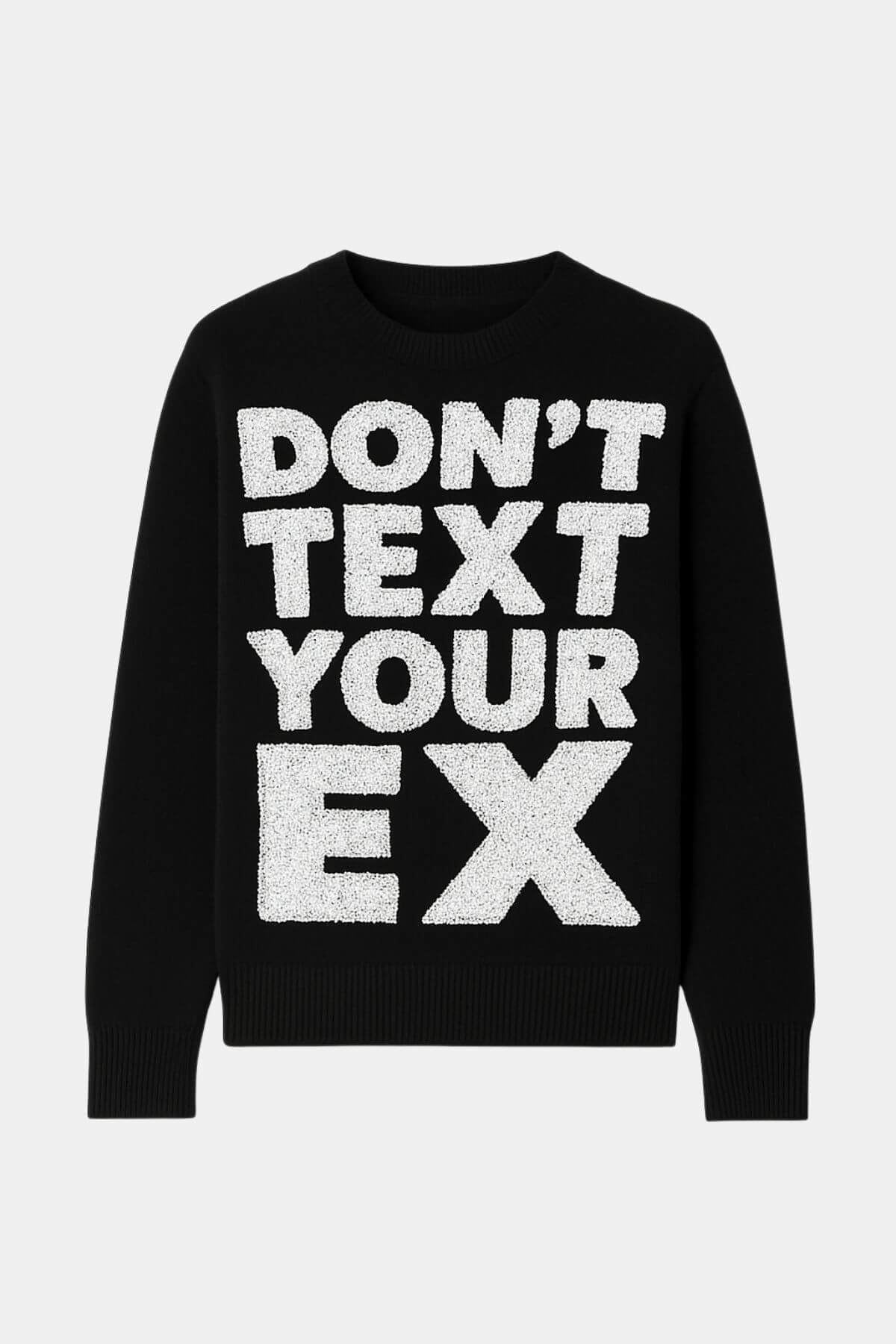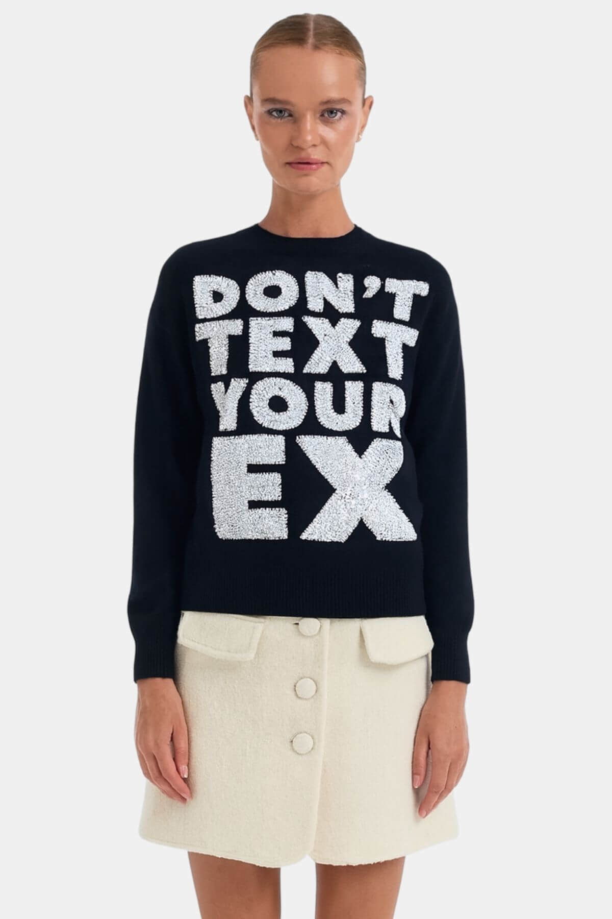 Crafted from a luxurious merino wool blend, this statement sweater features hand-sewn white sequins spelling out “DON’T TEXT YOUR EX.” The soft knit offers warmth without weight, while the regular fit provides effortless comfort and timeless wearability. Perfect for adding a bold, playful touch to your winter wardrobe.