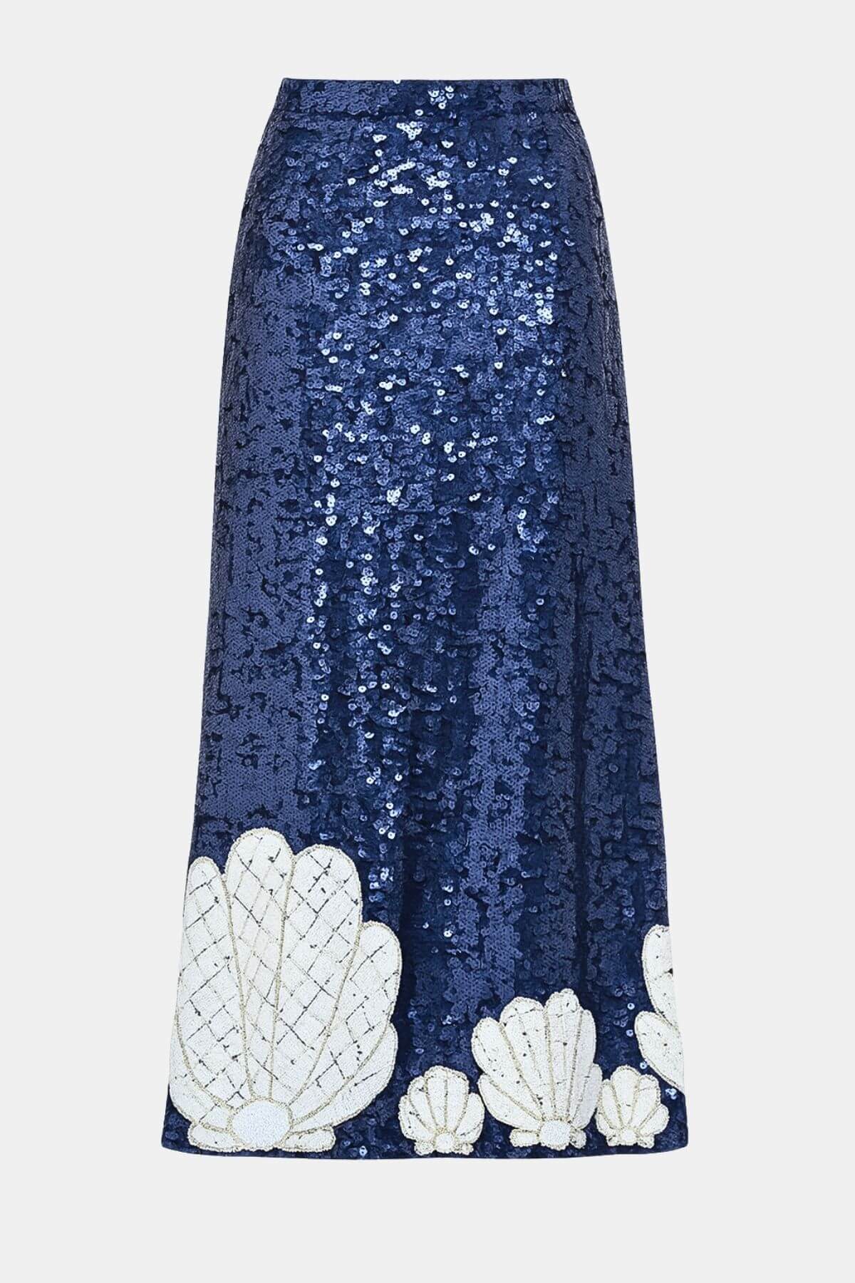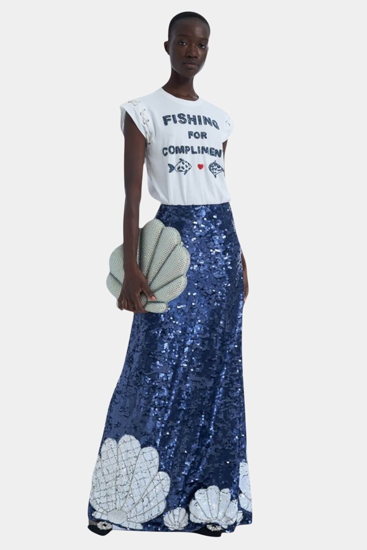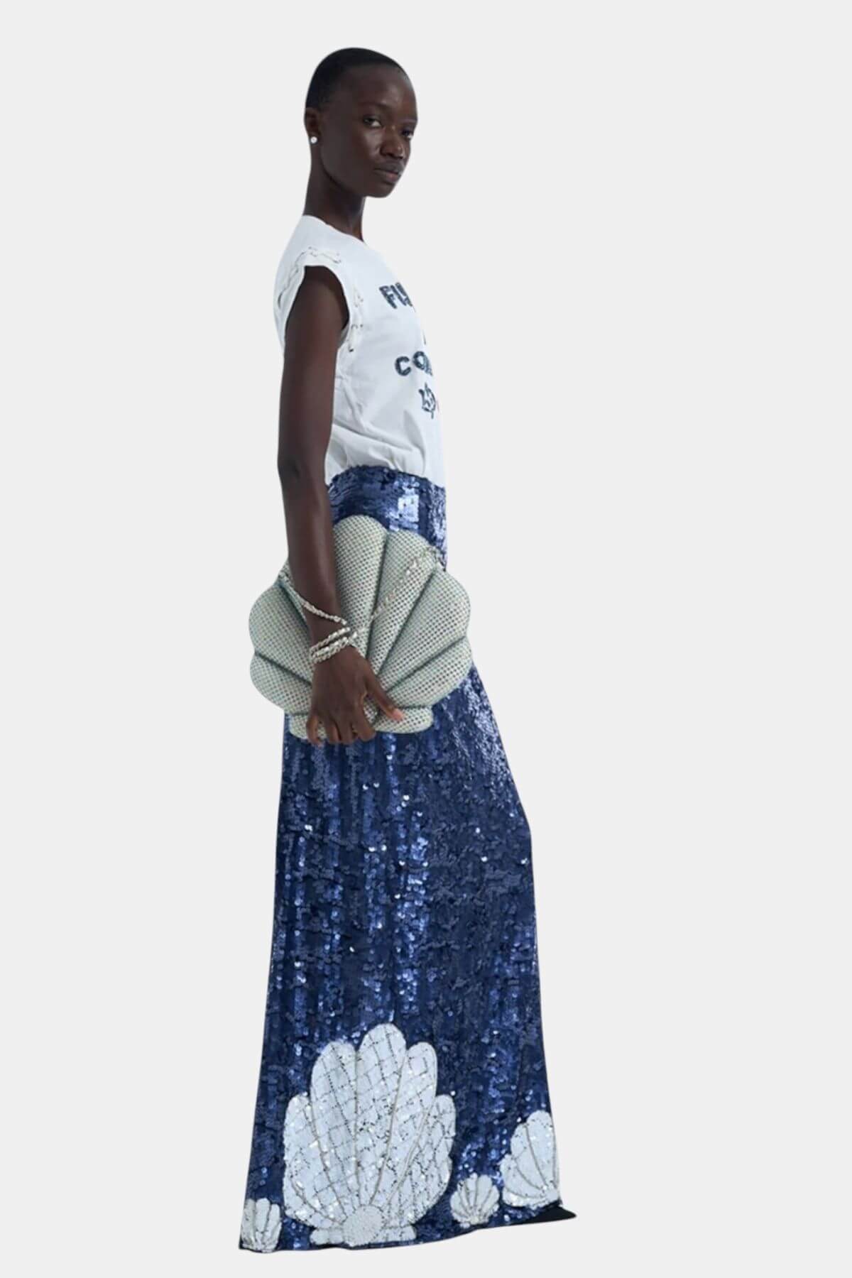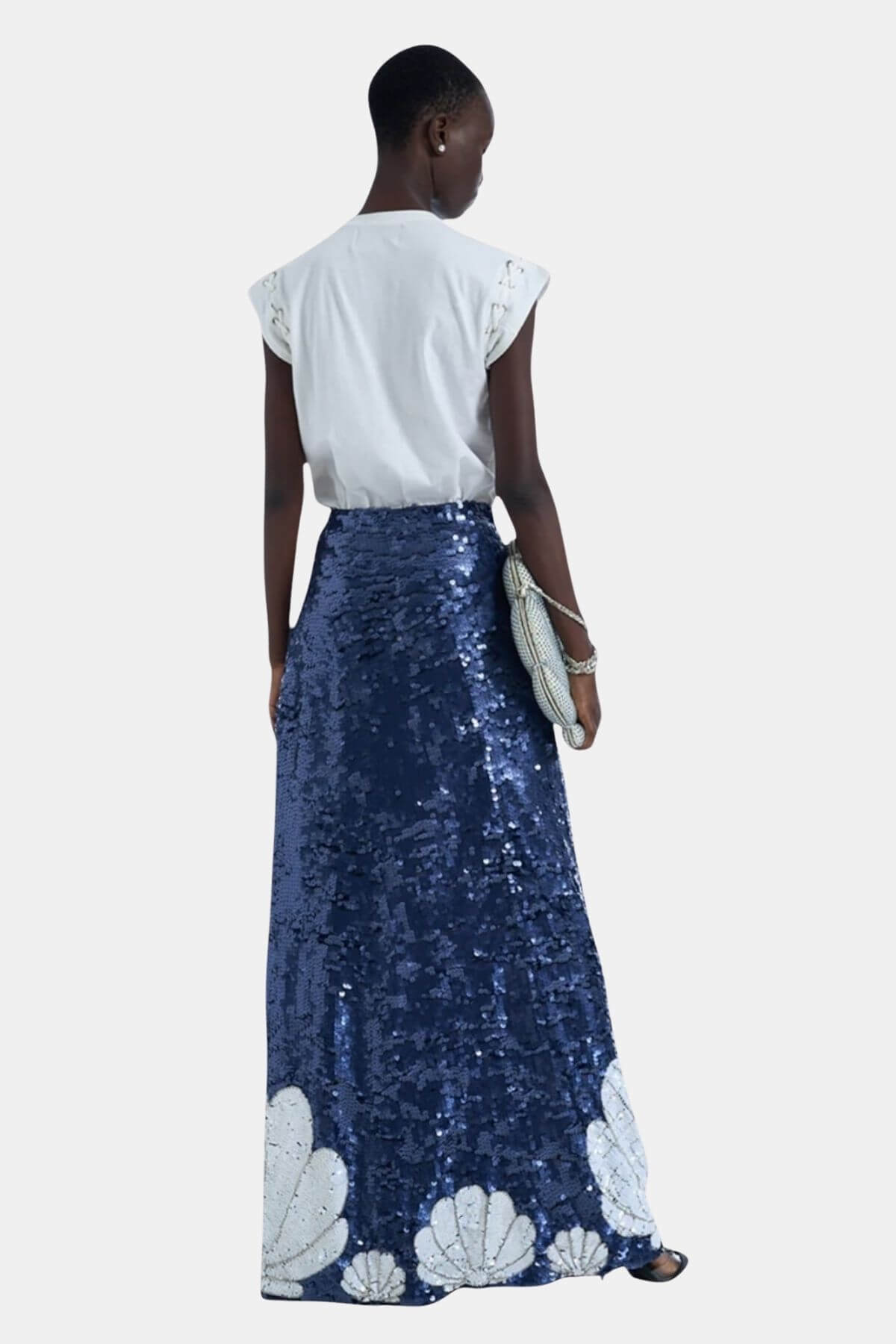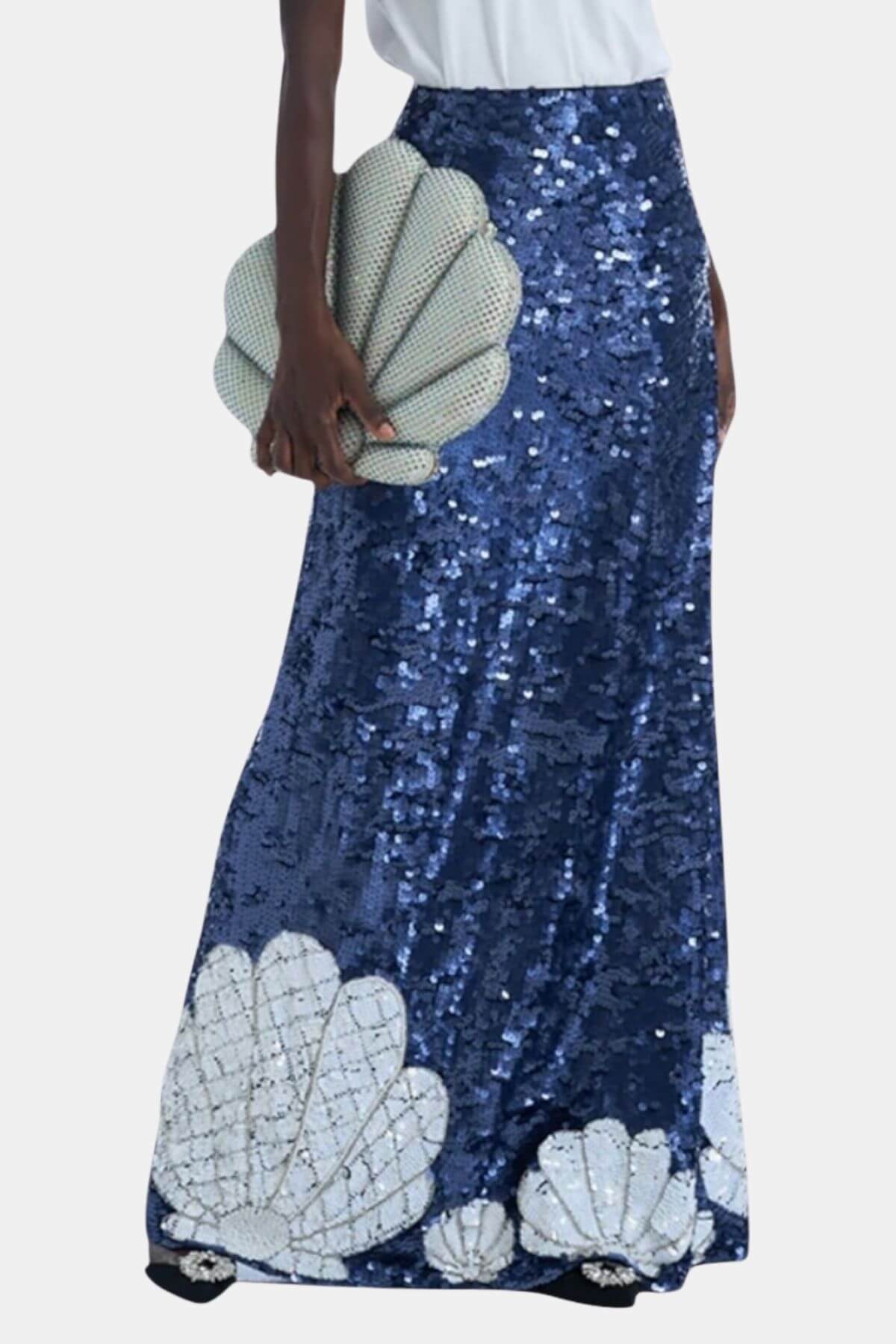 Steal the show in this House of Mua Mua long sequin sea shells skirt. It is a long maxi skirt in colour navy blue. This skirt will elevate any outfit, adding a touch of glamour.