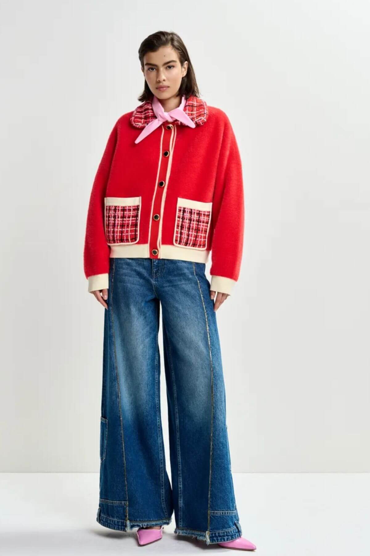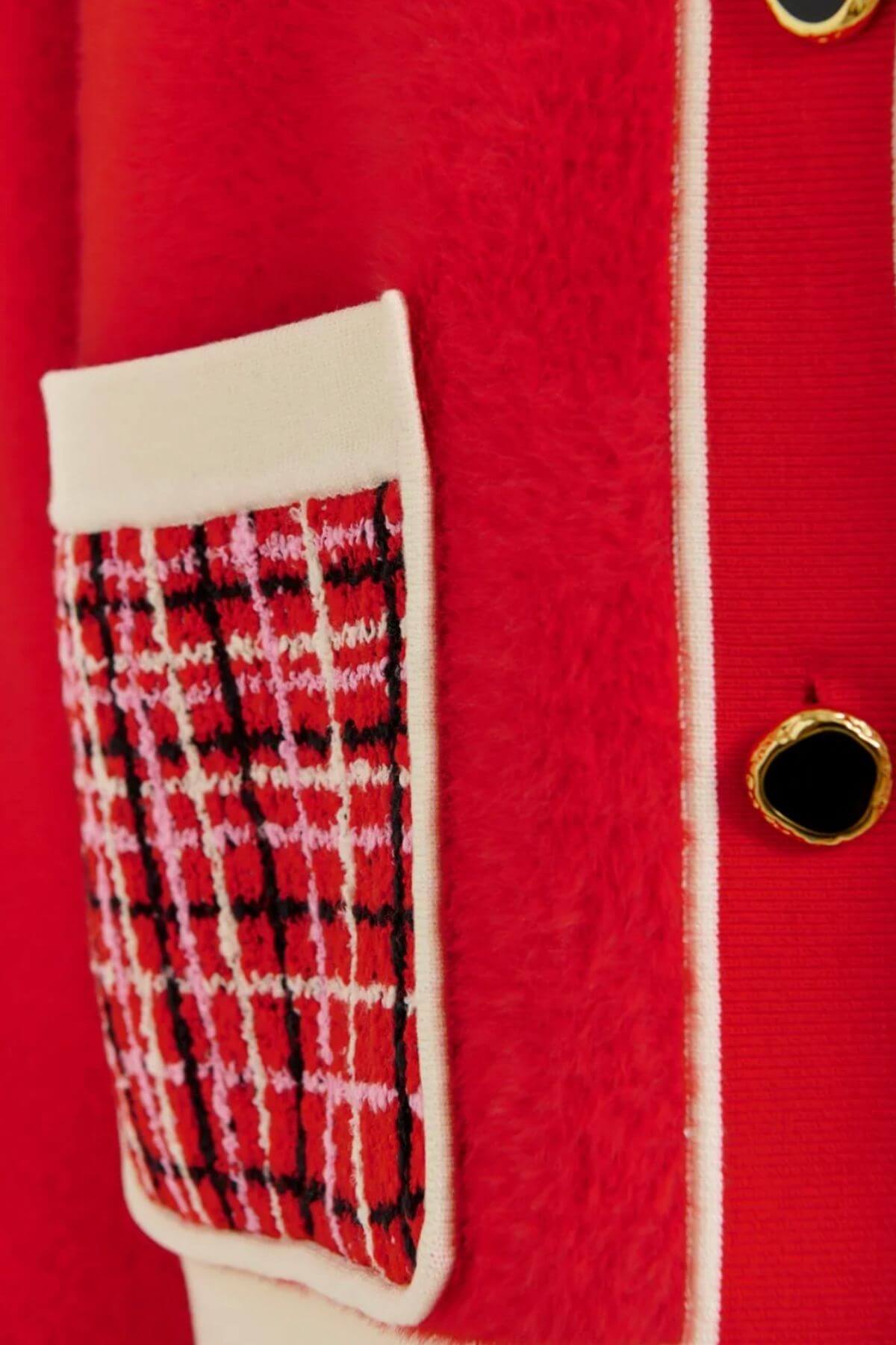 Designed for a relaxed fit, this cardigan is crafted from a soft and textured fabric that adds depth to the silhouette. It features a contrast tweed collar and matching patch pockets, lending a tactile element to the design. Gold-tone button fastening and dropped shoulders enhance the laid-back construction, while neatly trims provide a polished finish.