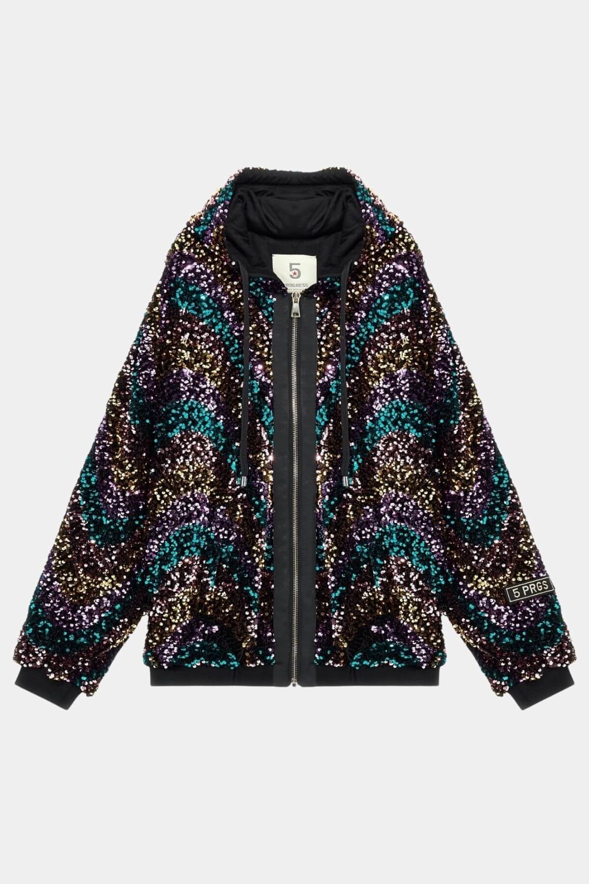 Sequined bomber jacket from 5 Progress in bold jewel tones. Features zip closure, drawstring hood, and embroidered patch at sleeve.