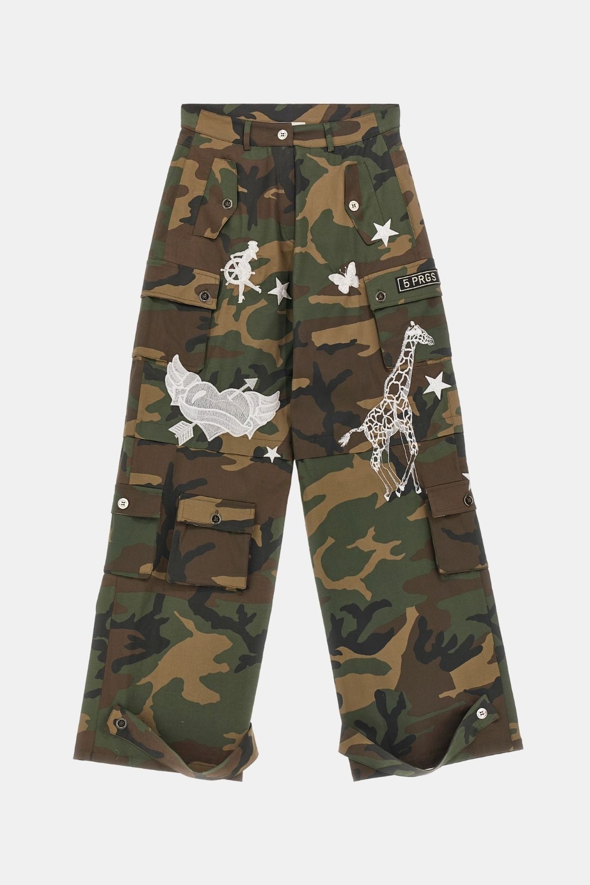 Camouflage cargo pants with a bold, streetwear-inspired design. Featuring multiple utility pockets and unique embroidered graphic details, these pants combine functionality with standout style. A relaxed fit makes them perfect for everyday wear with an edgy twist.