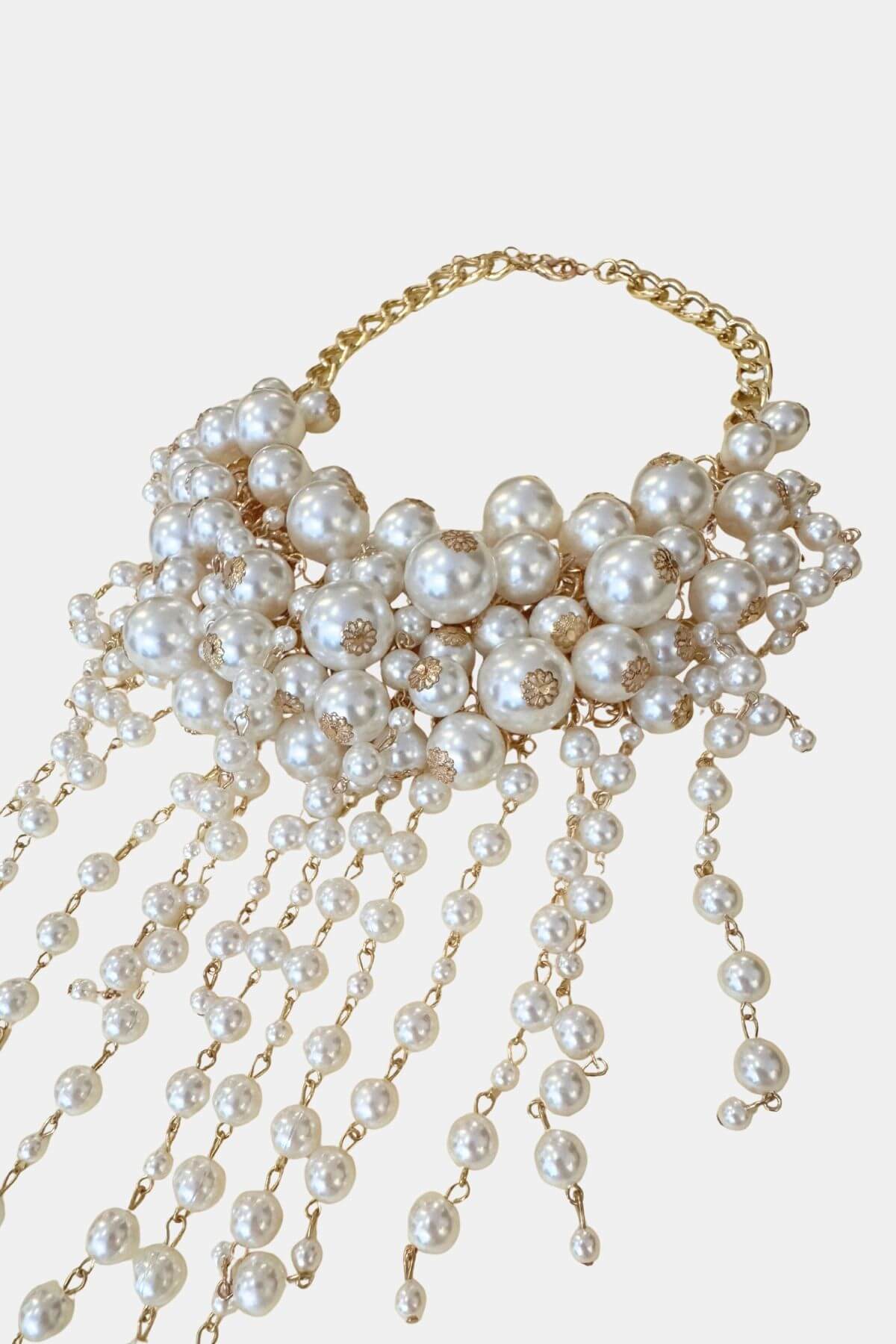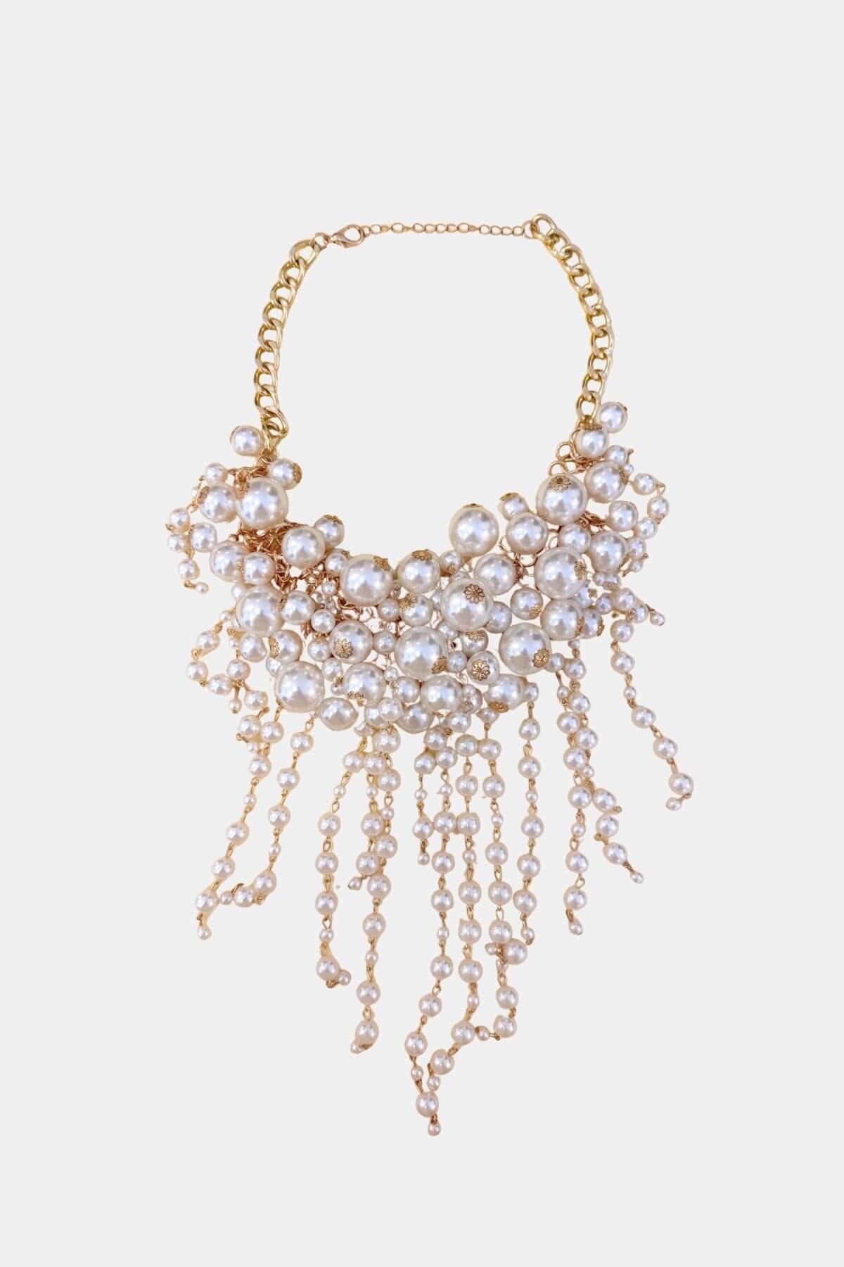 A bold and glamorous statement necklace featuring cascading clusters of luminous faux pearls on a gold-tone chain. Perfect for elevating any evening look with elegance and drama.