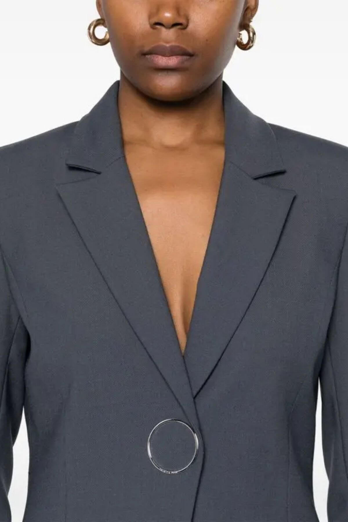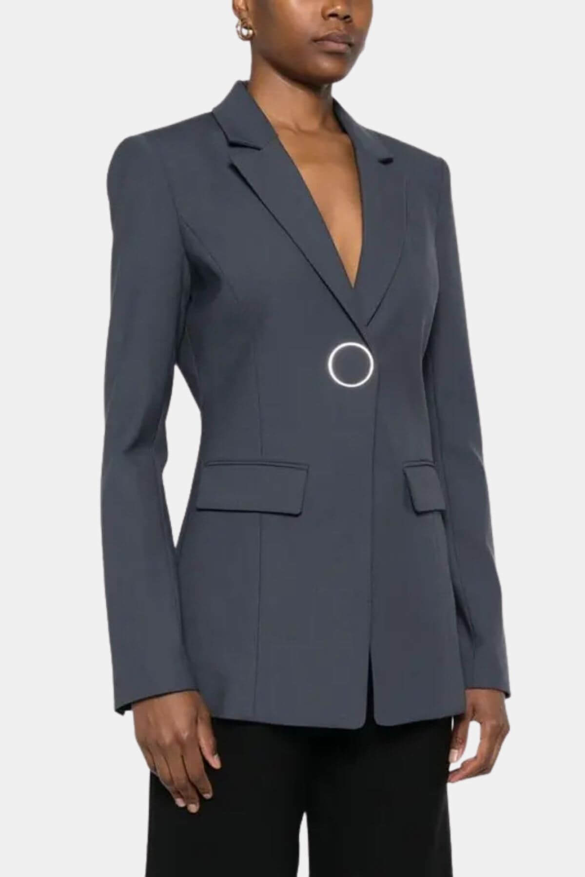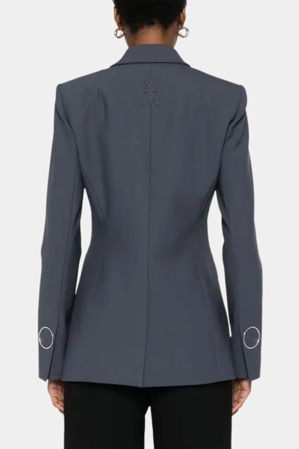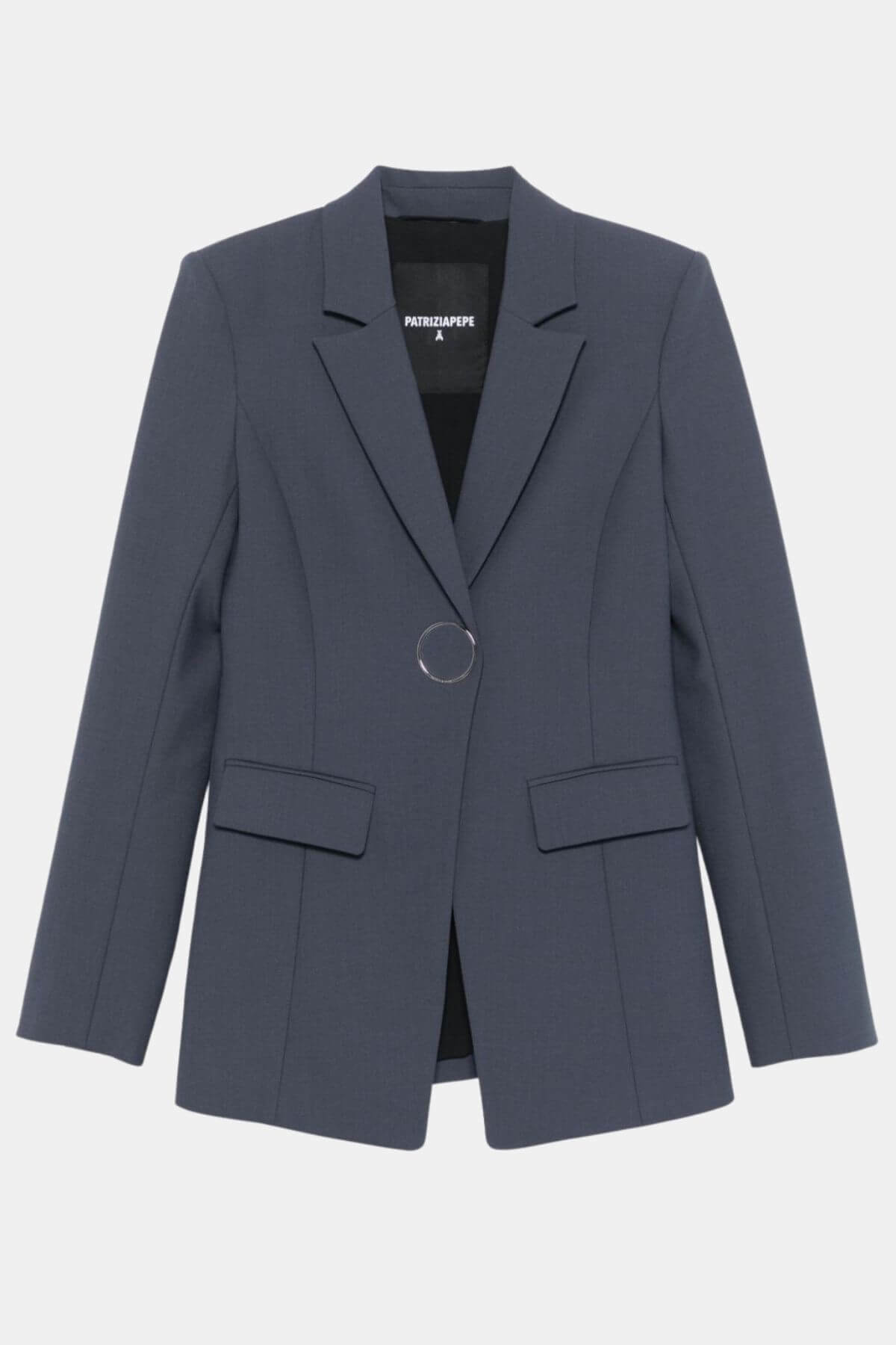 This blazer by Patrizia Pepe features a gabardine weave, a front press-stud fastening, notched lapels, shoulder pads, long sleeves, press-stud fastening cuffs, two side flap pockets, a central rear vent, a full lining, and a straight hem.