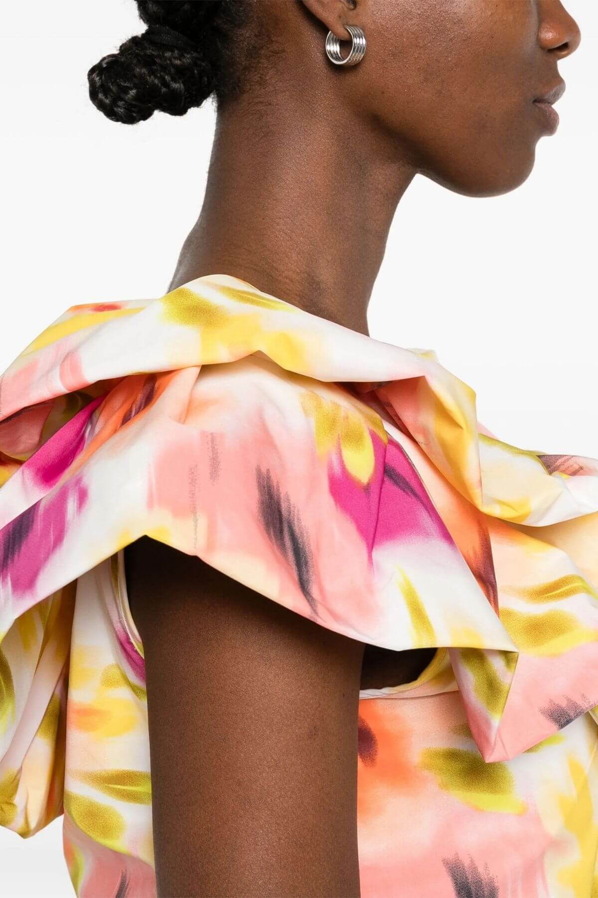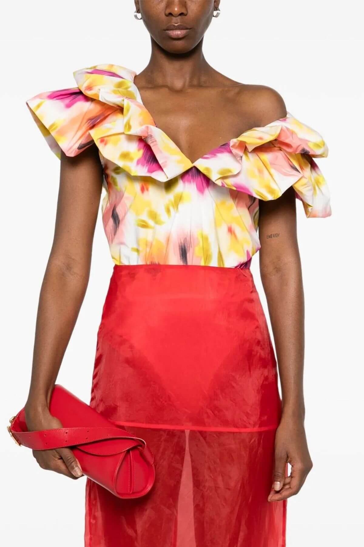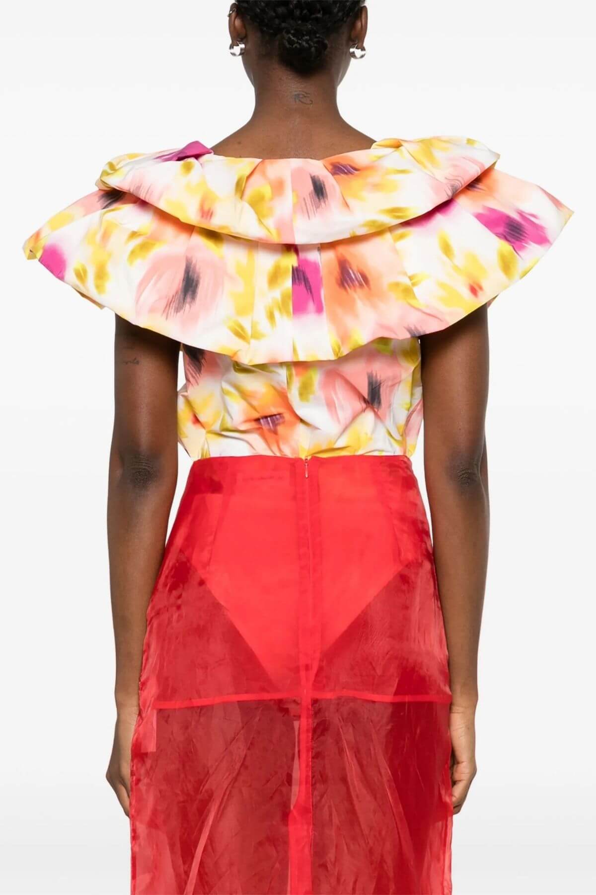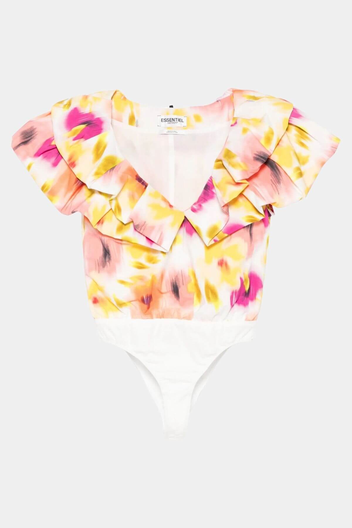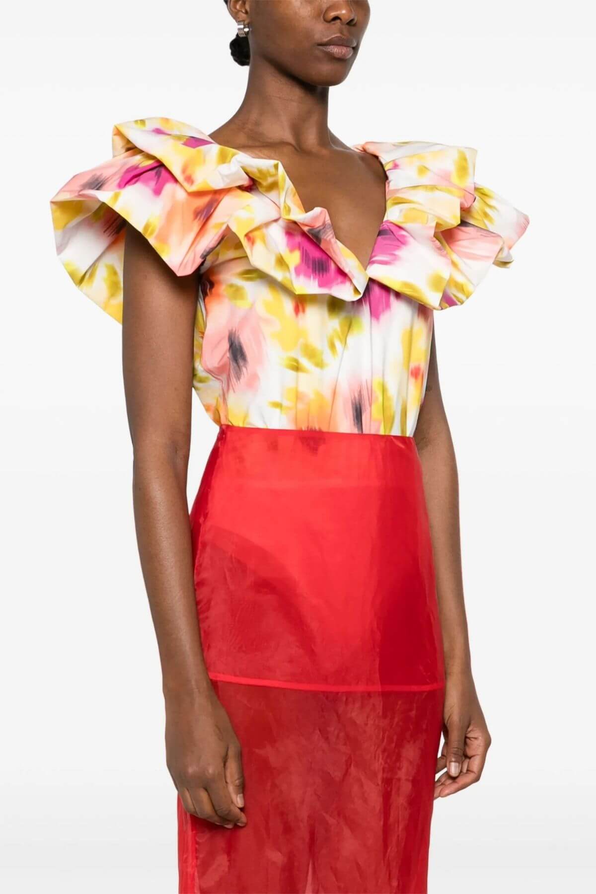 Elevate your wardrobe with this statement bodysuit, crafted from recycled polyester and designed with a close-fit underlining bodysuit. Featuring a flattering V-neckline, its standout feature is the layered ruffle details, adding volume and a bold, feminine flair to the design. Fully lined for a polished finish, it is perfect for pairing with high-waisted jeans, skirts, or tailored trousers for a chic, contemporary look