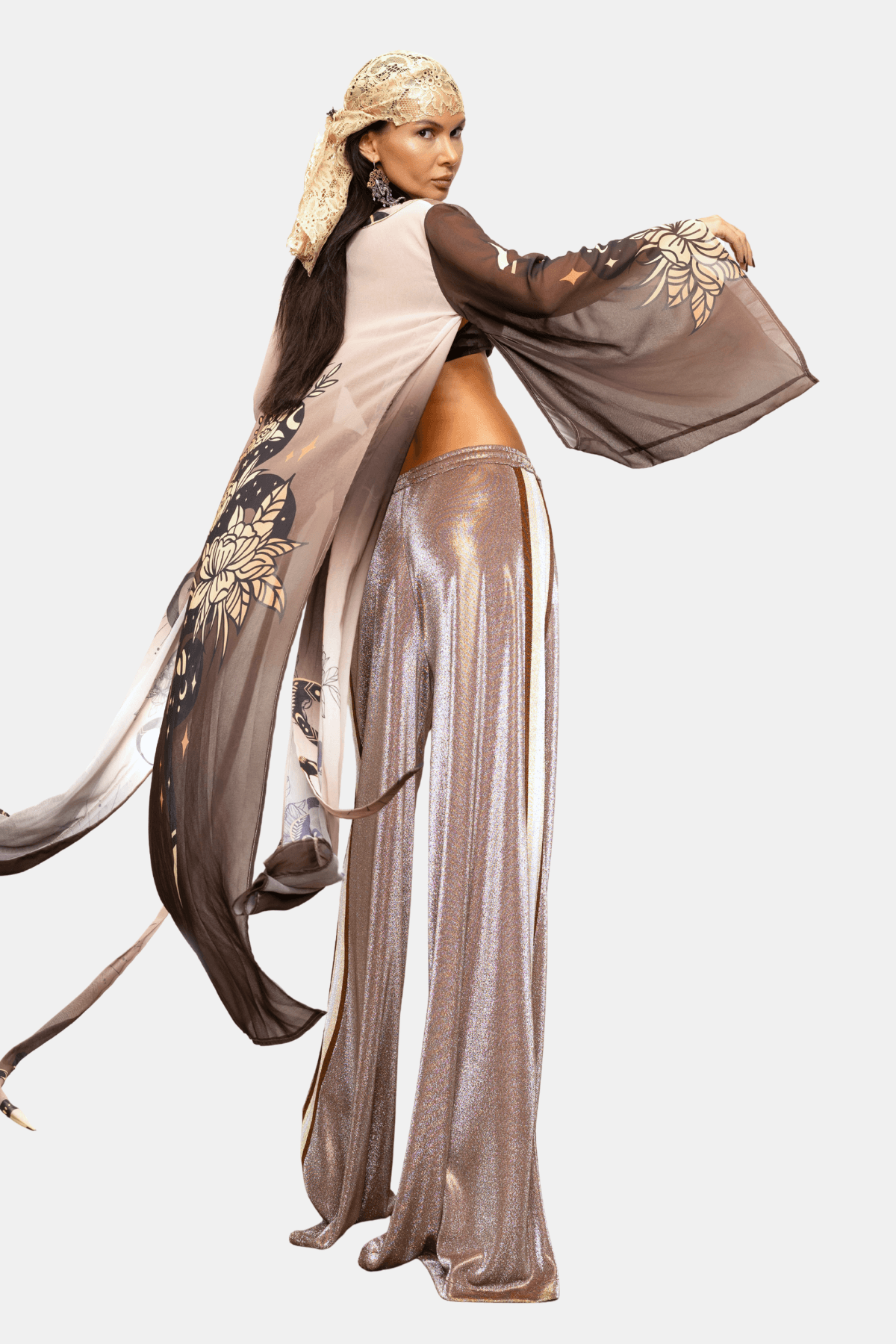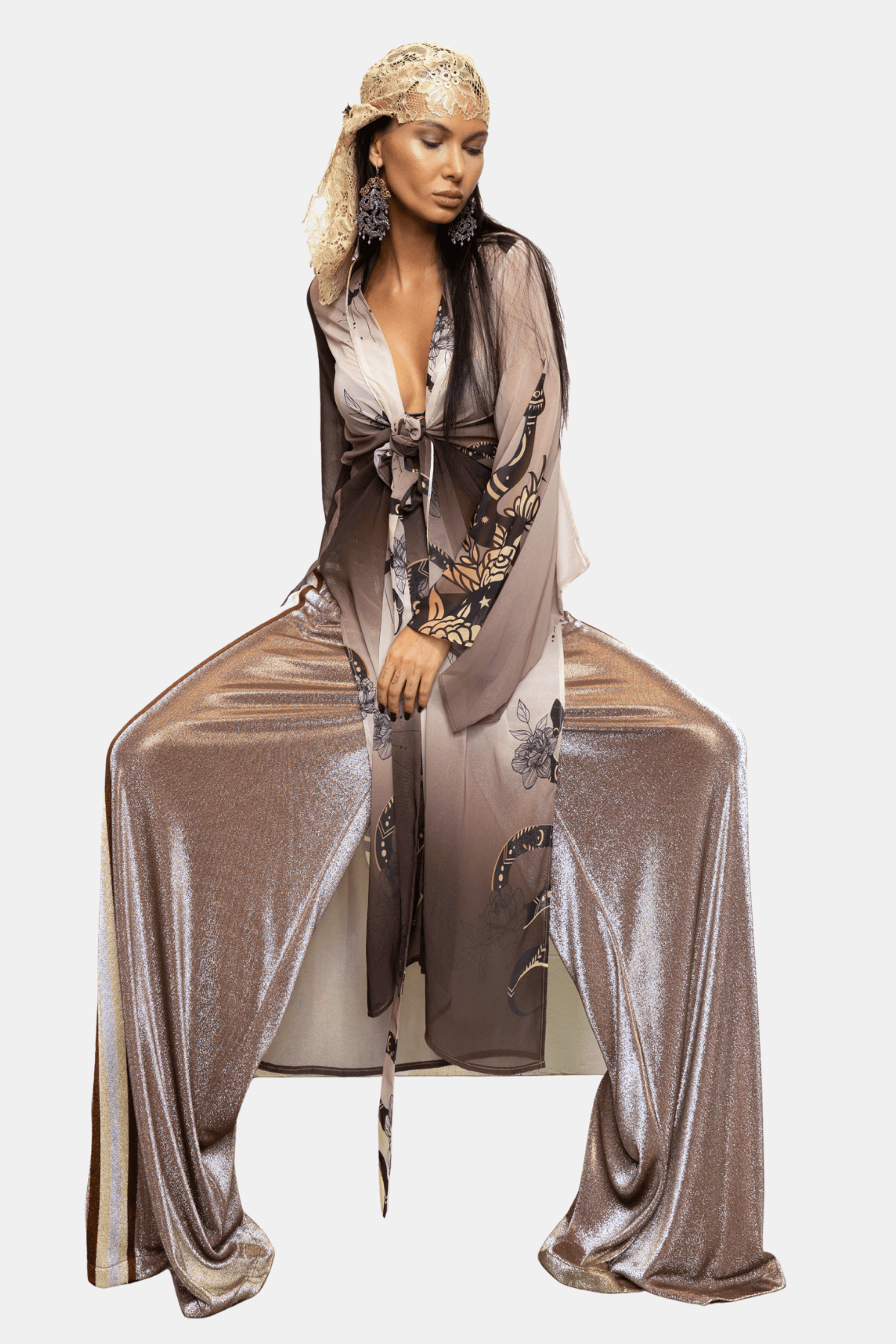 Elegant wide-leg trousers designed with a relaxed, flowing silhouette that moves beautifully with the body. The high-rise waist features an adjustable drawstring that allows for a comfortable and flexible fit. Crafted in a shimmering fabric with subtle sparkle, the trousers are finished with contrasting metallic side stripes that elongate the legs and add a refined statement detail. A versatile piece that combines comfort with a sleek, glamorous look.