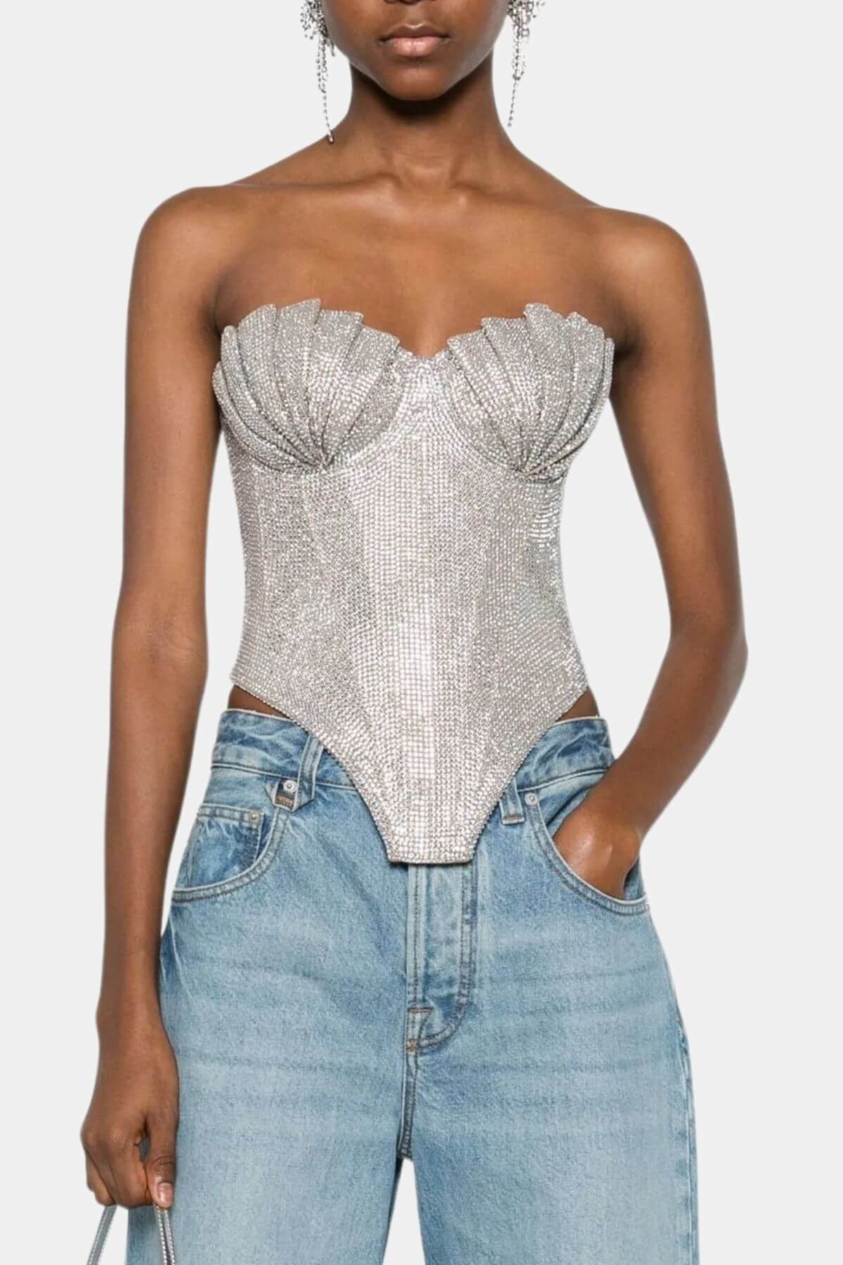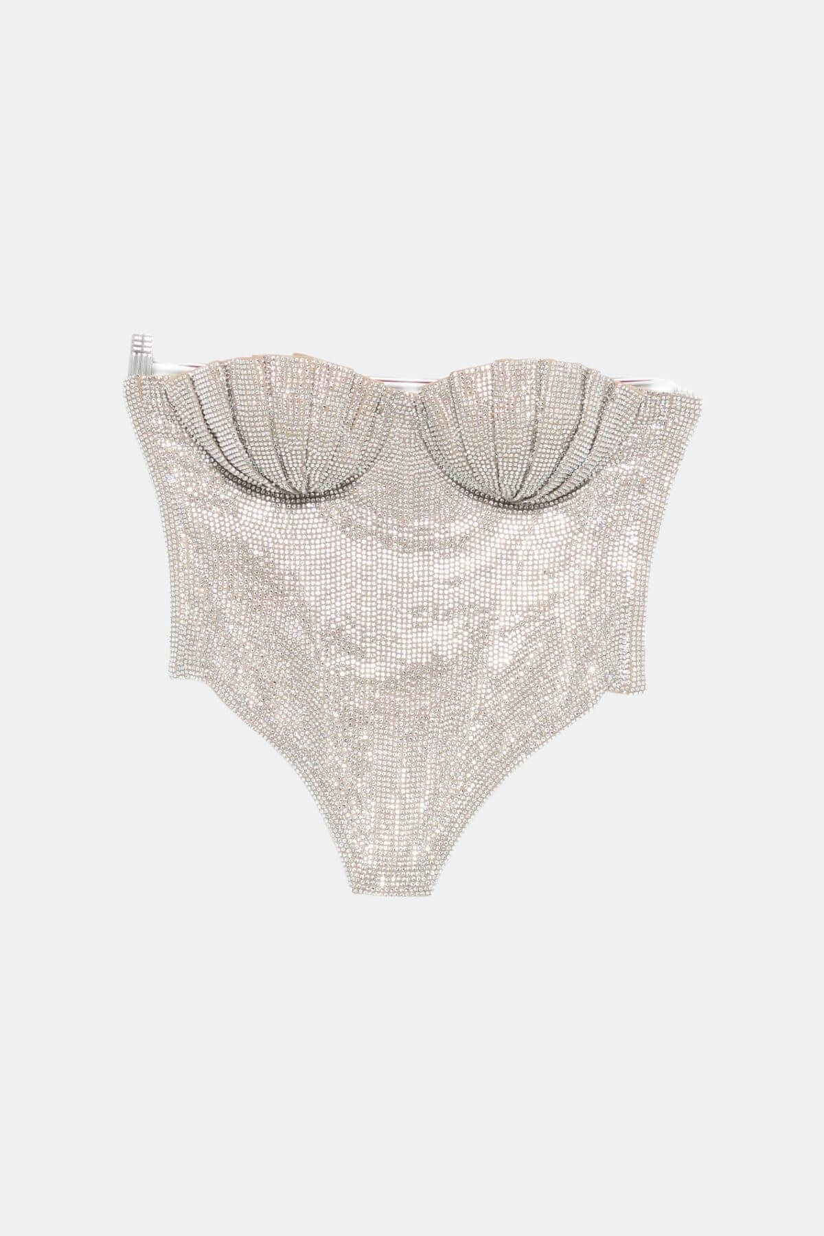 This dazzling corset, hand-embellished with hundreds of Swarovski crystals, captures the light — and every gaze in the room. The structured silhouette, inspired by vintage couture, creates a flawless hourglass shape with an ultra-modern edge.