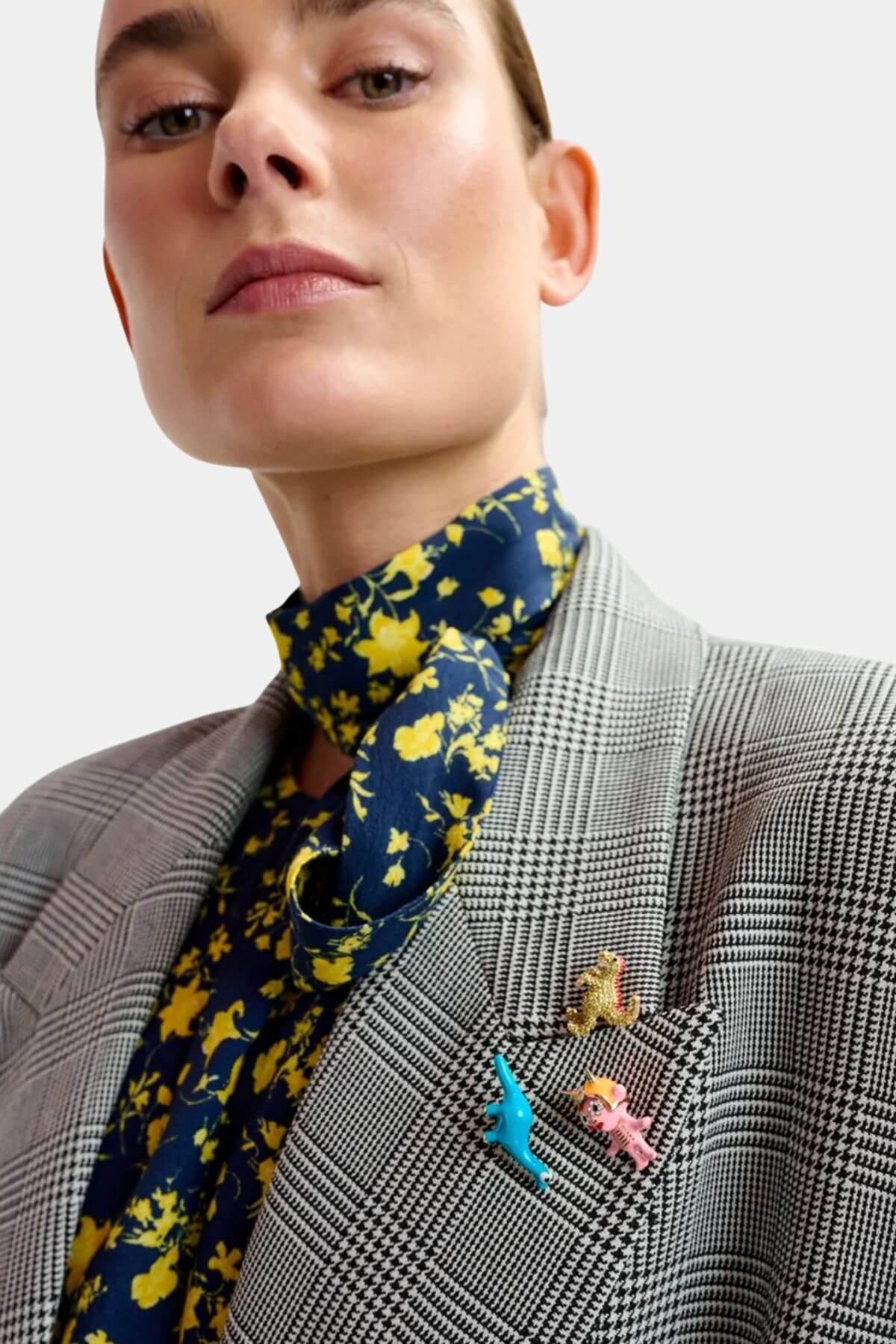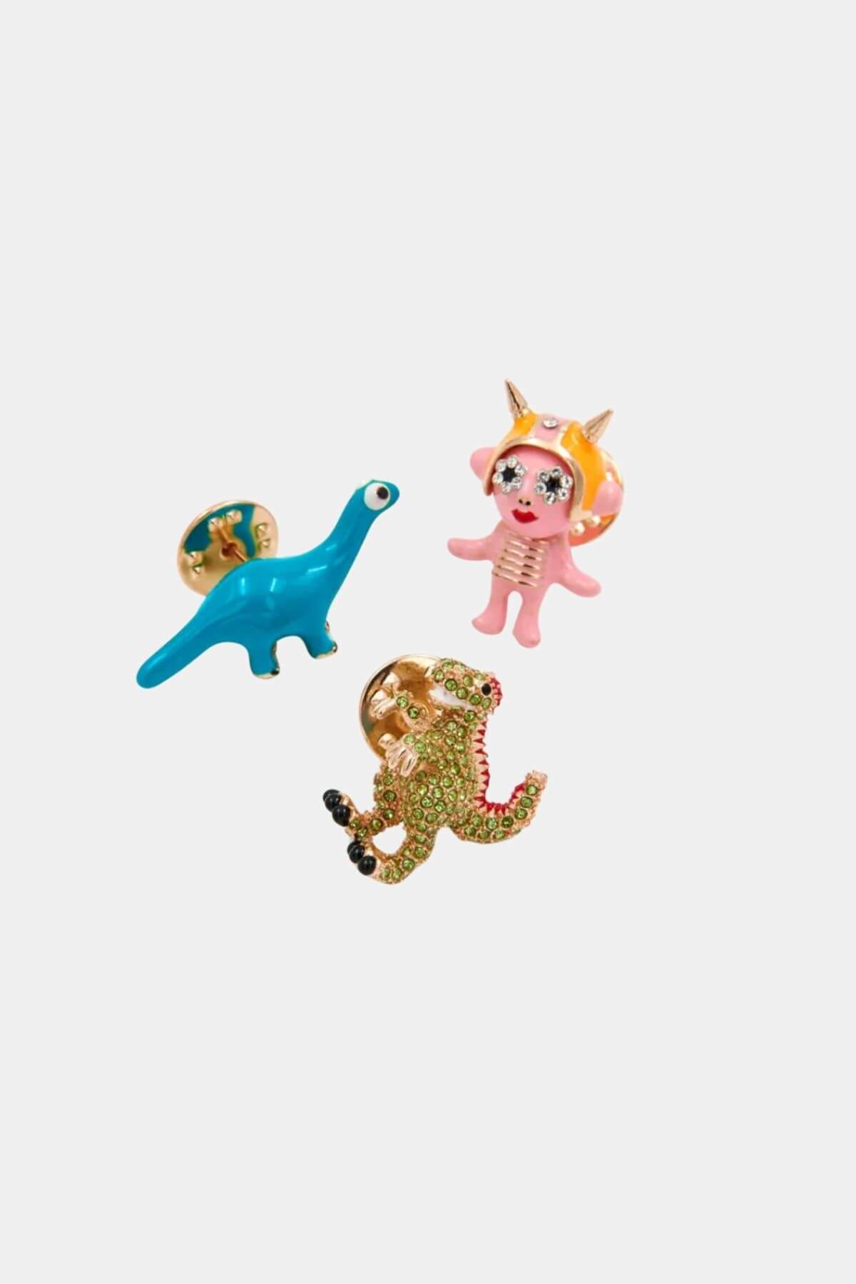 A trio of pins featuring two glossy enamel characters—a rhino and a little lady—paired with a rhinestone-encrusted dino, each pin brings its own personality and texture. Style them on your denim jacket, tote, or cap to inject a playful twist to any look.