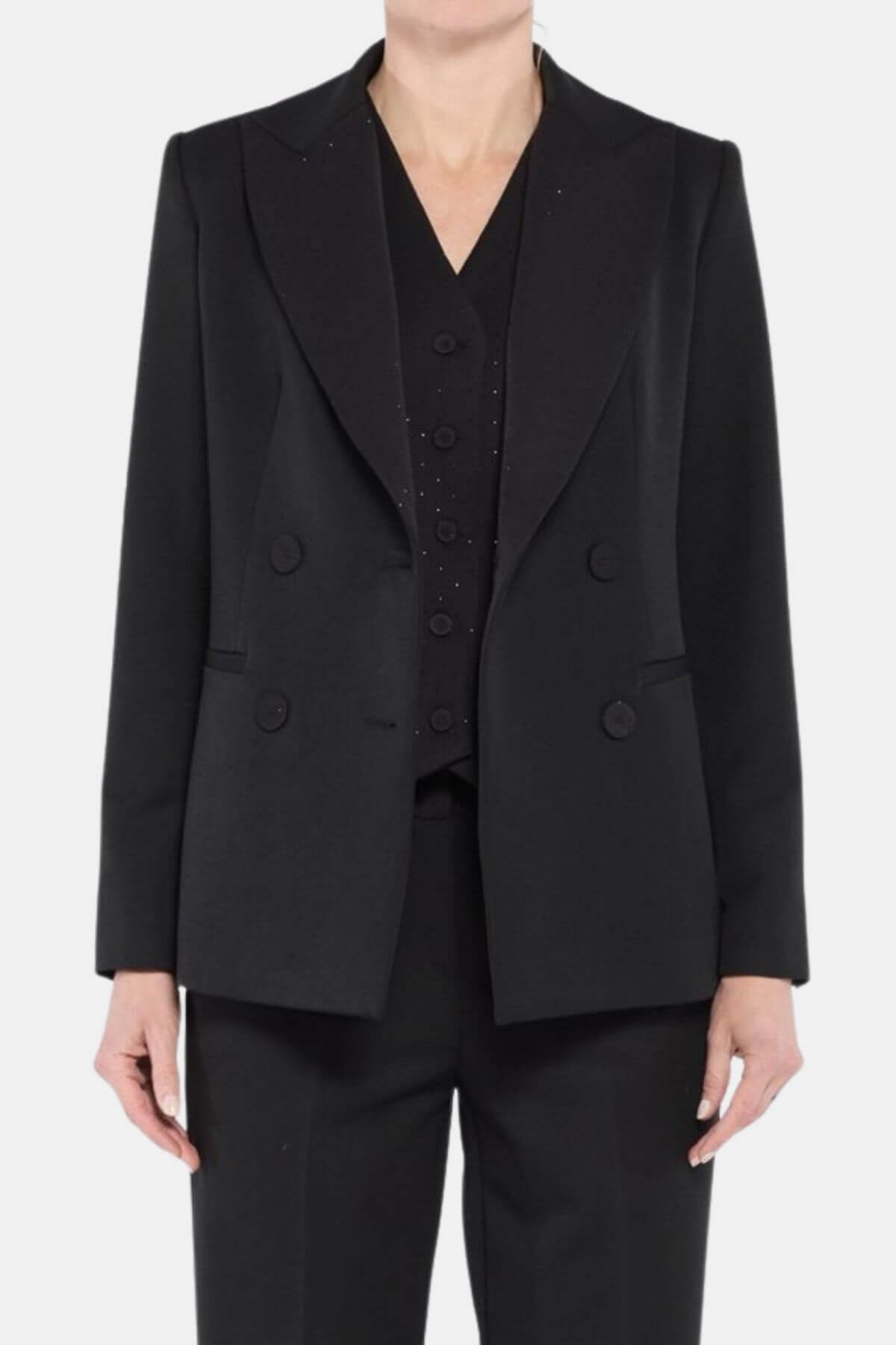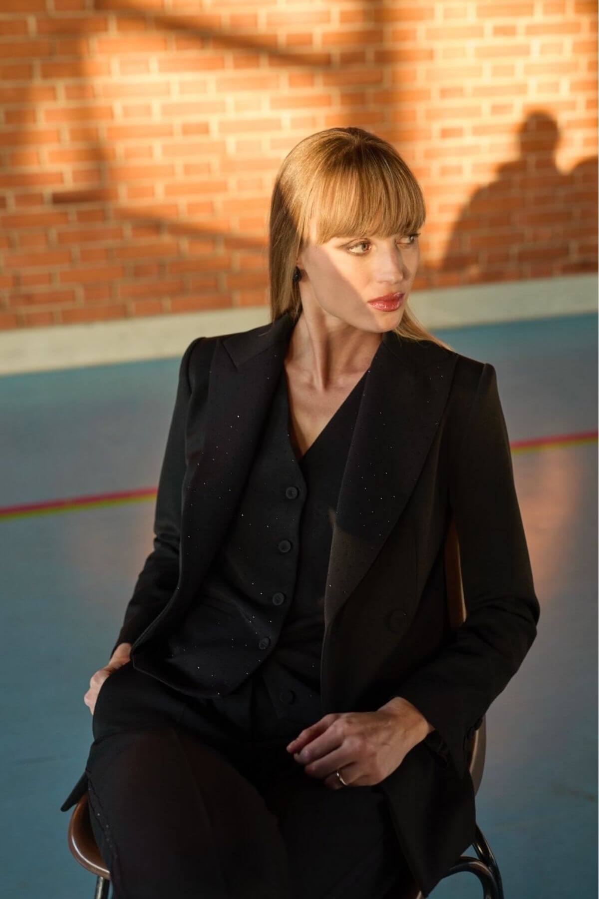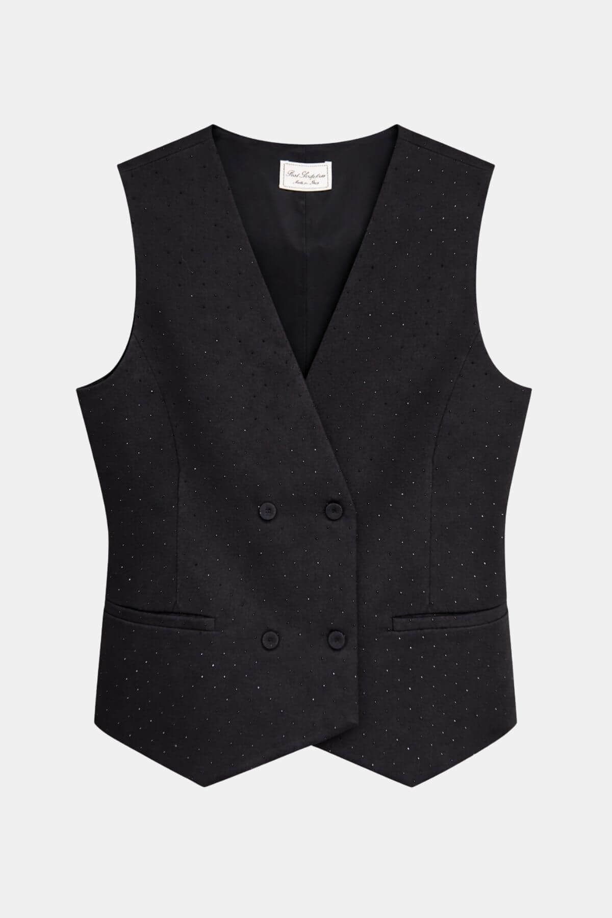 This tailored Post Scriptum waistcoat is cut in a refined black fabric with subtle dotted detailing. Featuring a double-breasted front and sharp V-neckline, it adds structure and polish to modern suiting. Style with matching Blazer and pants.