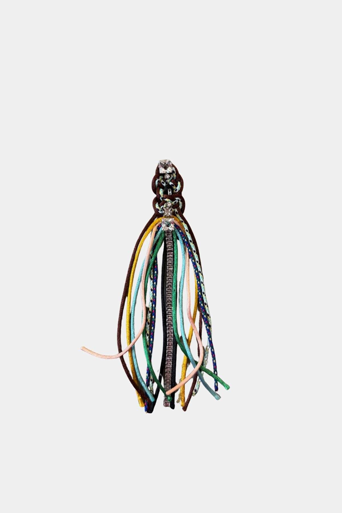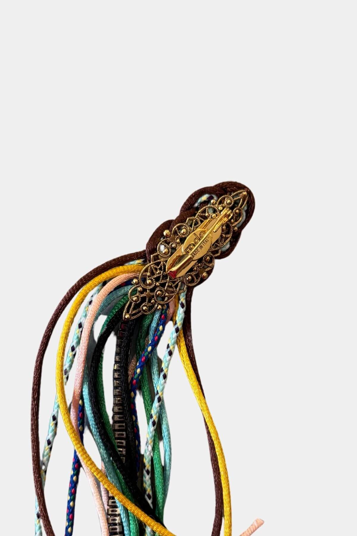 A vibrant statement brooch crafted from an array of colorful ribbons, elegantly gathered and held together by shimmering glass stones. Artistic and eye-catching, this piece adds a playful yet sophisticated touch to any look.
