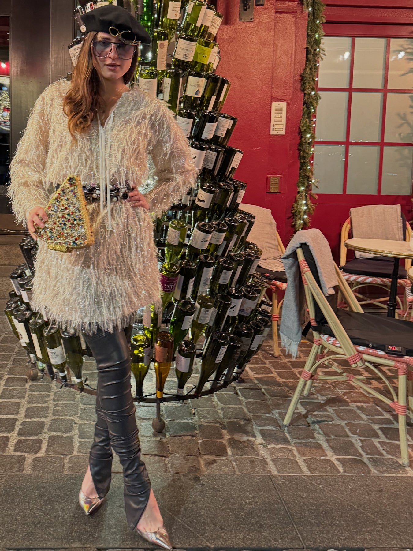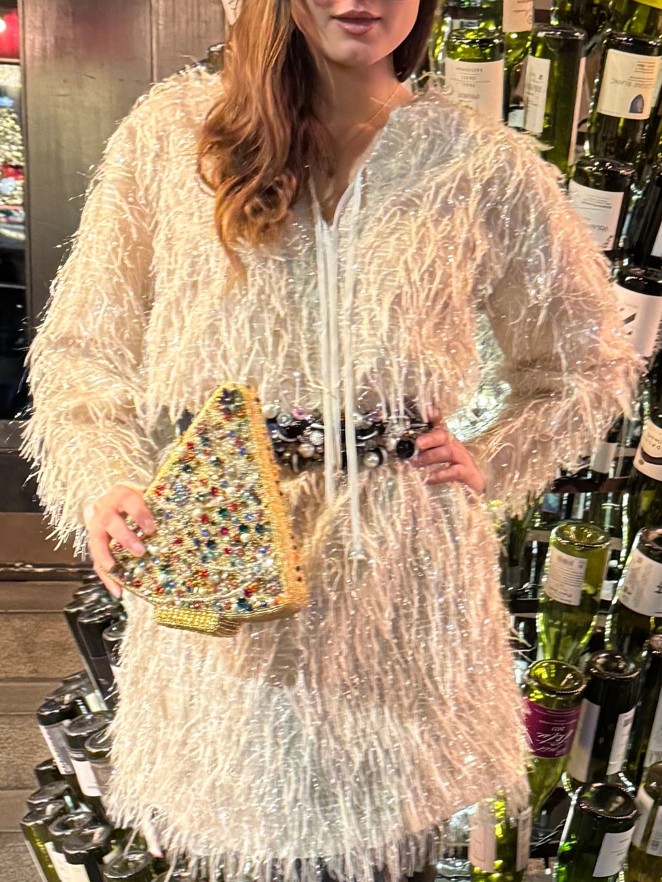 This exclusive cream dress from Shirtaporter has an eye-catching texture with long, loose fibers that give it a sophisticated and unique look. The dress has a slightly cropped fit and closes discreetly at the front, making it a stylish choice for both everyday and festive occasions. The unique design makes this dress perfect for adding an elegant and trendy touch to any outfit.