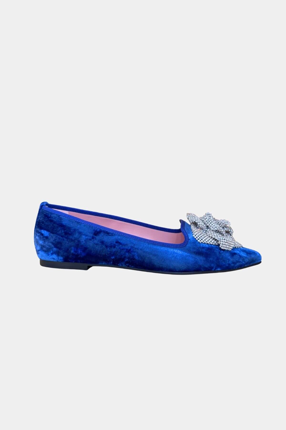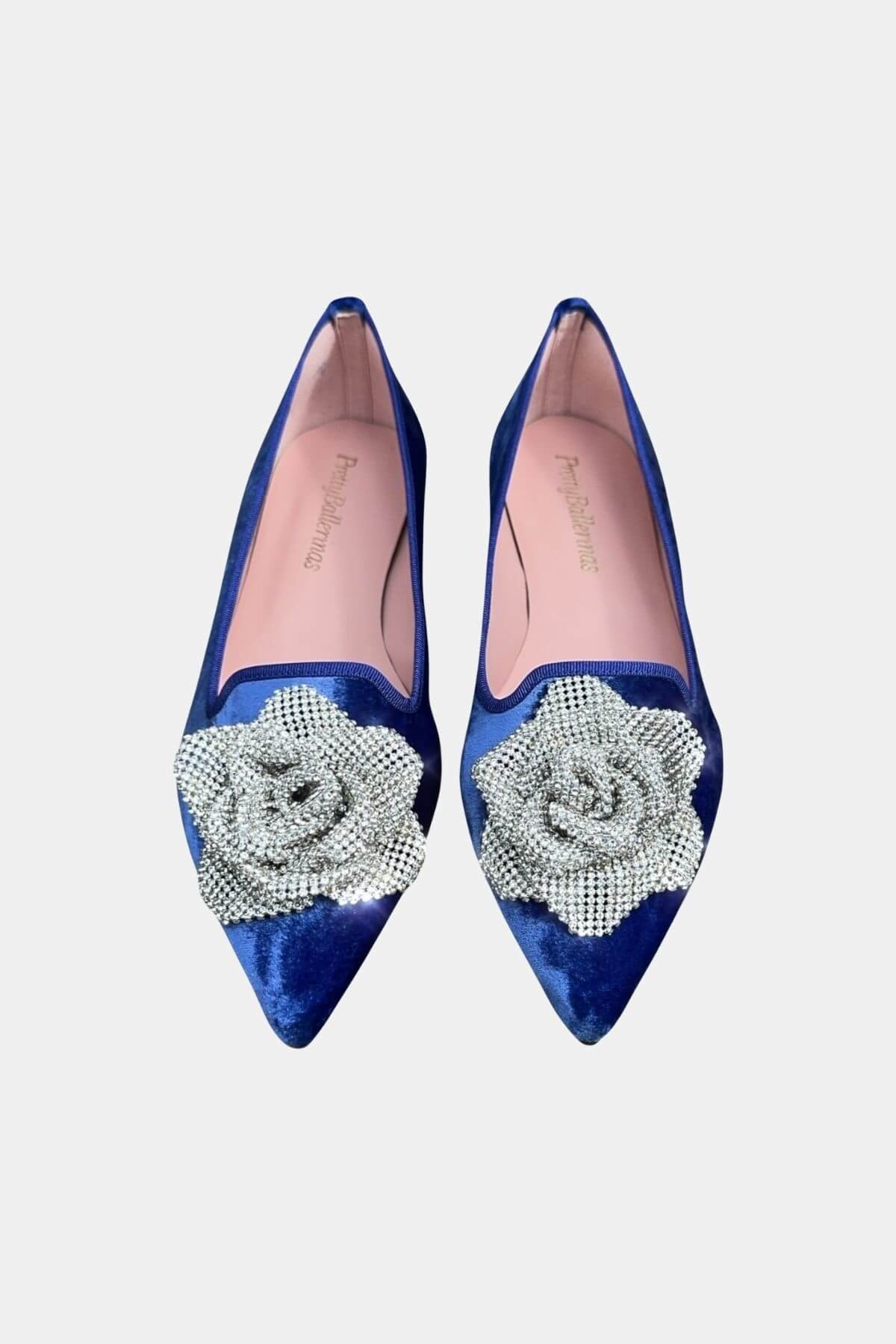 Velvet, handmade Swarovski Crystal Flower, Rubber sole, leather insole and lining.