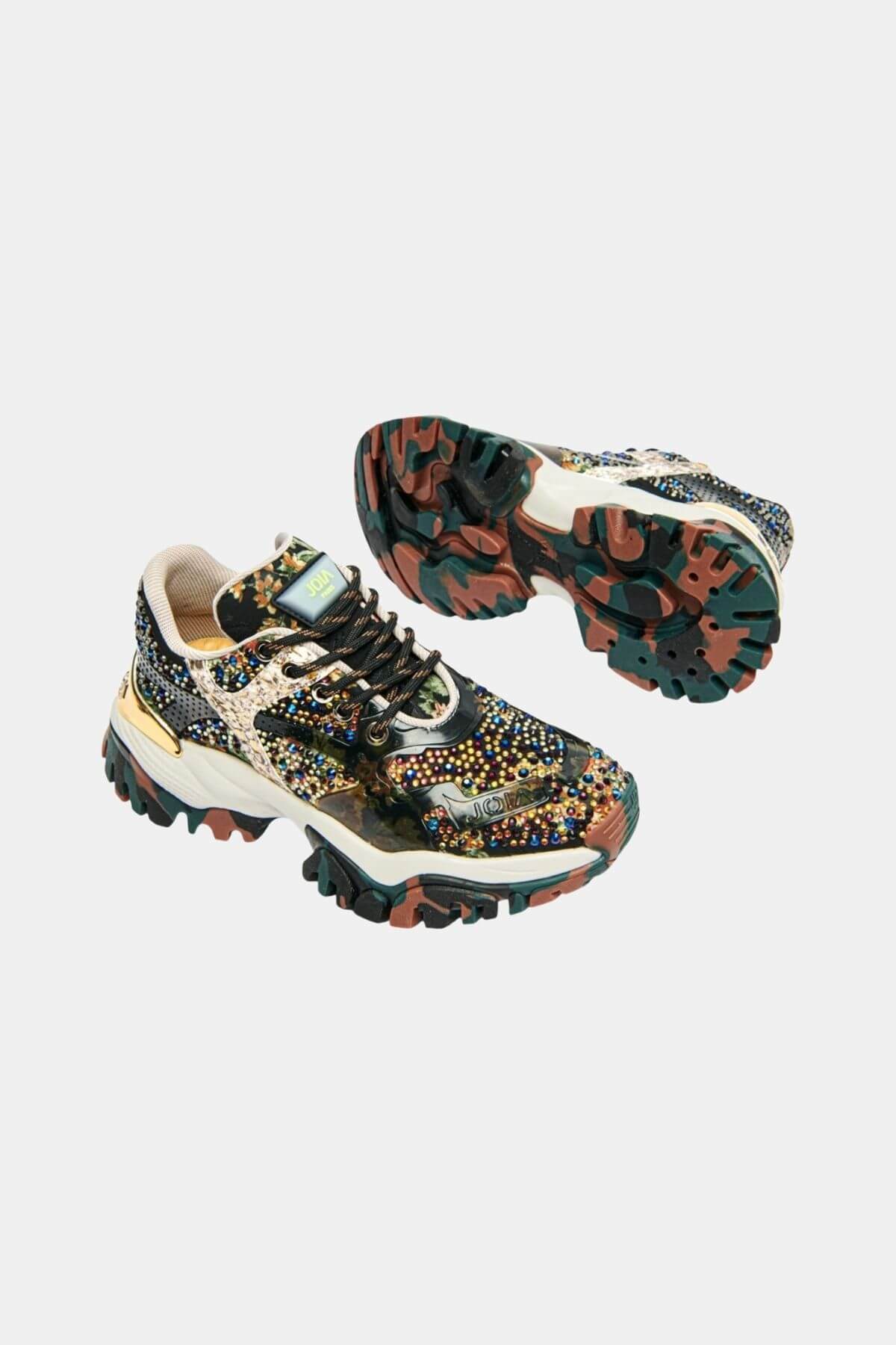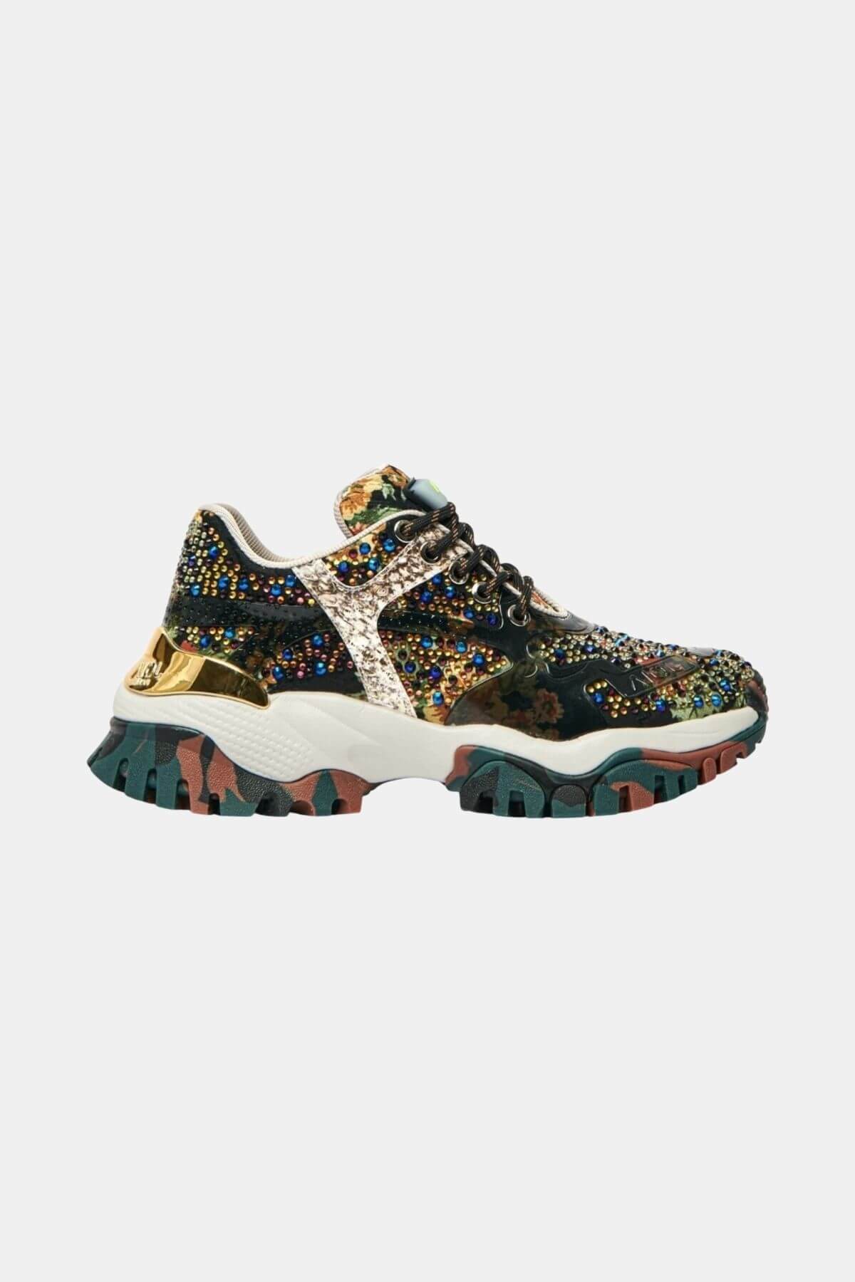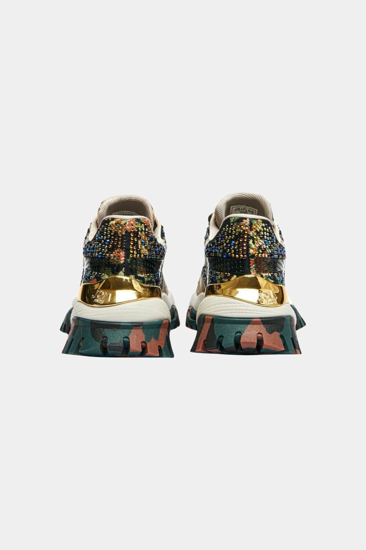 Sneaker in fabric with multi-rhinestone applications, pvc and printed leather inserts. Outdoor rubber out sole with metallic effect insert on the back. Sole height 30 mm. Removable footbed.