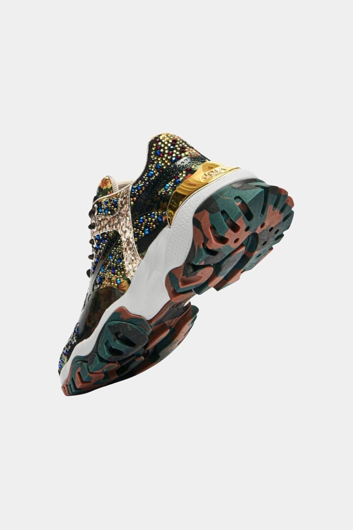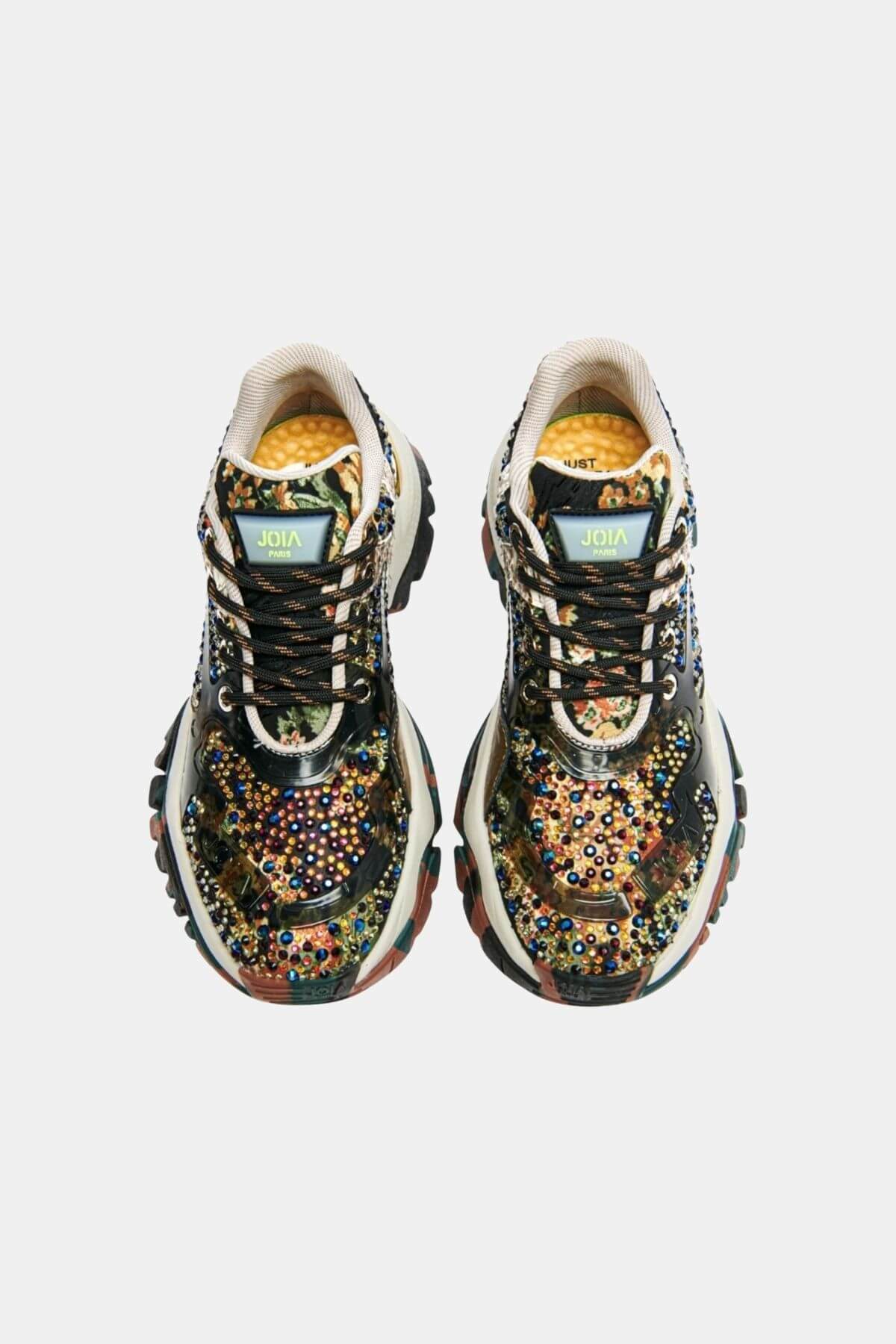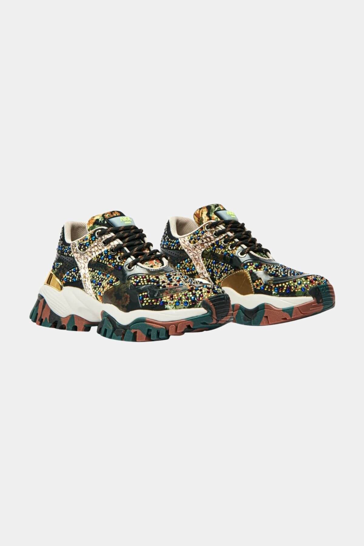Sneaker in fabric with multi-rhinestone applications, pvc and printed leather inserts. Outdoor rubber out sole with metallic effect insert on the back. Sole height 30 mm. Removable footbed.