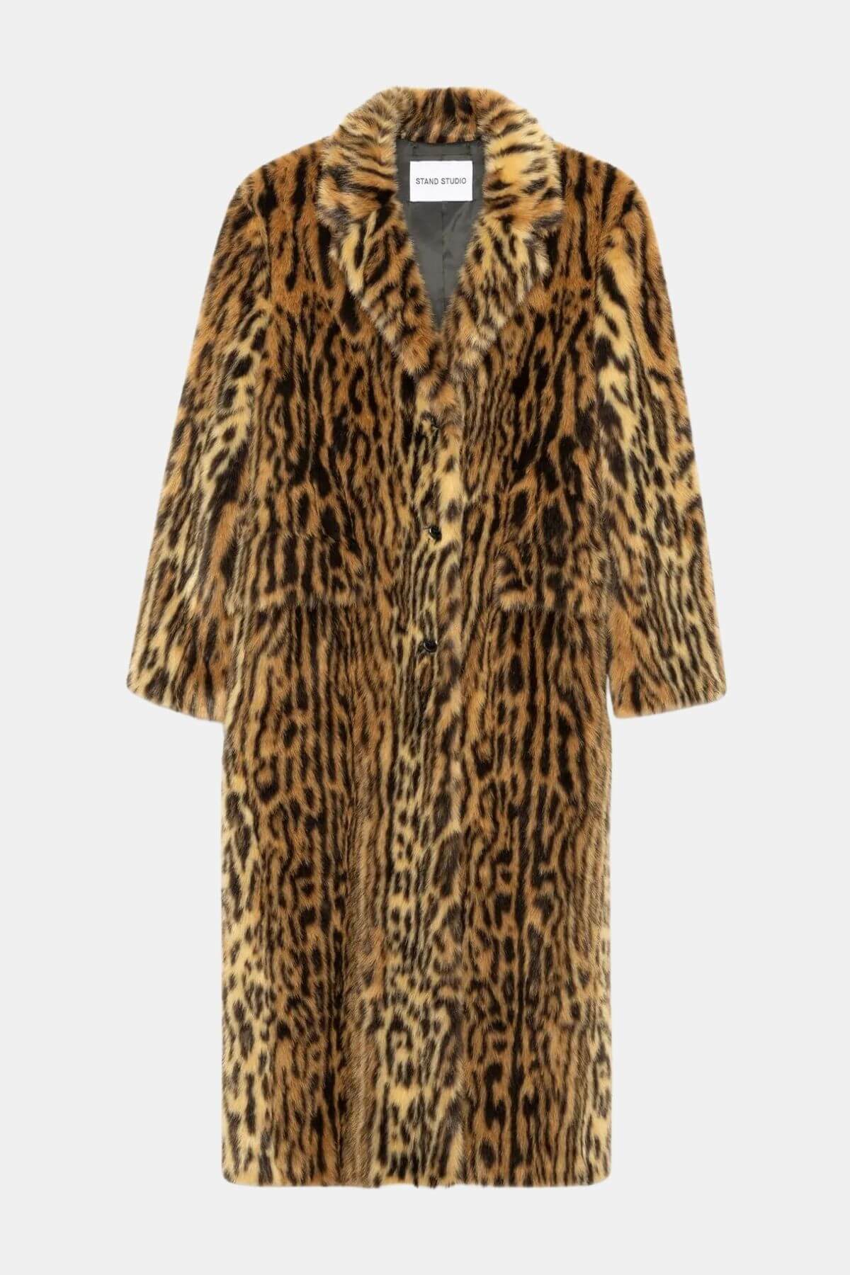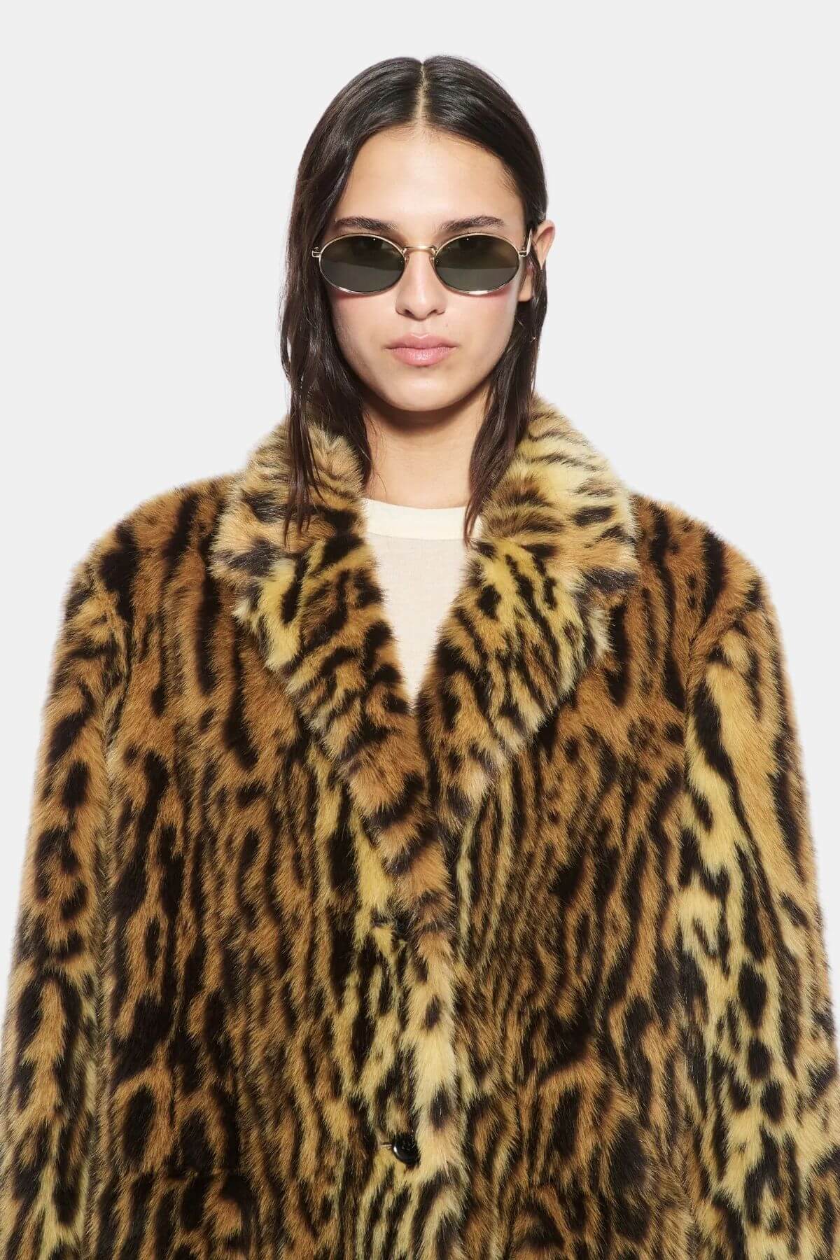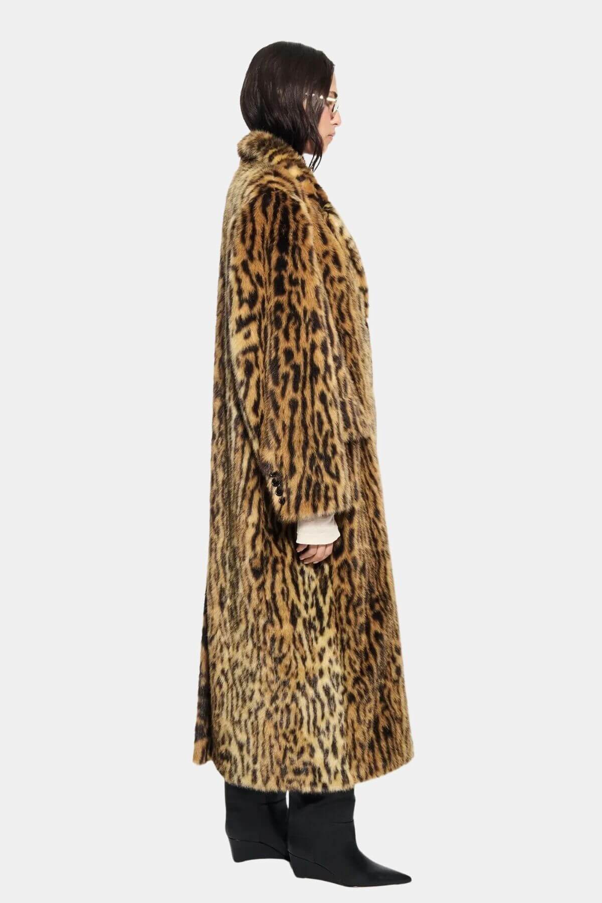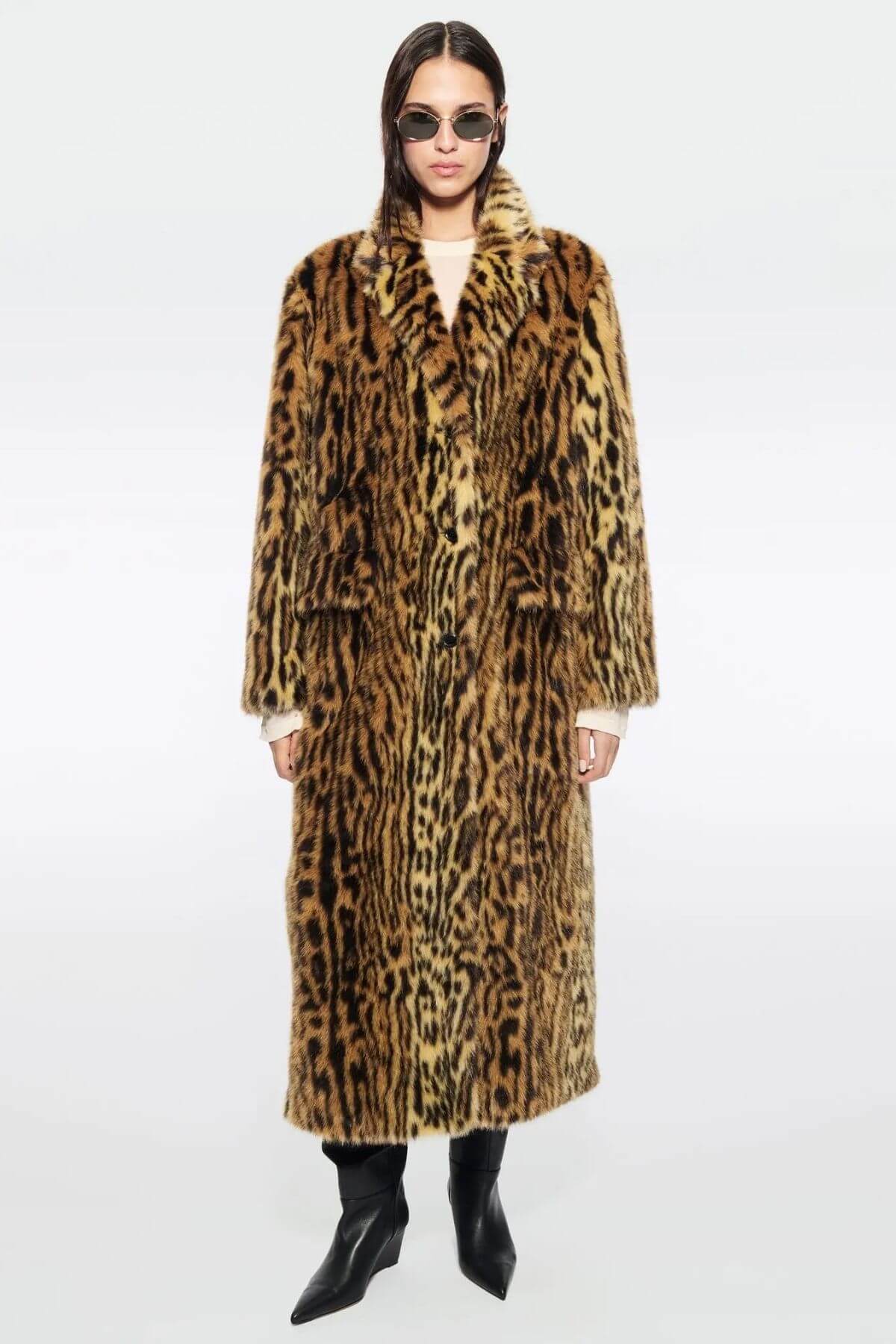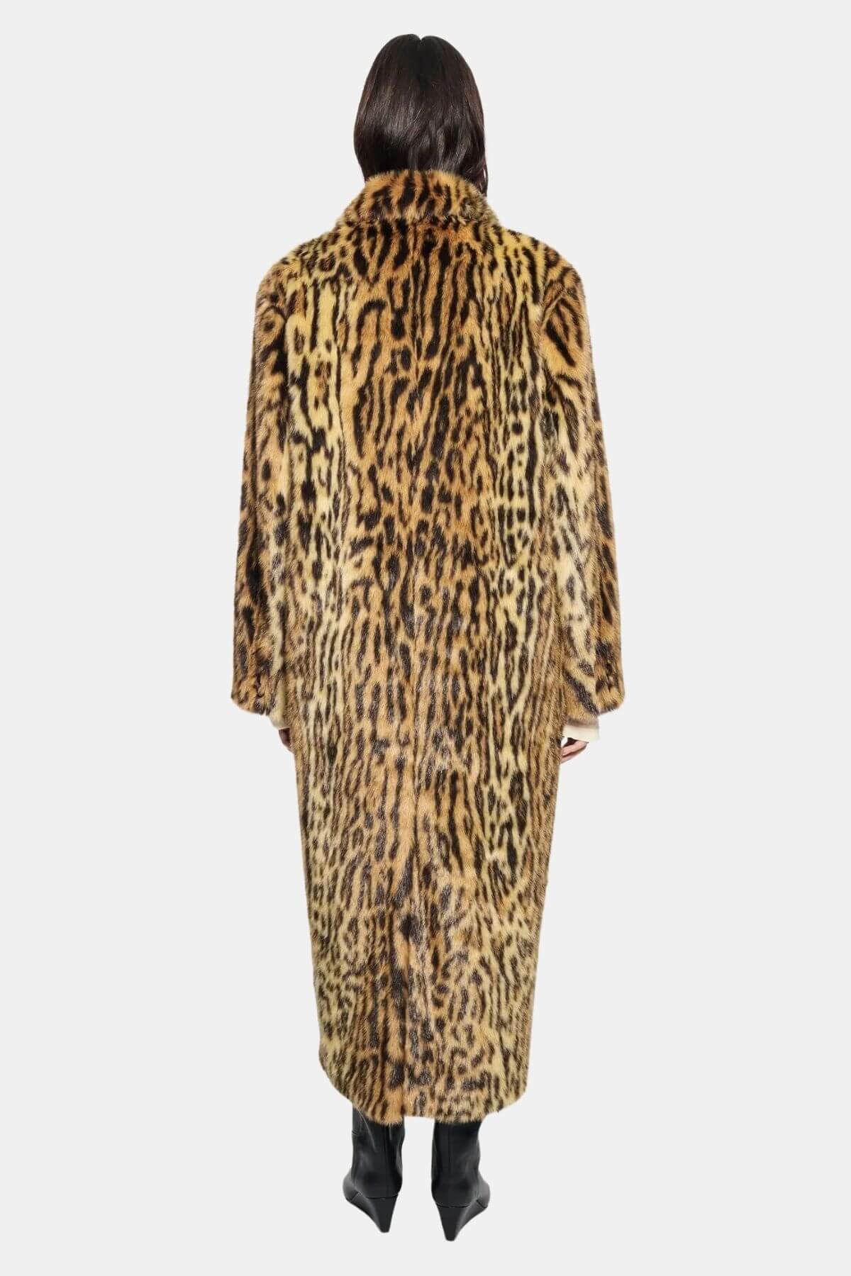 Statement longline coat in plush faux fur with a bold, all-over leopard pattern. Features a relaxed silhouette, notch lapels, and hidden front closure for a luxe winter look.