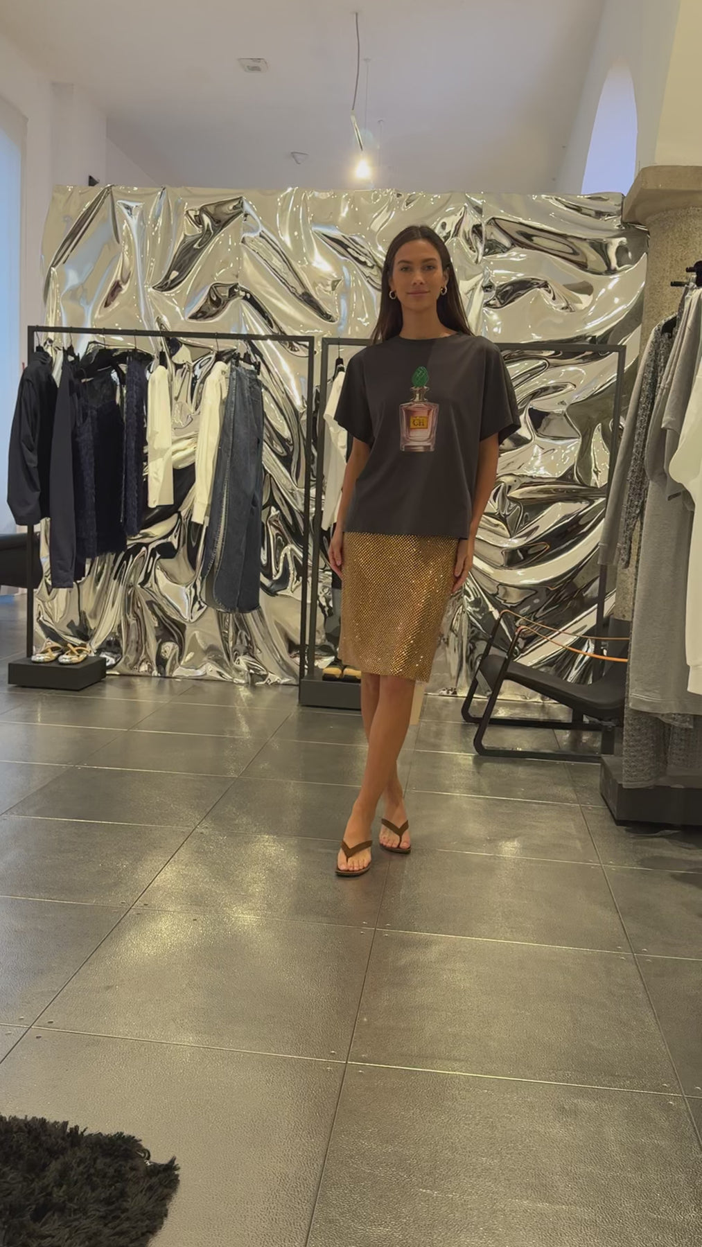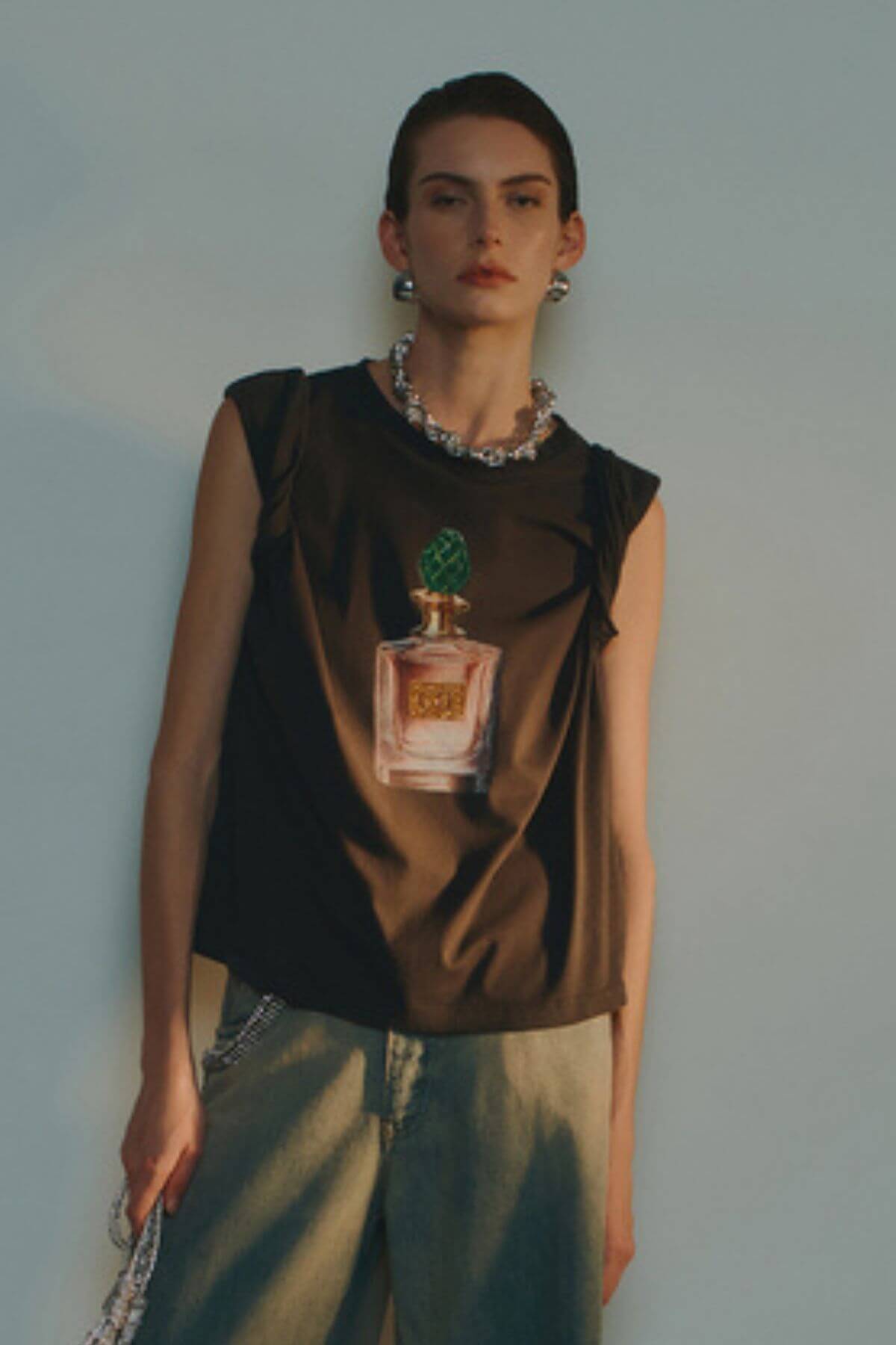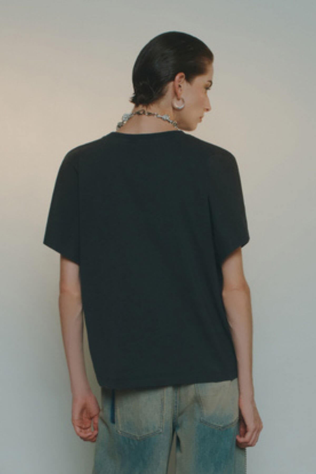 A relaxed-fit T-shirt made from soft, washed black cotton with a classic crew neckline and rolled sleeves. Detailed with a centered perfume bottle print on the front, adding a refined, graphic contrast to the casual silhouette.