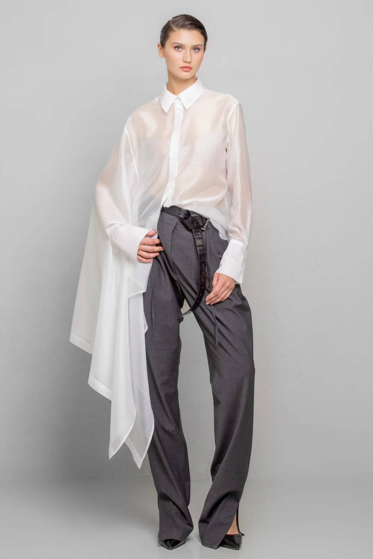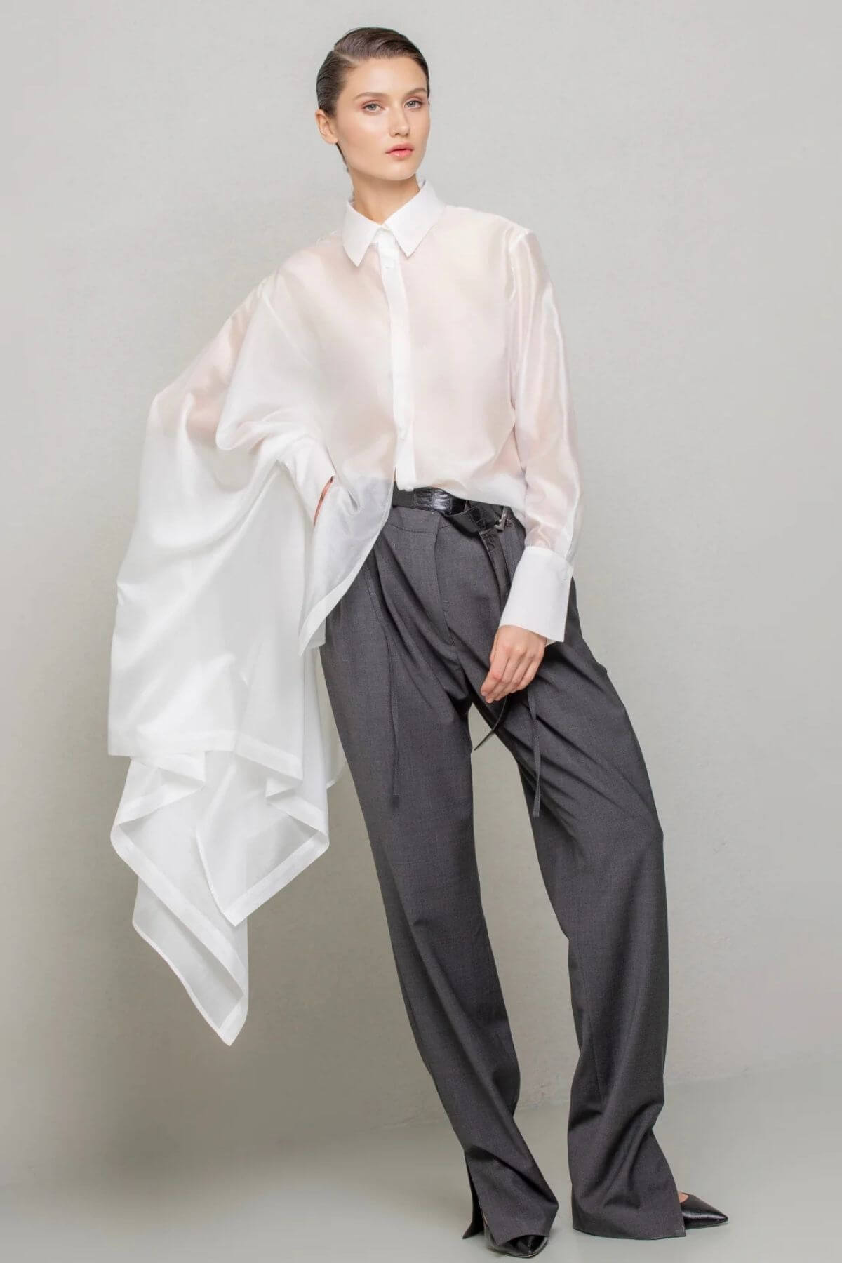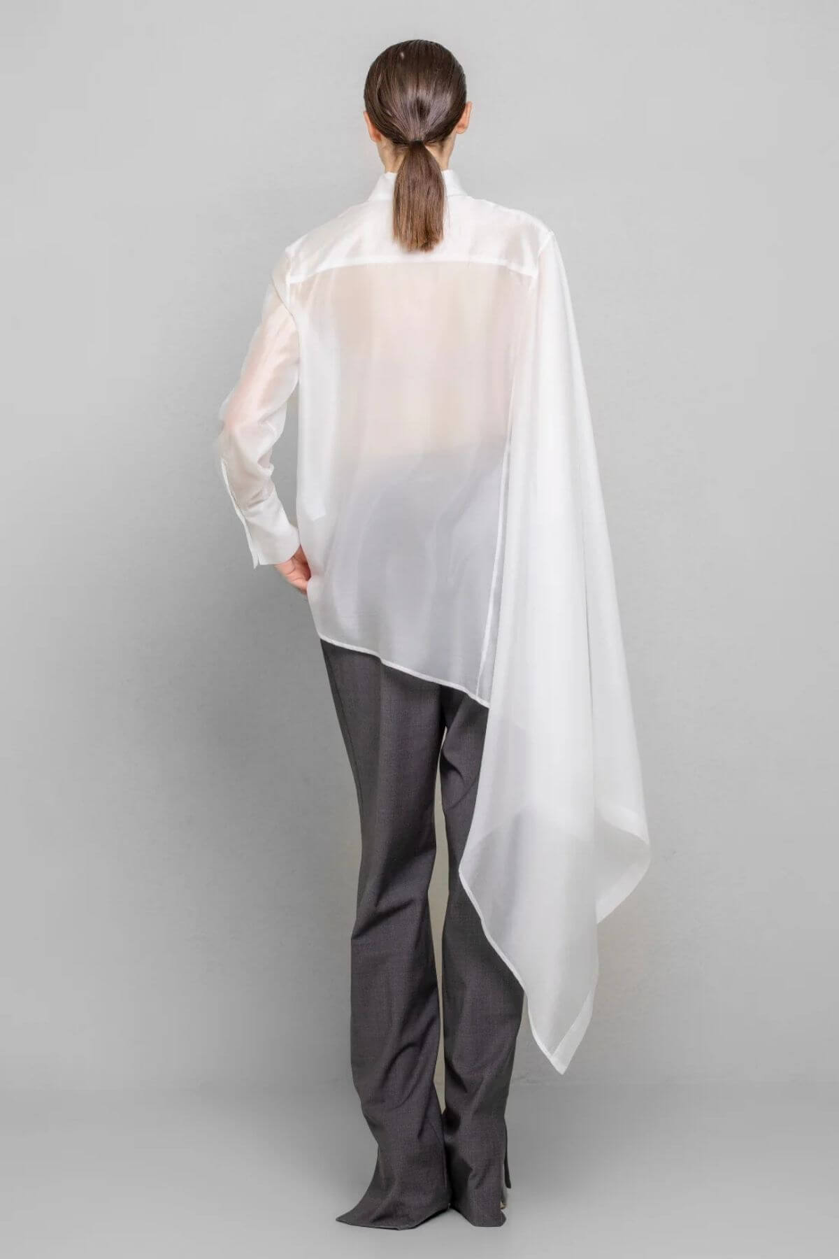 Skjorte med asymmetrisk snit i et let skinnende, gennemsigtigt stof, med almindelig krave og manchetter. Skjortens venstre side har en almindelig pasform, mens højre side er skåret med en generøs udvidelse, hvilket skaber et majestætisk og mystisk look.