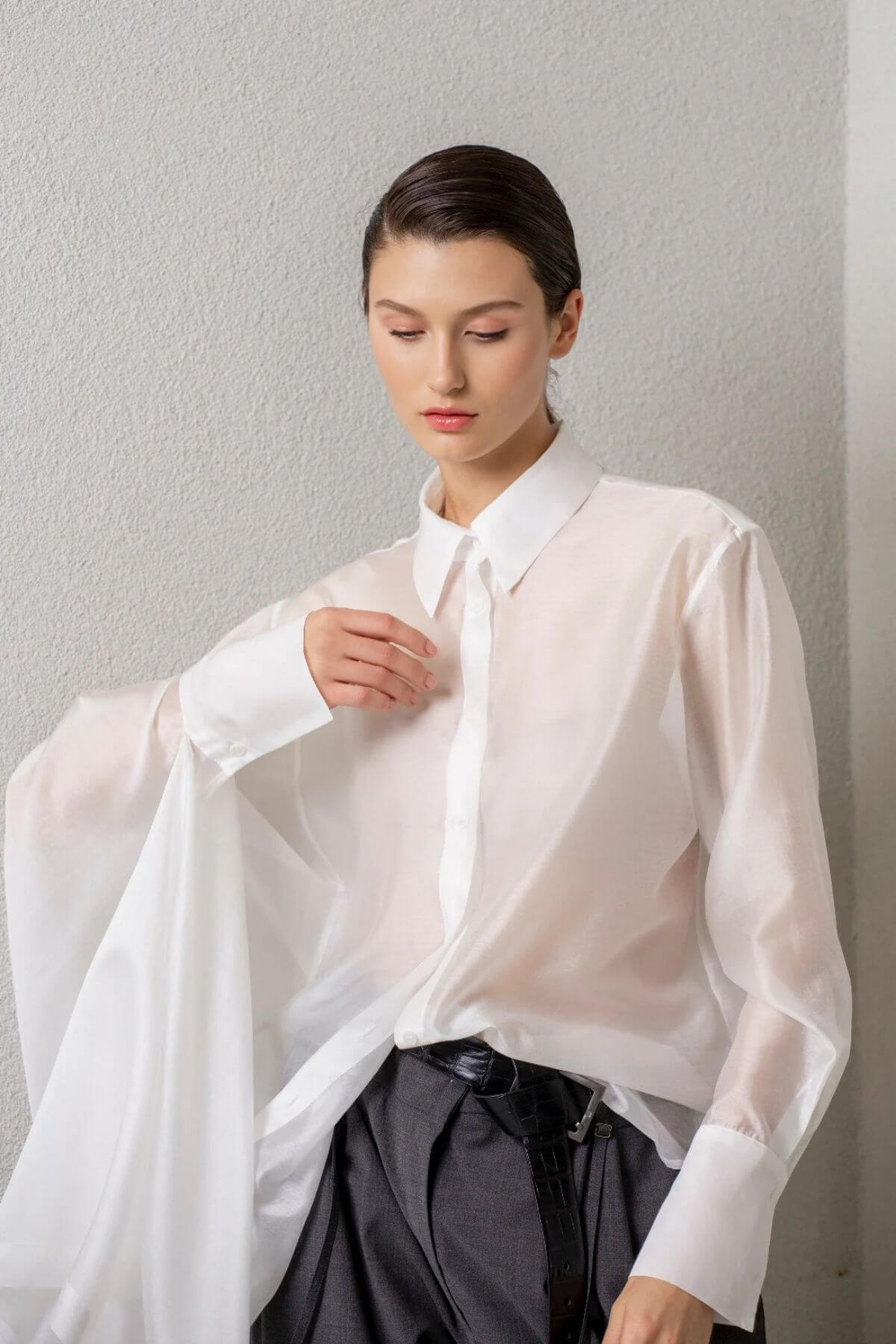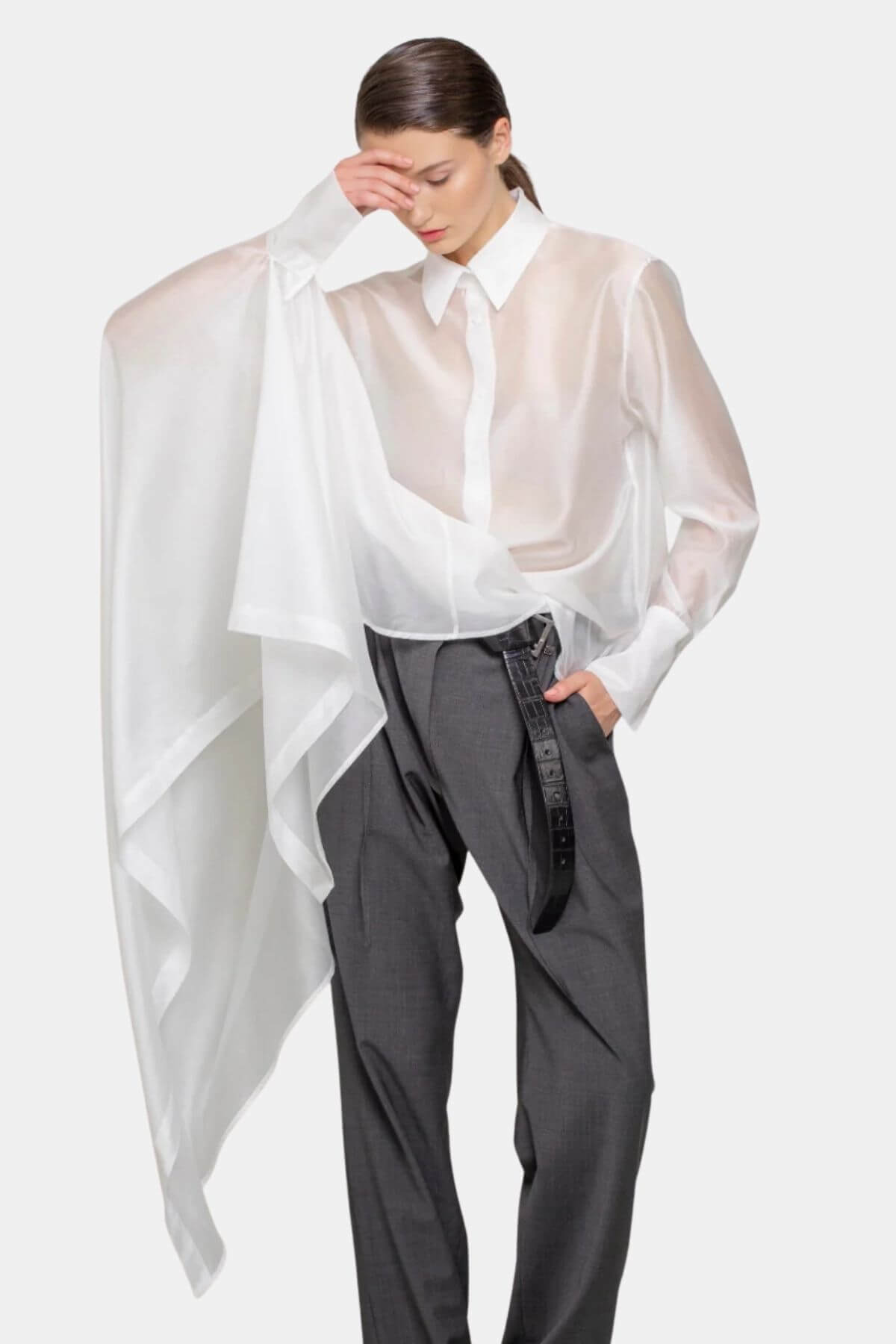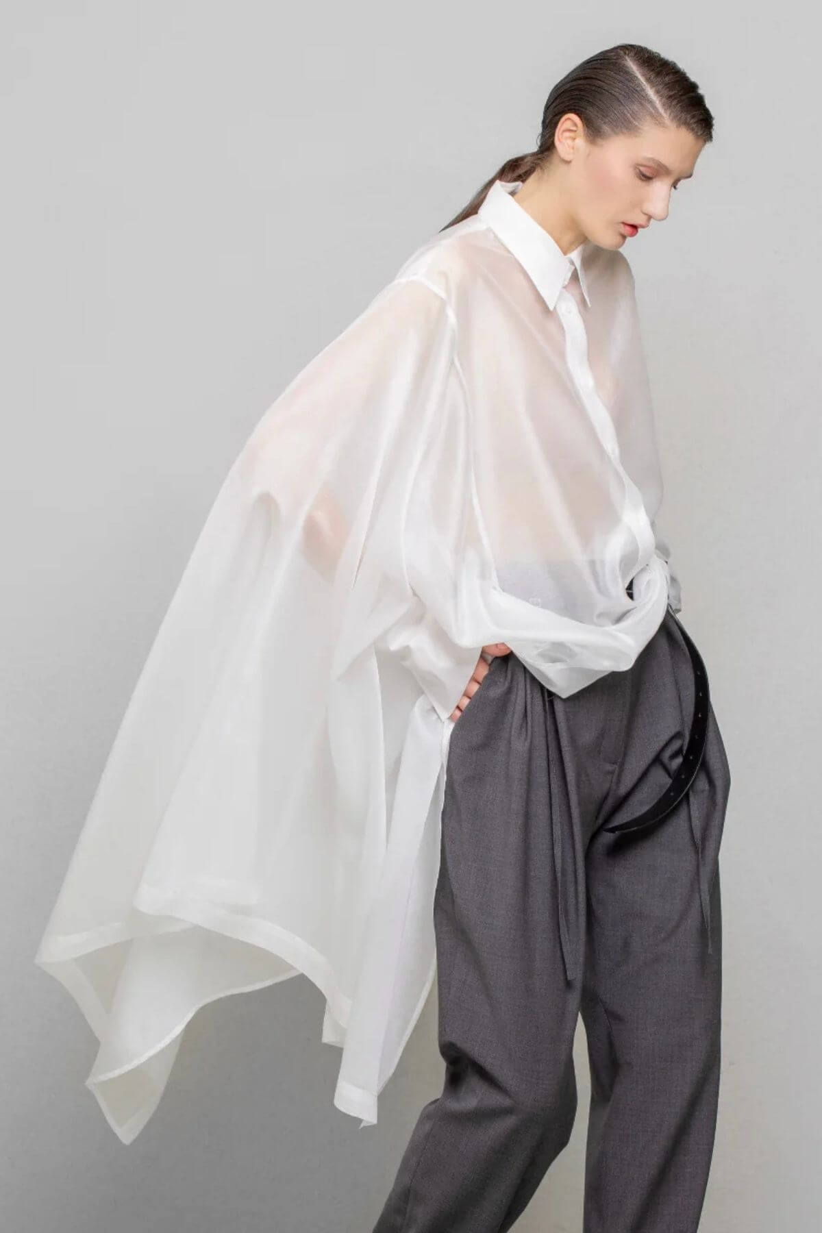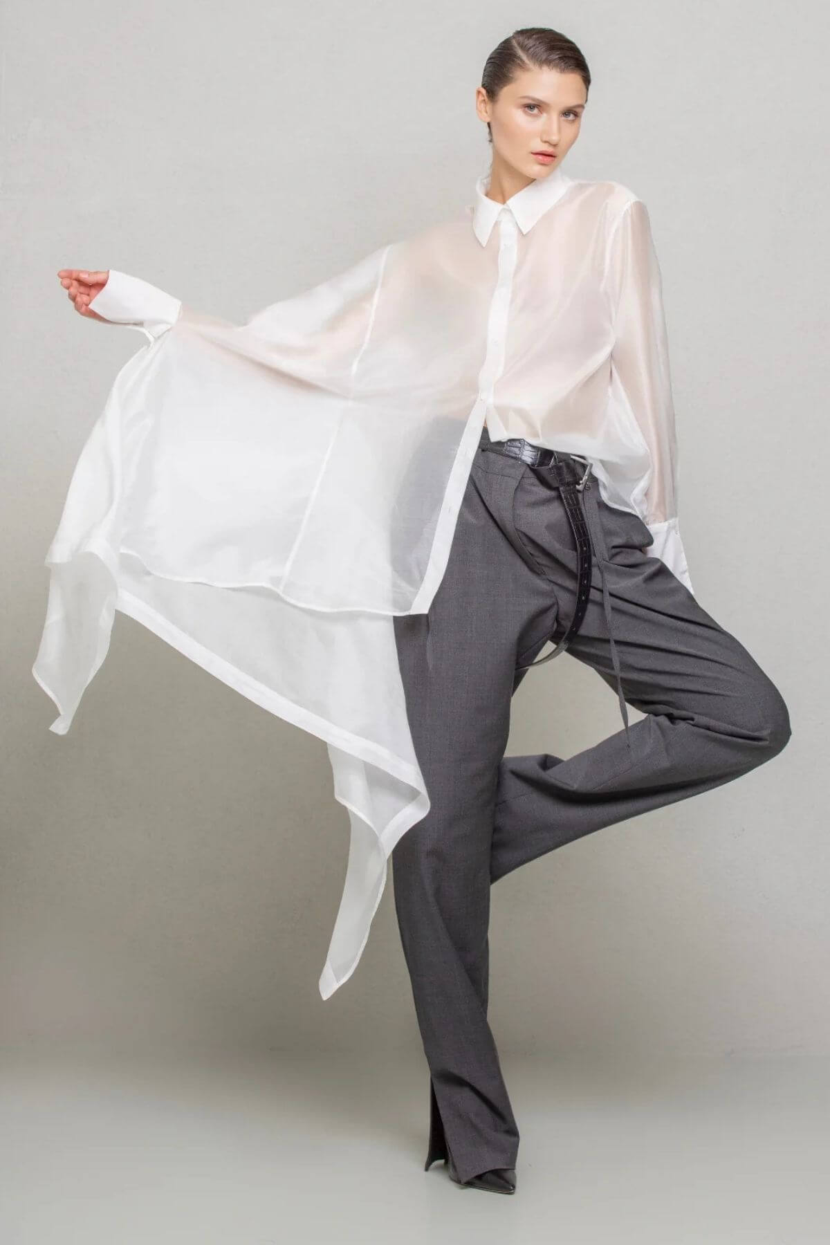 Skjorte med asymmetrisk snit i et let skinnende, gennemsigtigt stof, med almindelig krave og manchetter. Skjortens venstre side har en almindelig pasform, mens højre side er skåret med en generøs udvidelse, hvilket skaber et majestætisk og mystisk look.