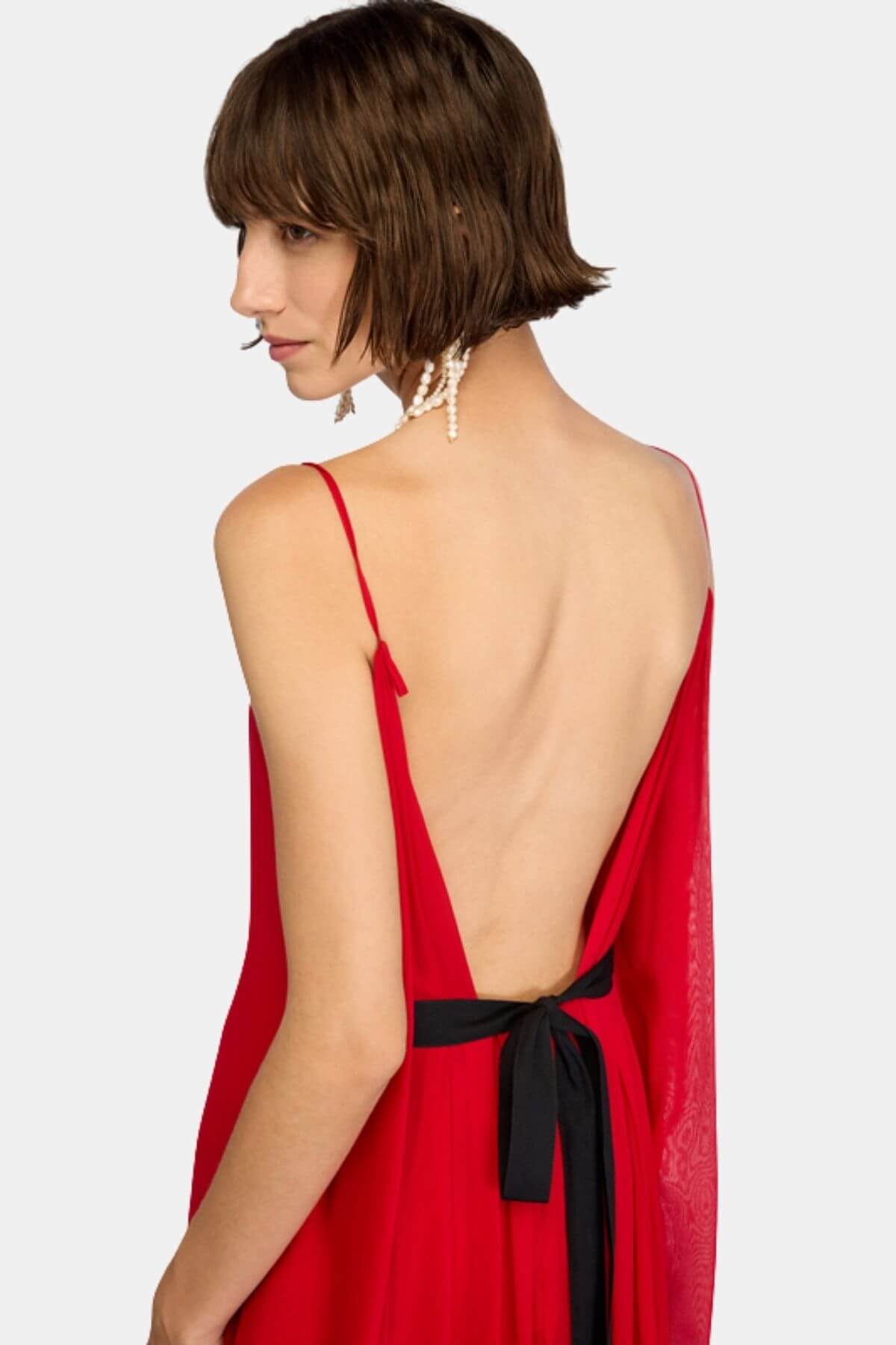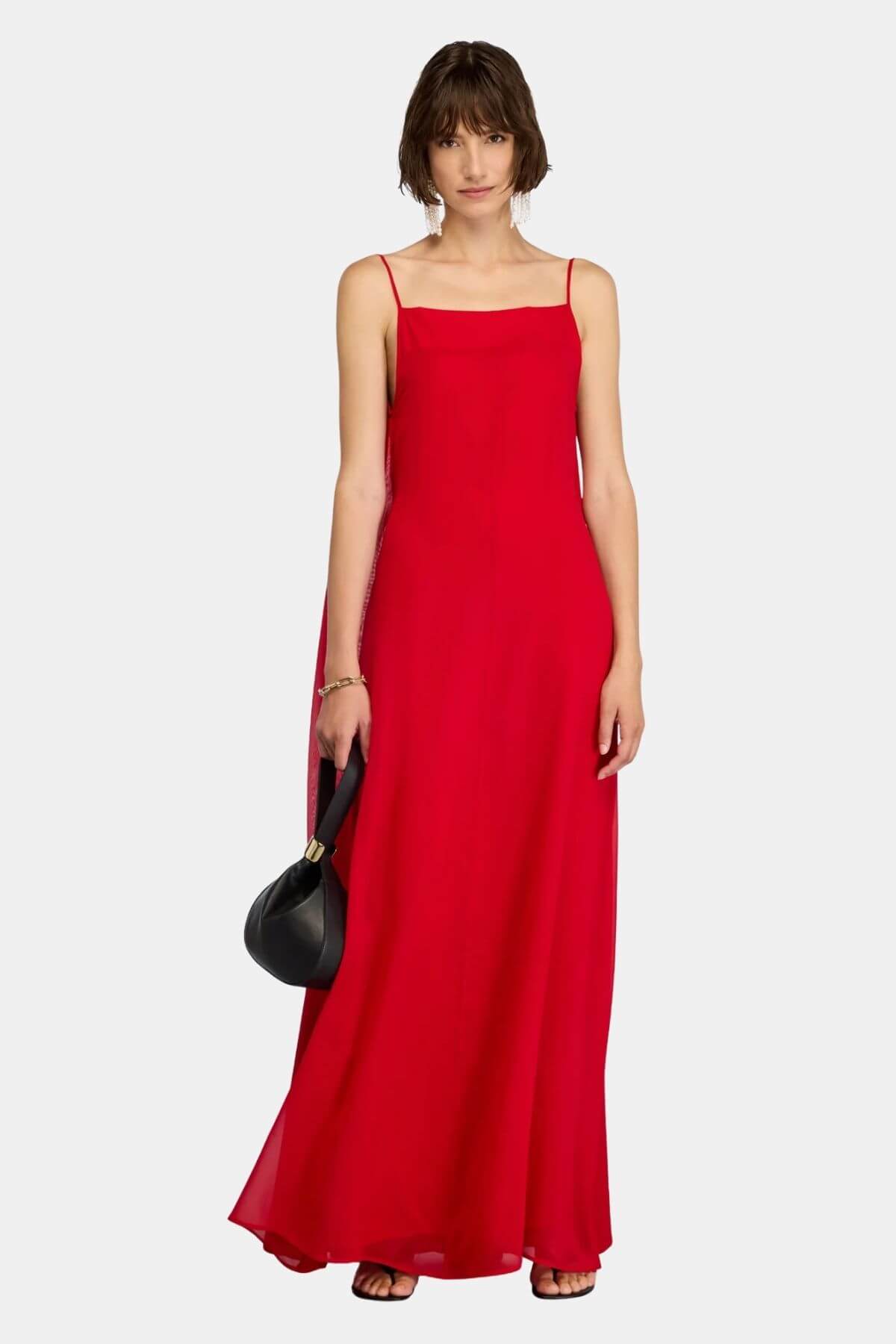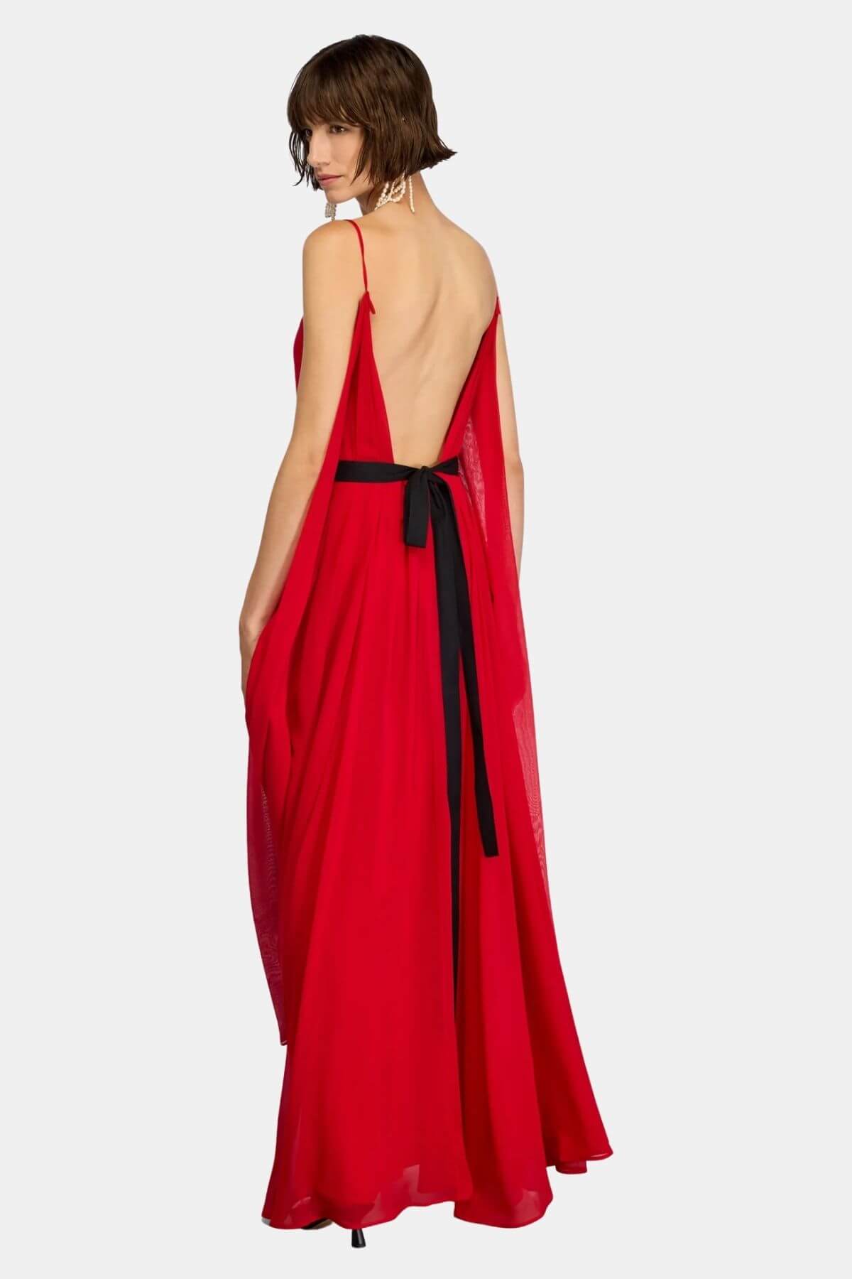Denne lange kjole i georgette er elegant og smidig og har en almindelig pasform, der falder smukt ned over kroppen. Den er designet med fine stropper og en enkel, firkantet udskæring og har en åben ryg samt et kontrastfarvet sort bånd, der giver et raffineret, feminint touch.