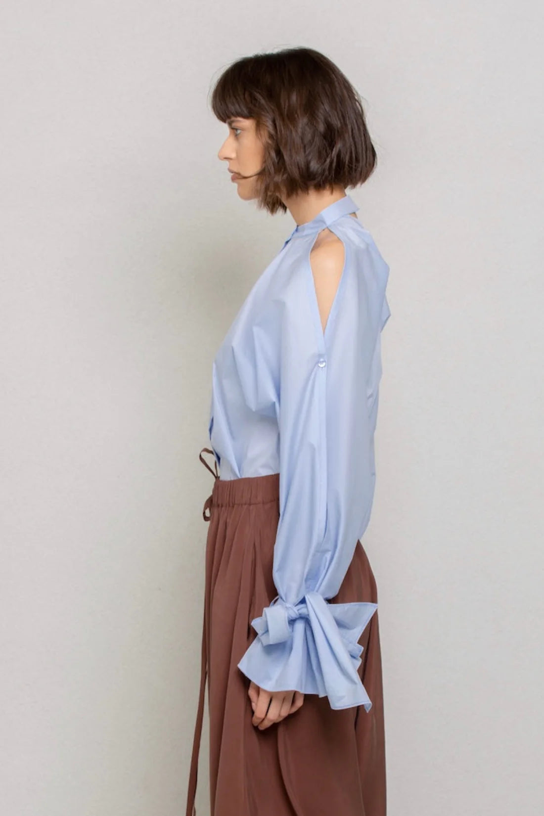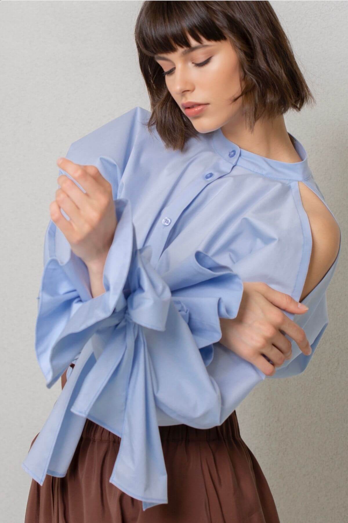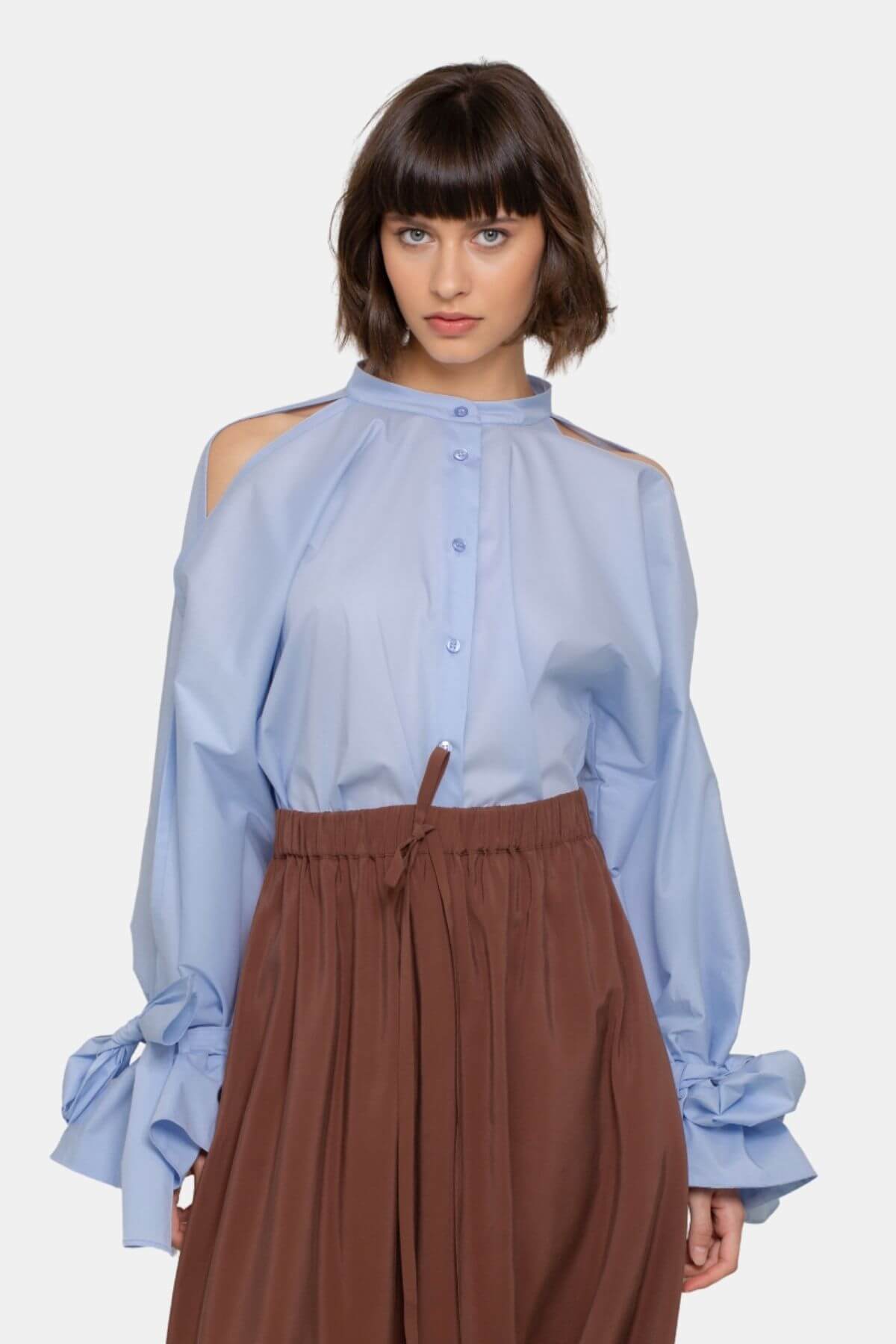 Skjorte i romantisk stil med knapstolpe midt for og mandarinkrave. De karakteristiske detaljer ved denne model er de lange, klokkeformede ærmer, der bindes med en stofrem, samt åbningen ved skulderlinjen.