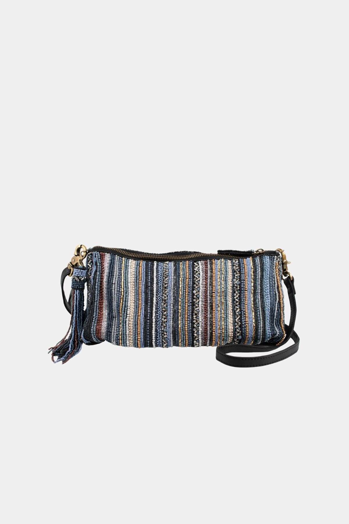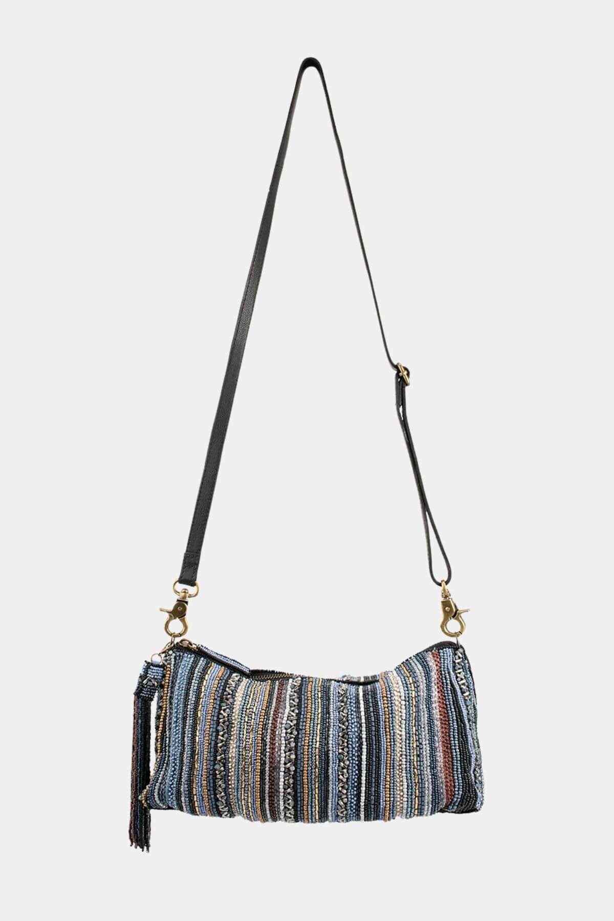Similar to our beloved Between the Lines bag but reimagined in your favorite shades of blue. Hand beaded vertical stripes with earthy neutrals and a tassel accent make this versatile crossbody easy to wear day or night.