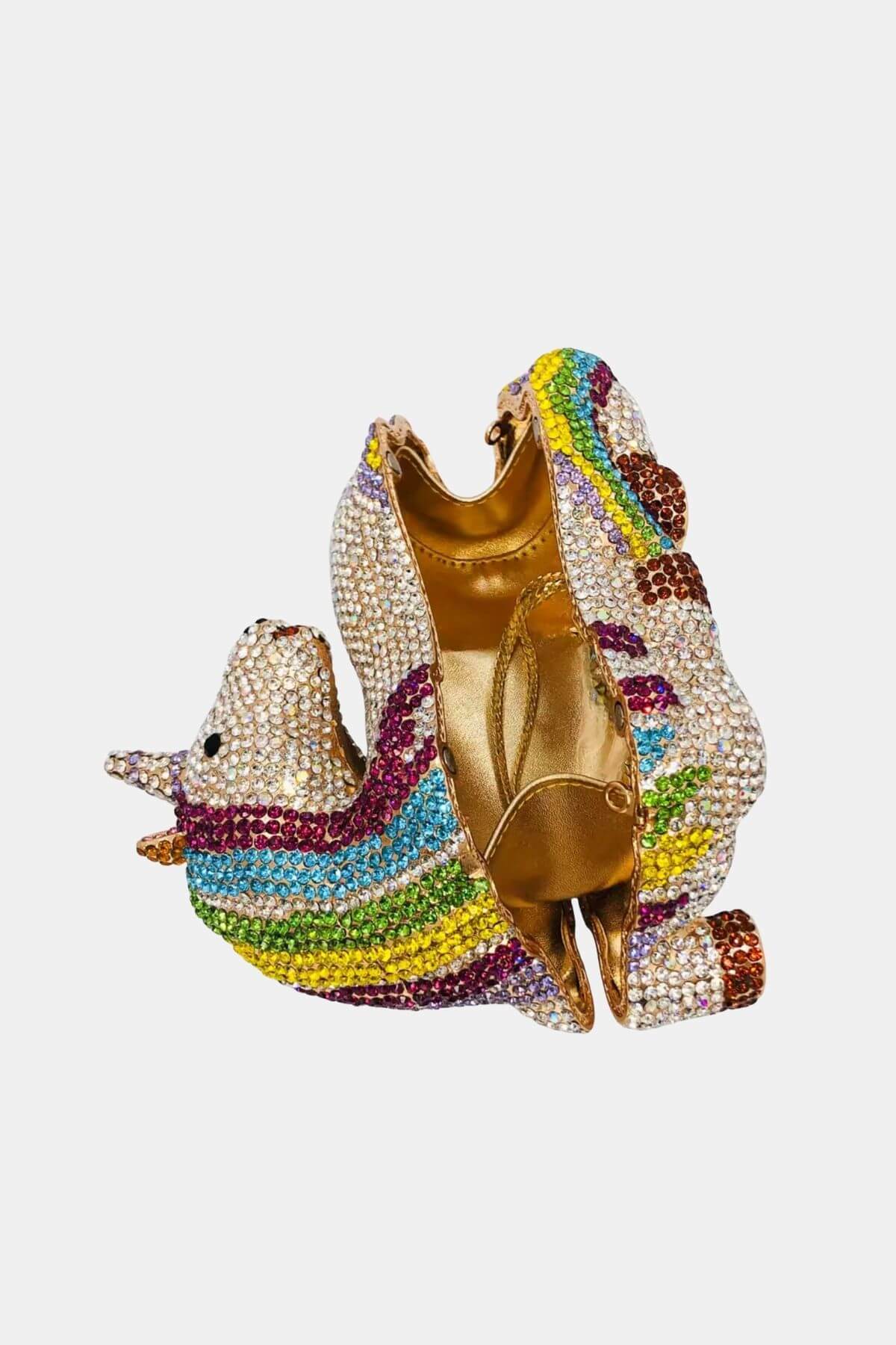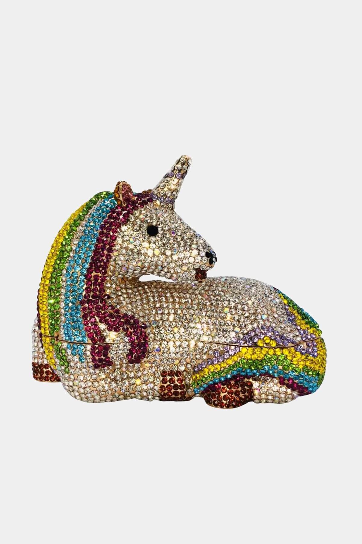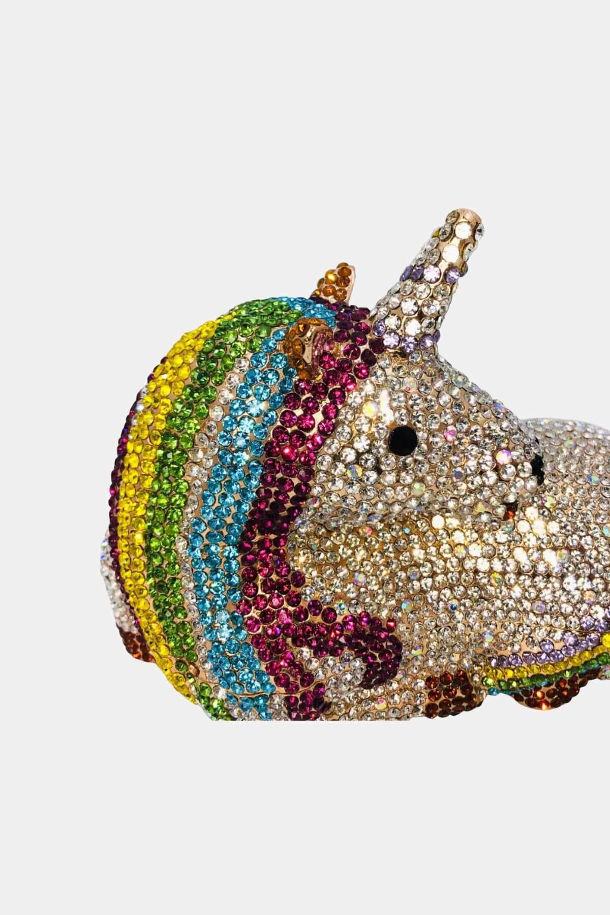 A playful mini handbag shaped like a unicorn in vibrant multicolor, featuring a golden interior and a chic gold chain strap — the perfect whimsical accessory to brighten any outfit.