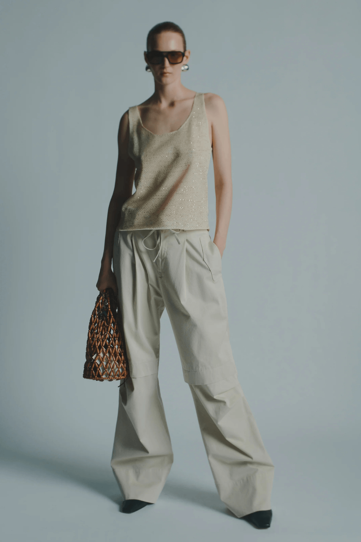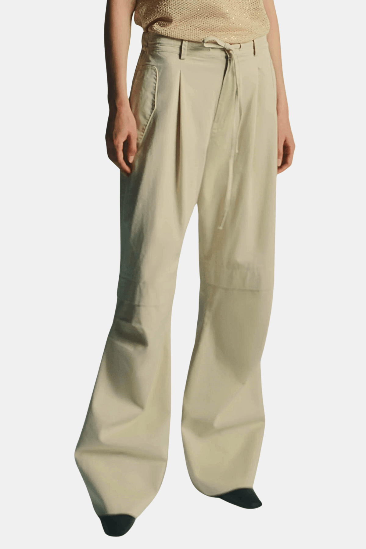 Relaxed trousers crafted in structured gabardine with a modern, effortless feel. Designed with a mid-rise waist and a wide-leg silhouette, they feature front pleats for added volume and movement. Finished with a drawstring waistband for adjustable comfort and subtle carpenter-inspired details for a refined utility look.