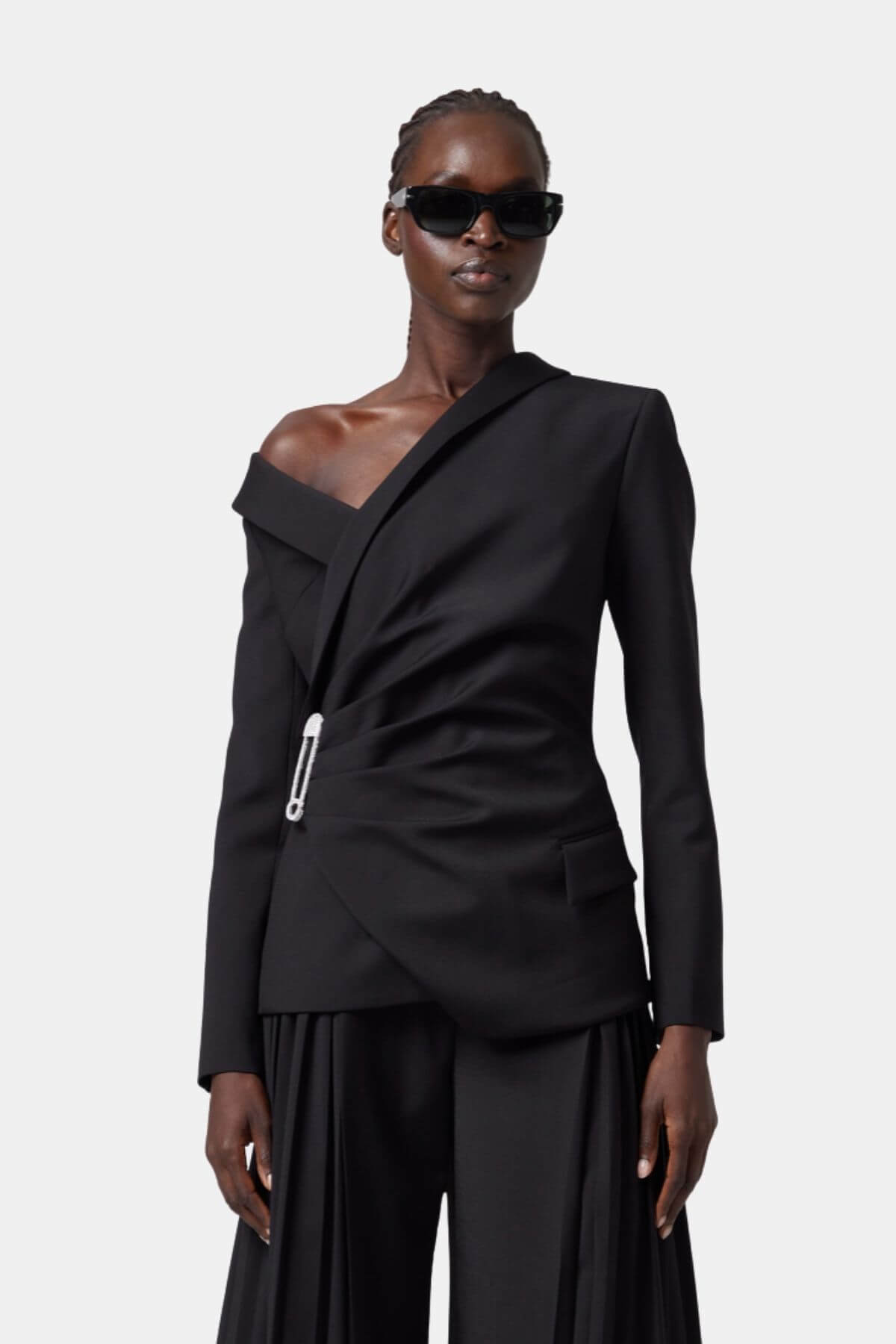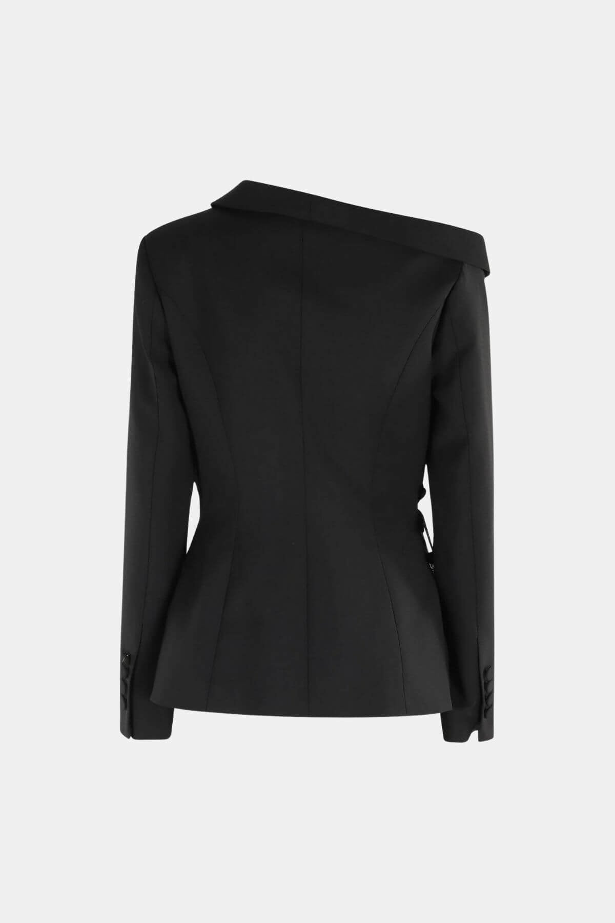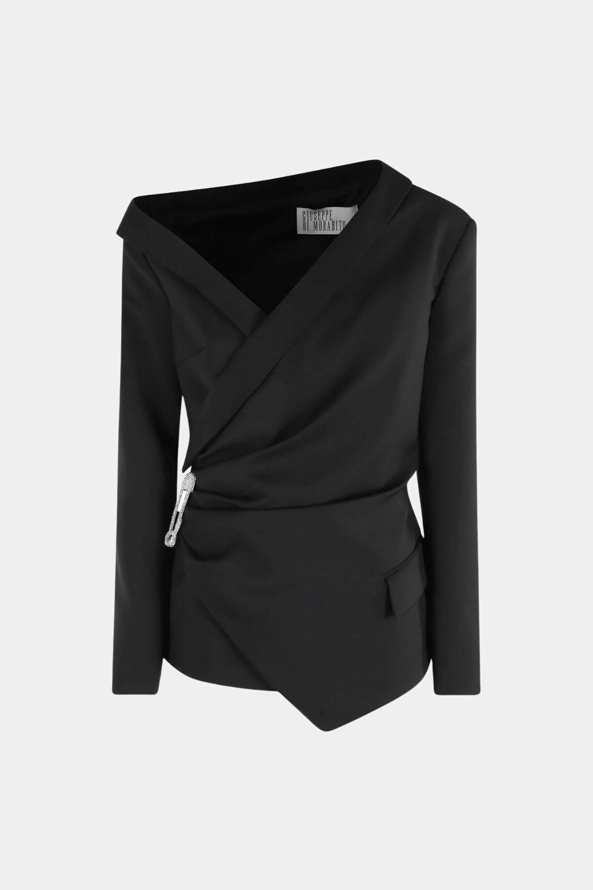 Showcasing an asymmetrical collar and a striking decorative pin closure, this jet black jacket offers a slim fit with a long-sleeve silhouette. Its minimalist yet avant-garde design elevates any formal, evening, or party ensemble with a bold architectural statement.