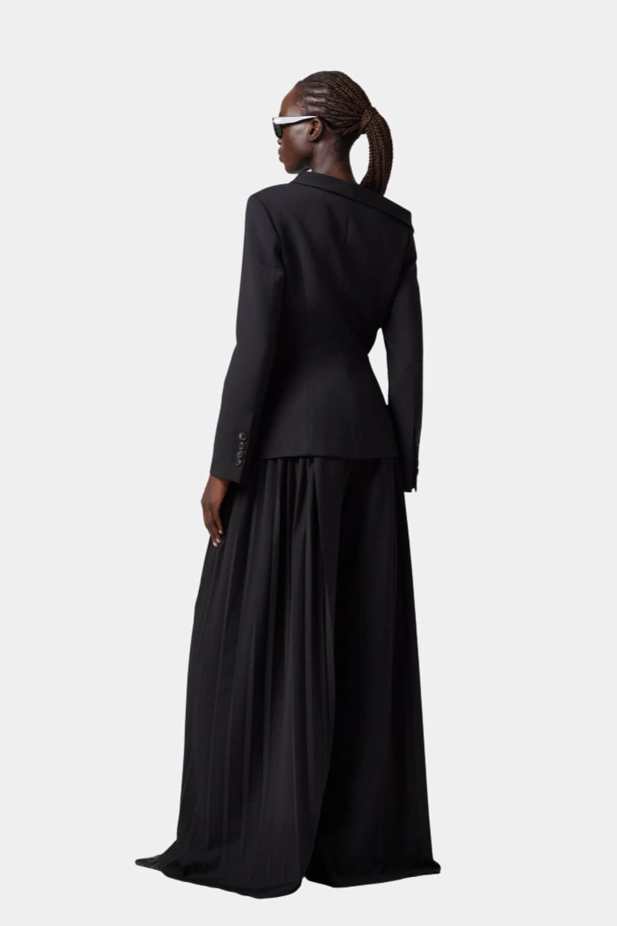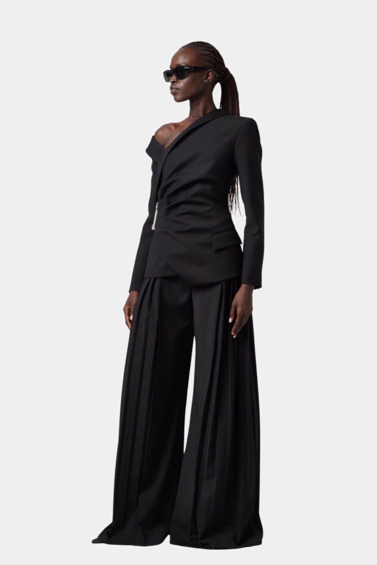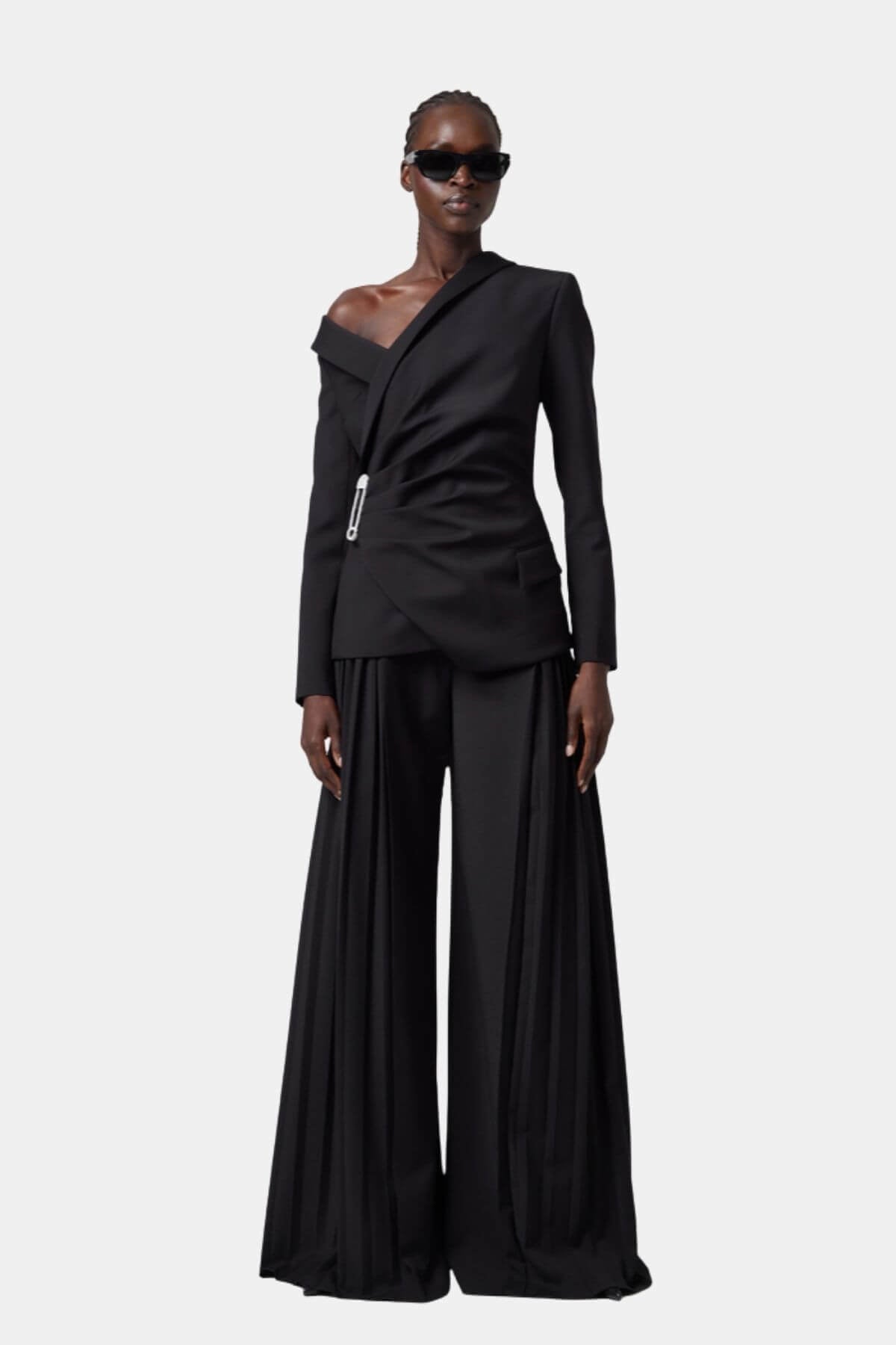 Showcasing an asymmetrical collar and a striking decorative pin closure, this jet black jacket offers a slim fit with a long-sleeve silhouette. Its minimalist yet avant-garde design elevates any formal, evening, or party ensemble with a bold architectural statement.
