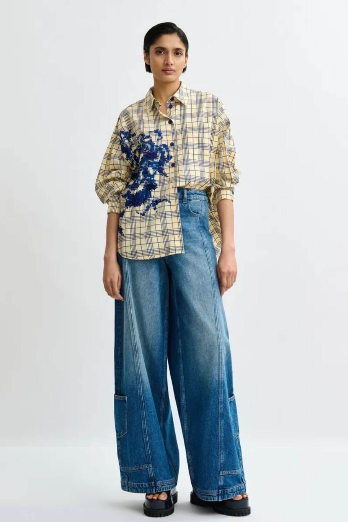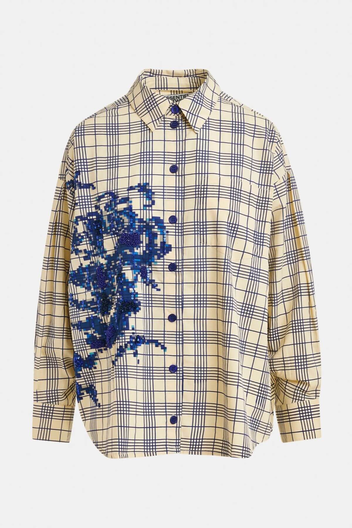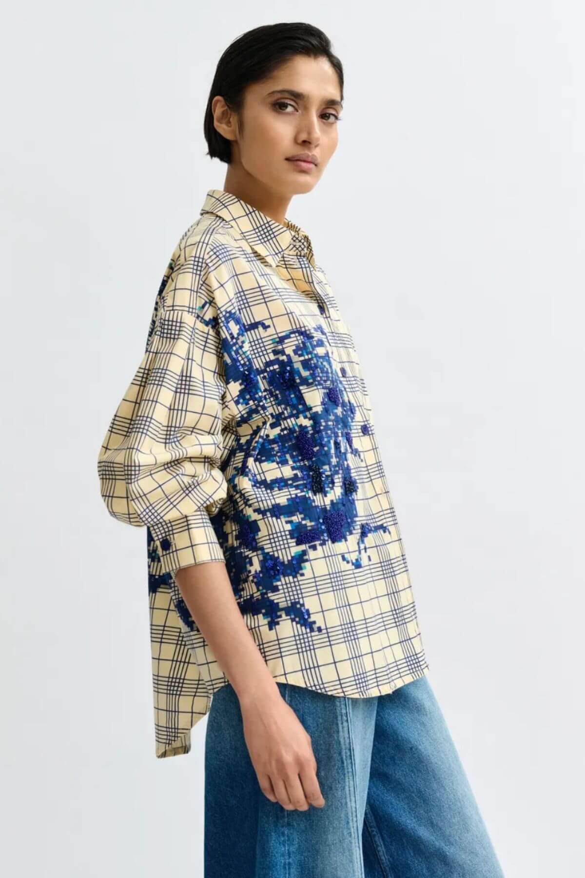 Crafted from 100% cotton, this shirt is cut for an oversized silhouette with dropped shoulders and a curved hem that falls slightly longer at the back. It features a full button fastening and classic pointed collar. A floral motif, embroidered with sequins, rhinestones, and beads, adds dimensional detail.