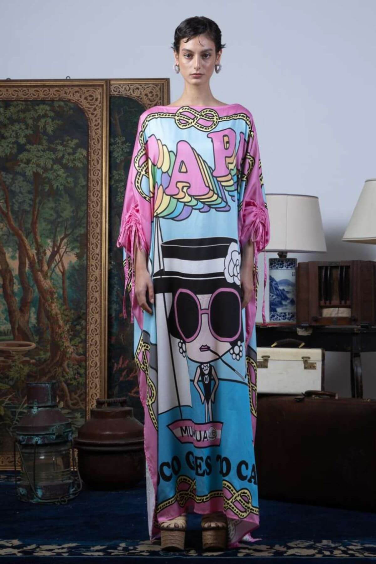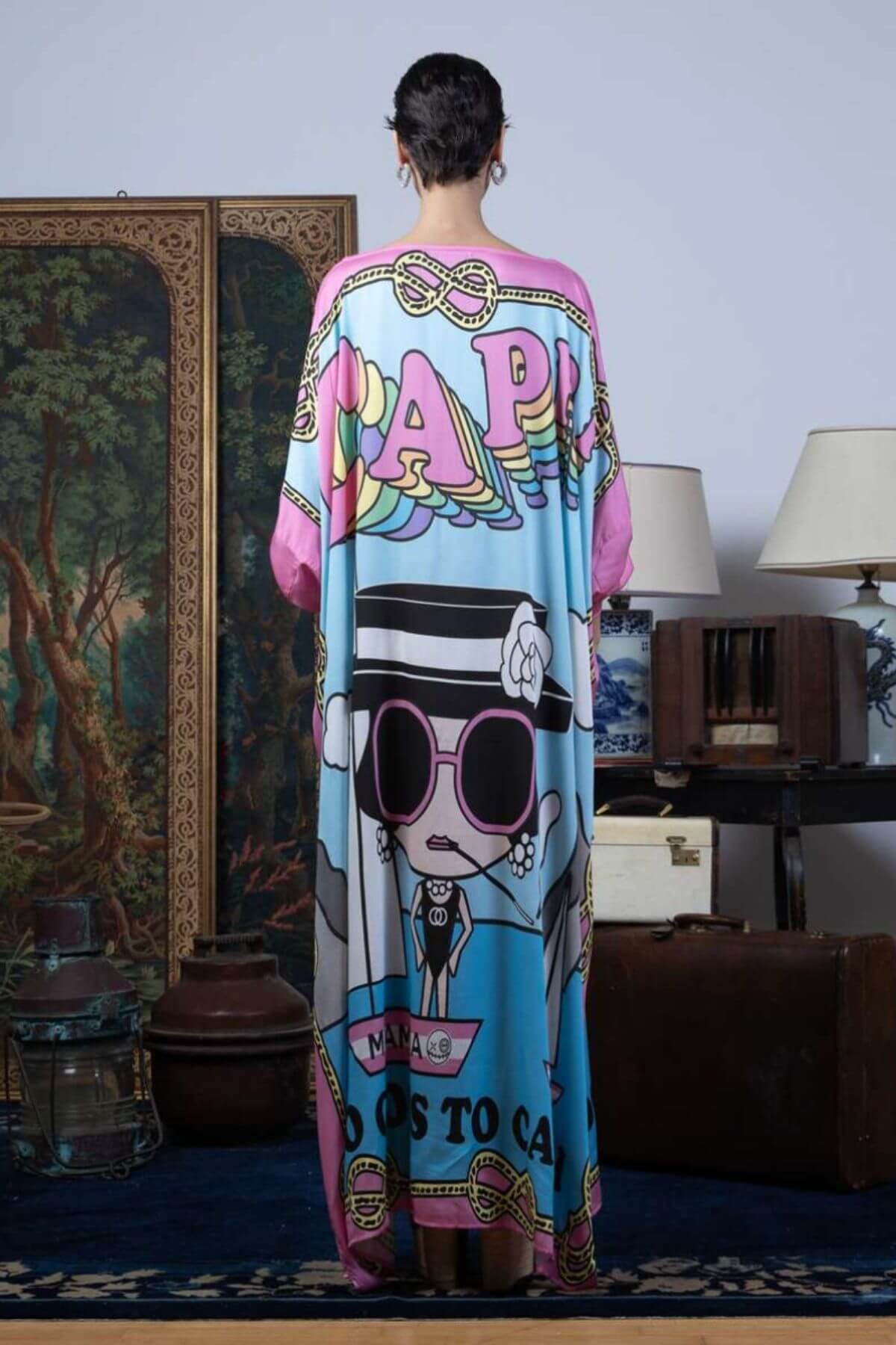 This vibrant kaftan features a bold, playful print with eye-catching colors and graphic details. Designed in a loose, flowing silhouette with wide long sleeves and adjustable ties, it offers both comfort and standout style. Perfect for making a statement at the beach, at home, or on vacation.