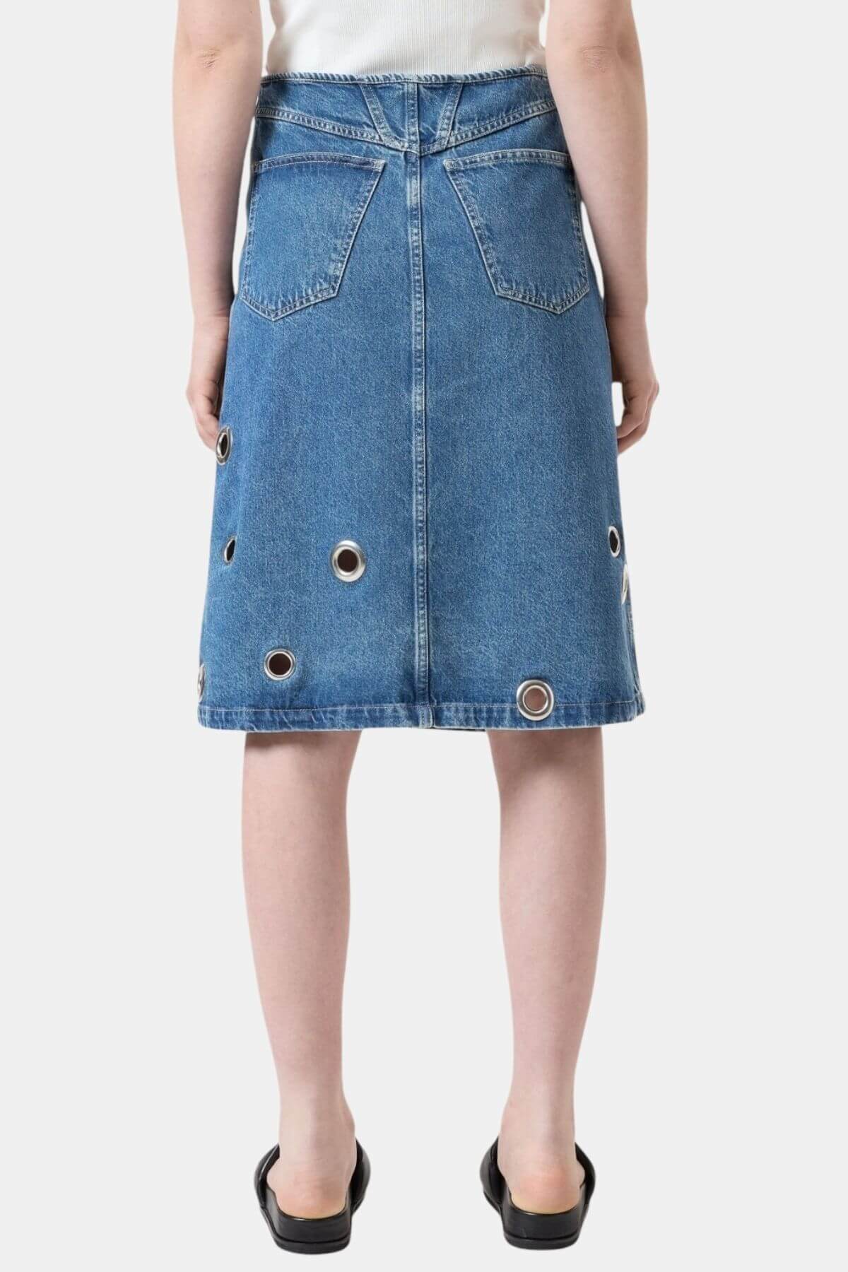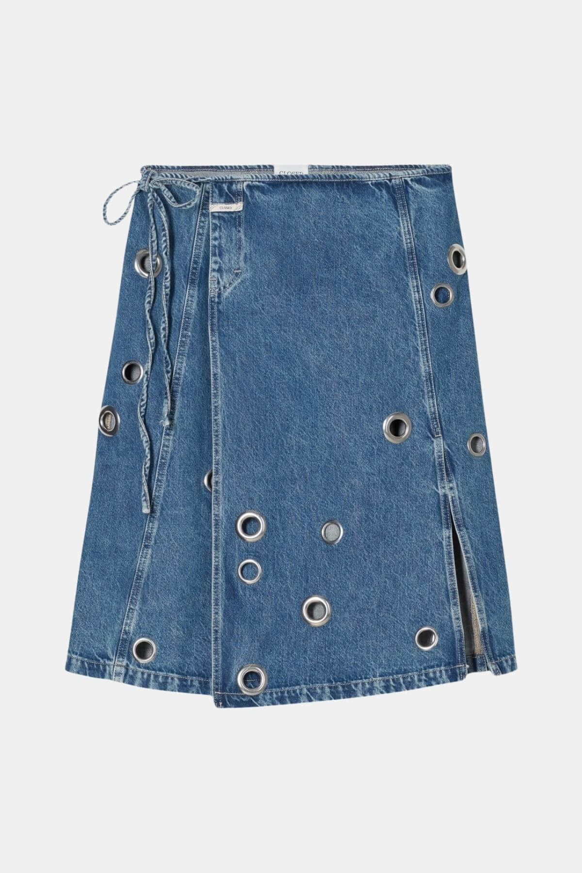 Elevate your personal style with this beautiful Closed midi wrap skirt in mid blue denim. The skirt is made from strong denim (12 oz) and is light wash with destroyed effects, has leg slits and dry feel. It is A BETTER BLUE piece, an eco piece, with regular fit. Made in Italy.