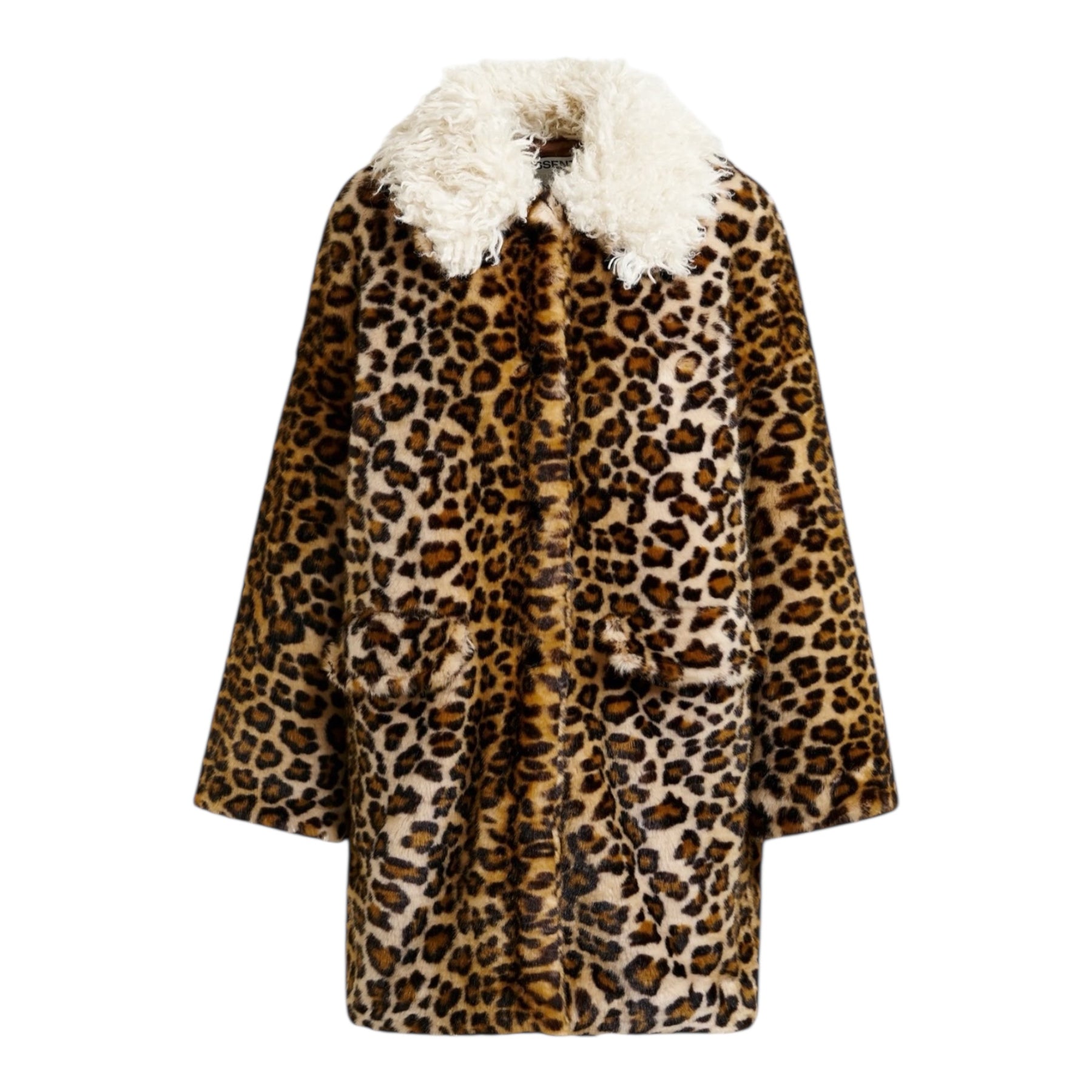 Oversized faux fur coat showcases a striking leopard print, offset by a plush contrasting collar for added texture. Thoughtfully tailored with forward-twisting side seams, it offers a modern silhouette. The padded and quilted thermal lining provides extra warmth, while two flap pockets add functional detail. Finished with a classic front button fastening, it’s a bold yet practical outerwear piece.